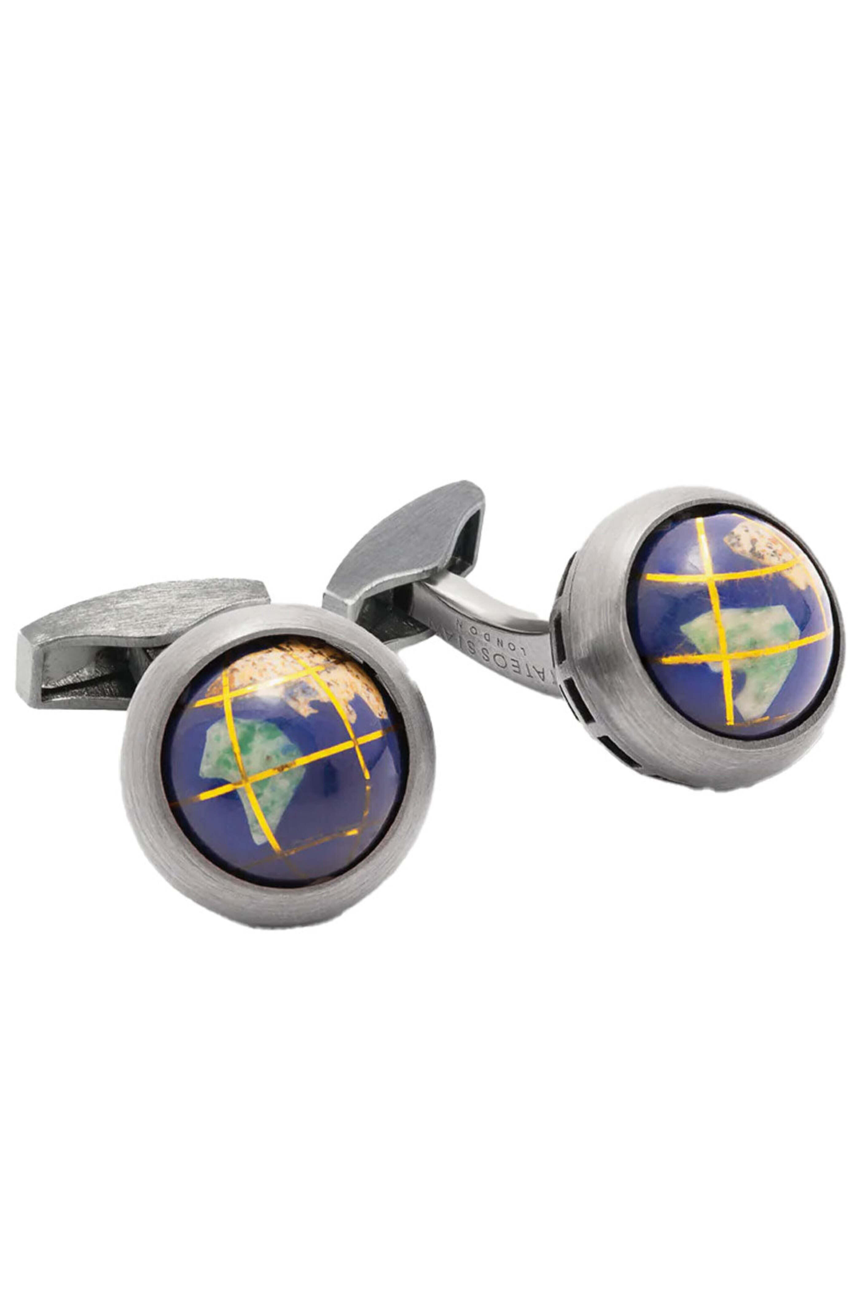Sterling Silver. Black rhodium. Blue lapis. Globe design. Spin the globe by touch to add movement to your sleeve and see countries in miniature pass by. Lapis Lazuli is strongly associated with power, wisdom, and truth. Whale back closure. 15mm L x 15mm H x 13mm W.