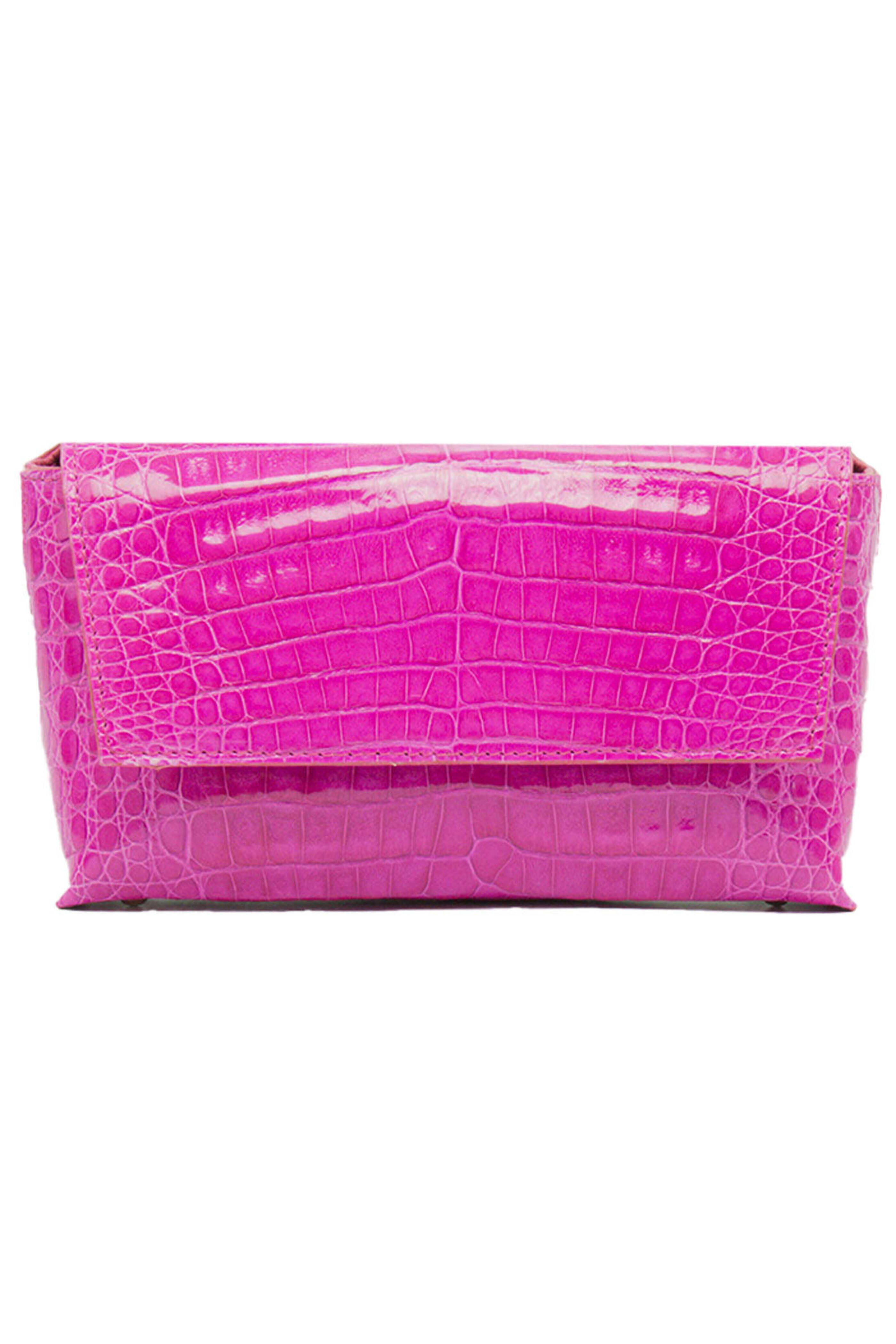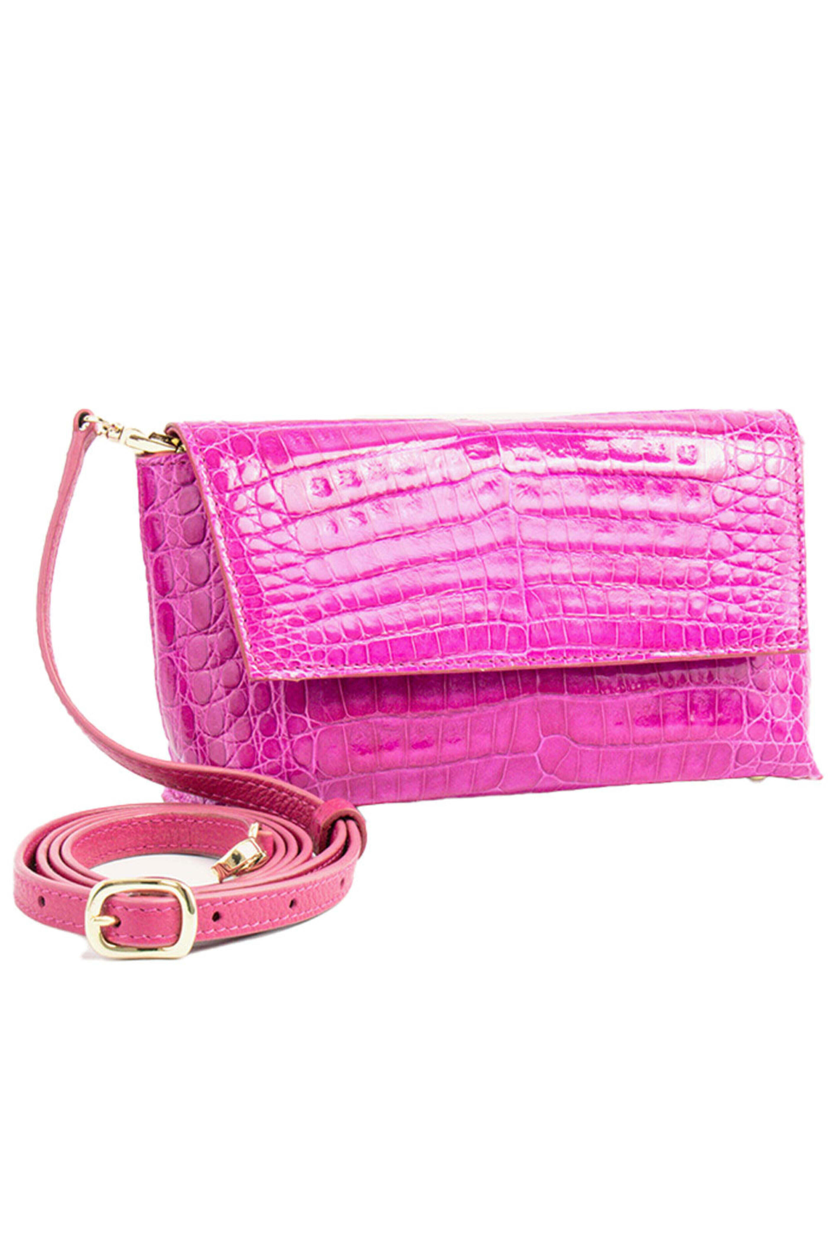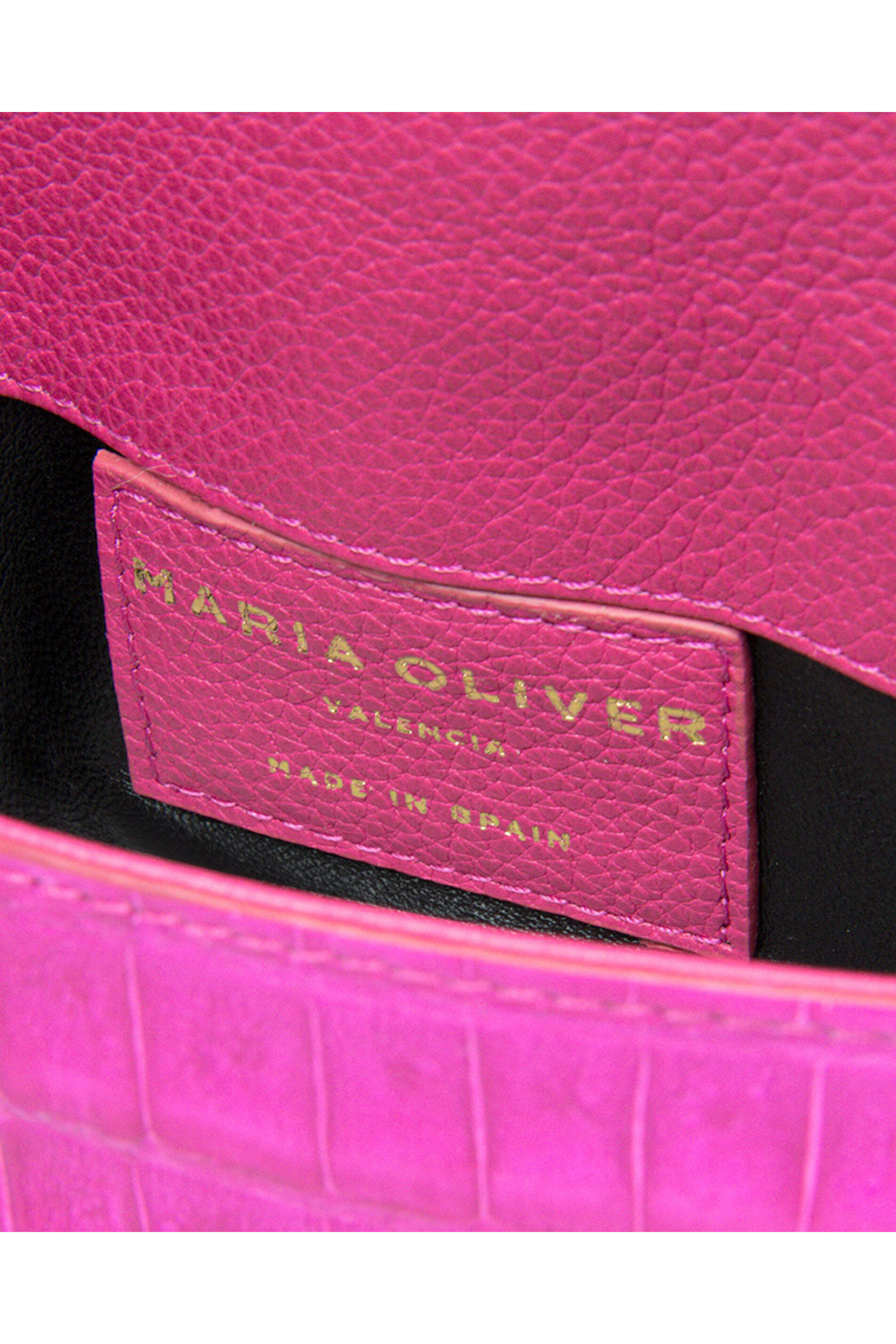 Maria Oliver Malala Clutch in Pink. Flap top with magnetic closure. Detachable adjustable crossbody strap. Crocodile outer. Leather lining. 7.48 W X 4.33 H X 1.97 D. 47.24 strap length. Made in Spain.