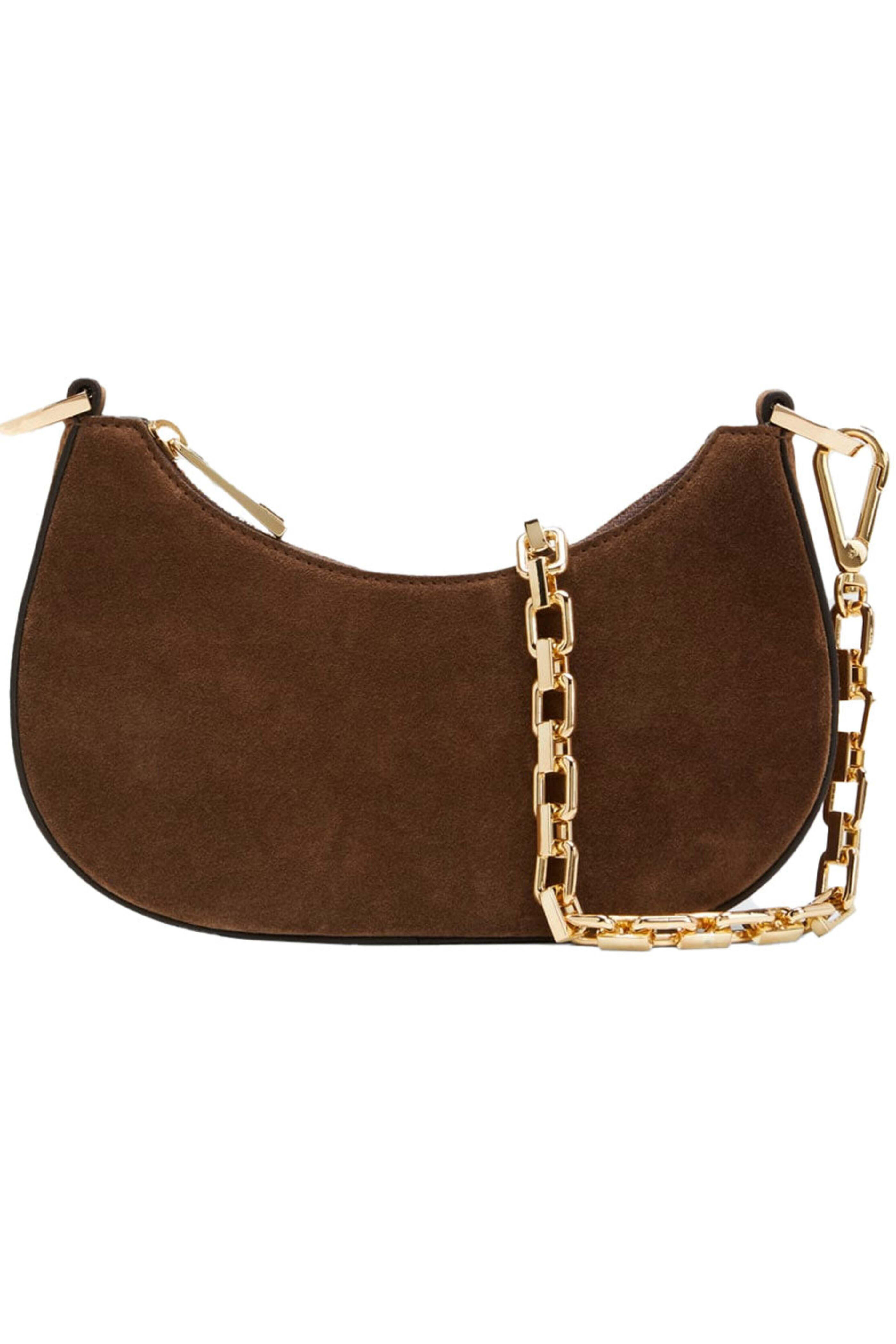 Maria Oliver Small Mia Bag in Brown. Zip top closure. Detachable gold tone chain strap. Removable adjustable leather crossbody strap. Interior slip pocket. Suede and calf leather. Leather lining. 9 W X 5 H X 2 D. Made in Spain.