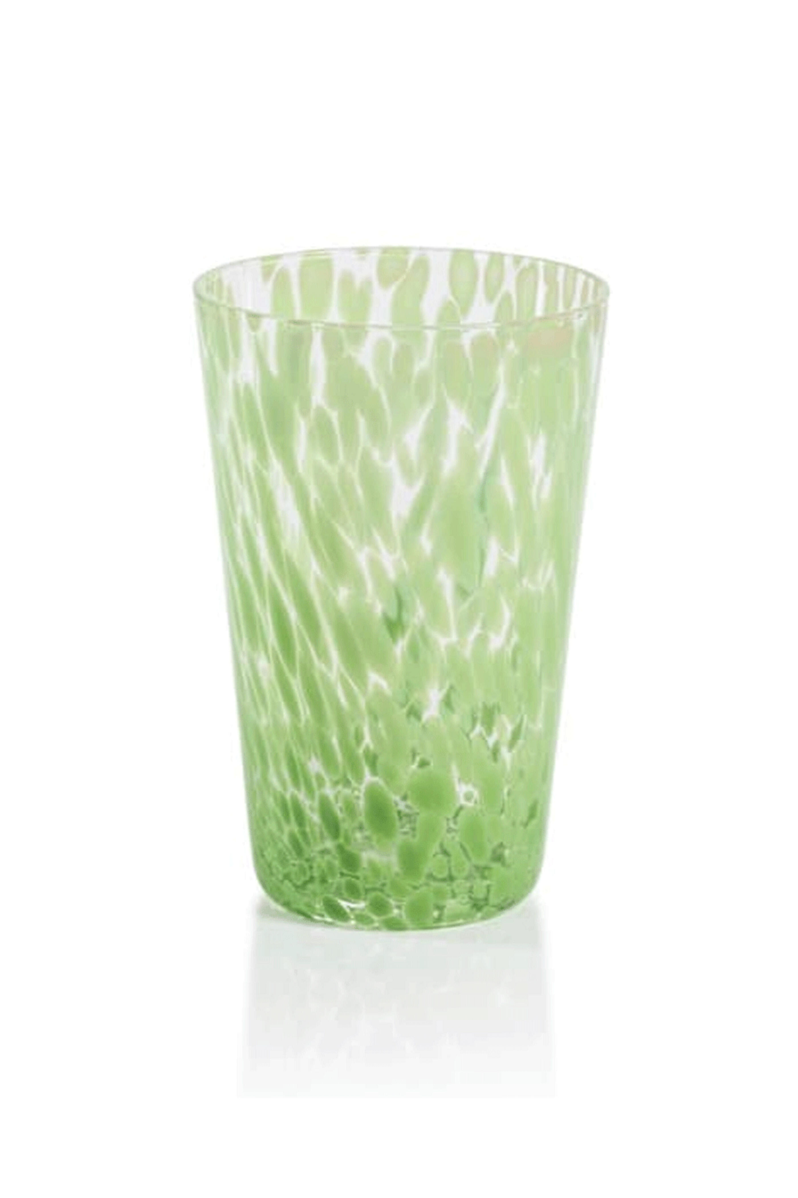 Zodax Gigi Speckled Highball Glass in Green. Green speckled pattern. 25dia x 5.5H. 475ml/16.06oz. Dishwasher safe.