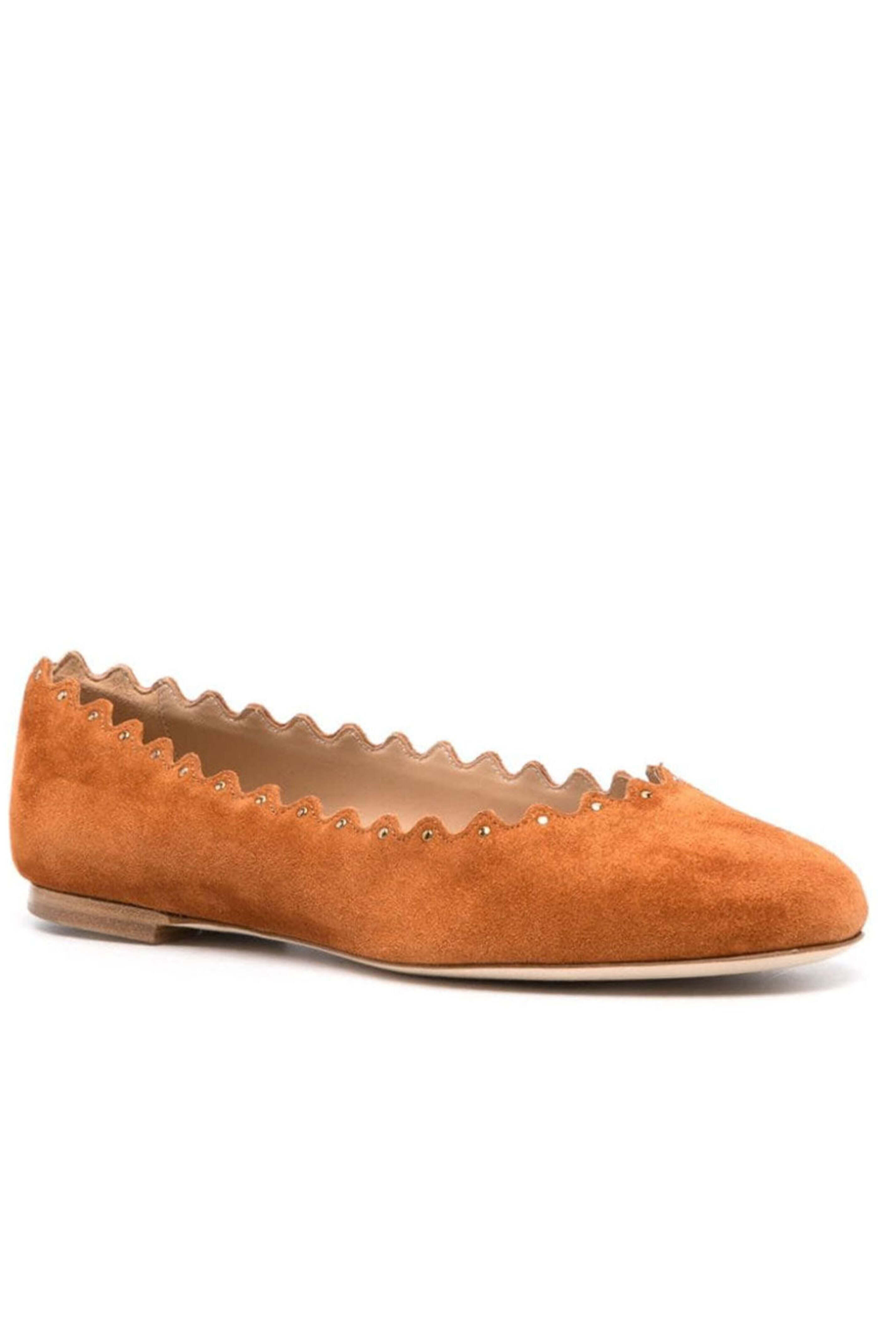 Chloe Lauren Ballet Flat in Ochre Delight. Round toe. Slip on style. Scalloped edging. Gold-tone stud detailing. Suede leather upper. Leather lining and sole. Padded footbed. 0.25 stacked heel. Made in Italy.