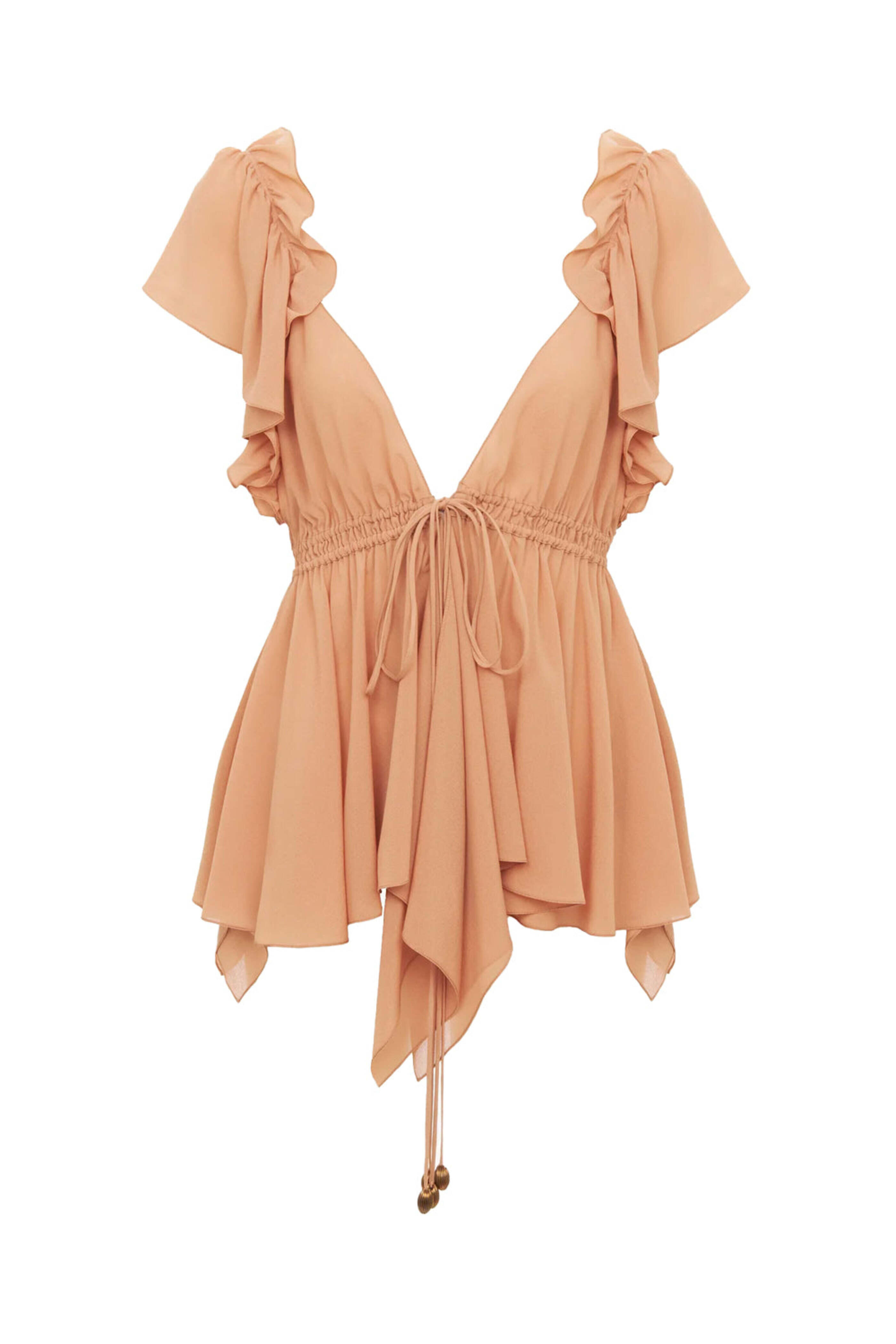 Chloe Cheek Gathered Blouse. Deep v neck. Deep square back. Short flutter sleeves. Drawstring empire waist. Self-tie closure at front. Asymmetrical handkerchief hem. 100% silk.