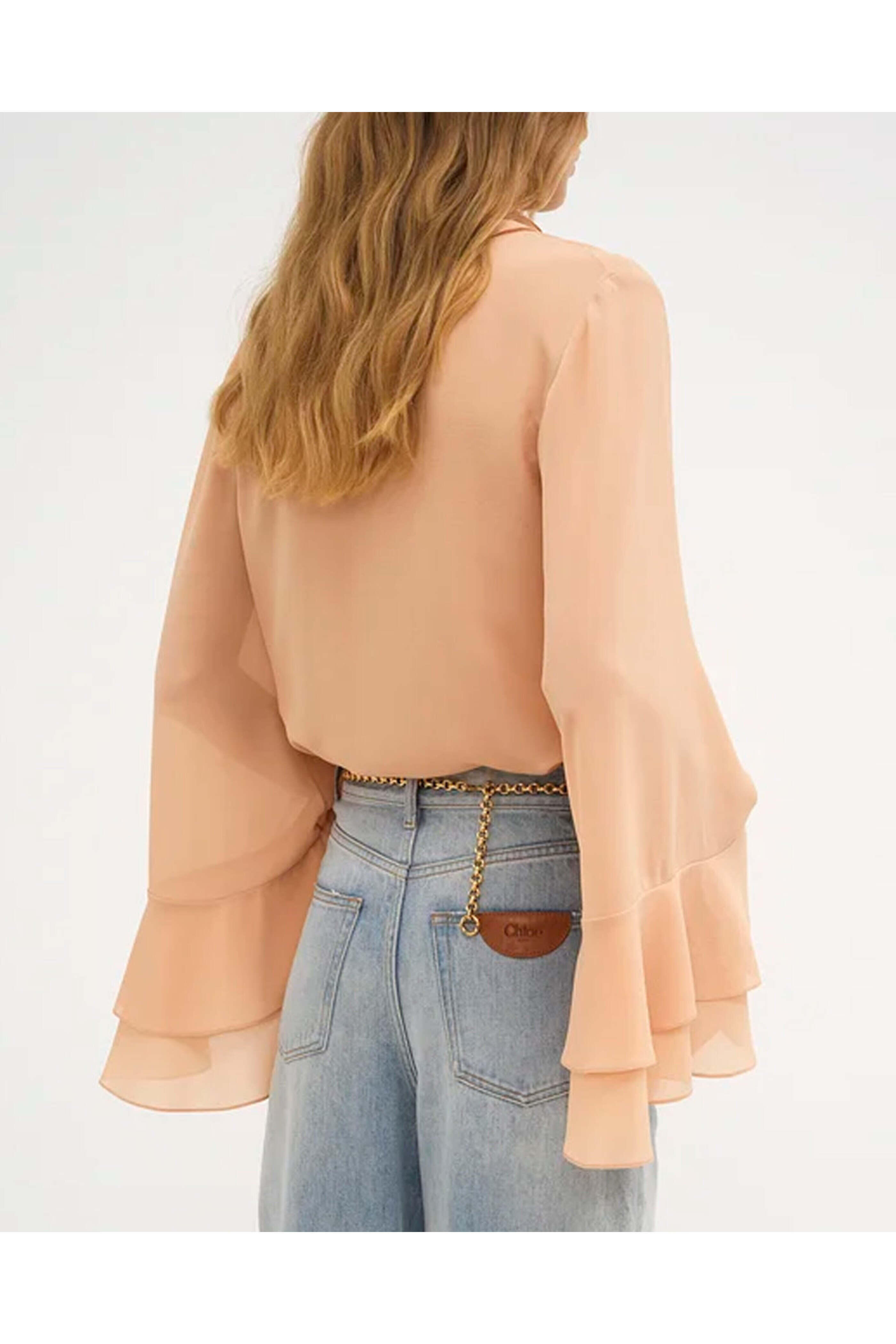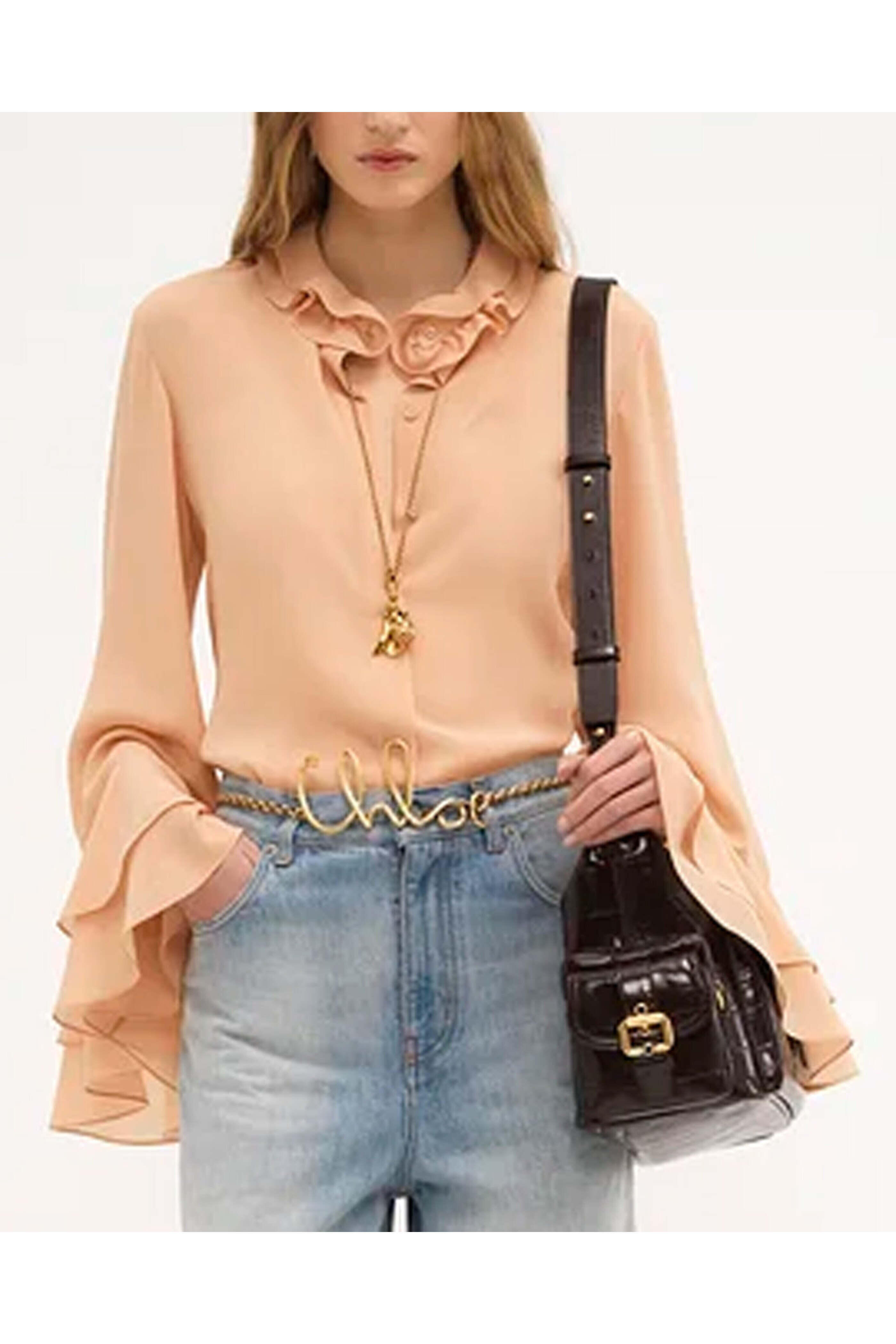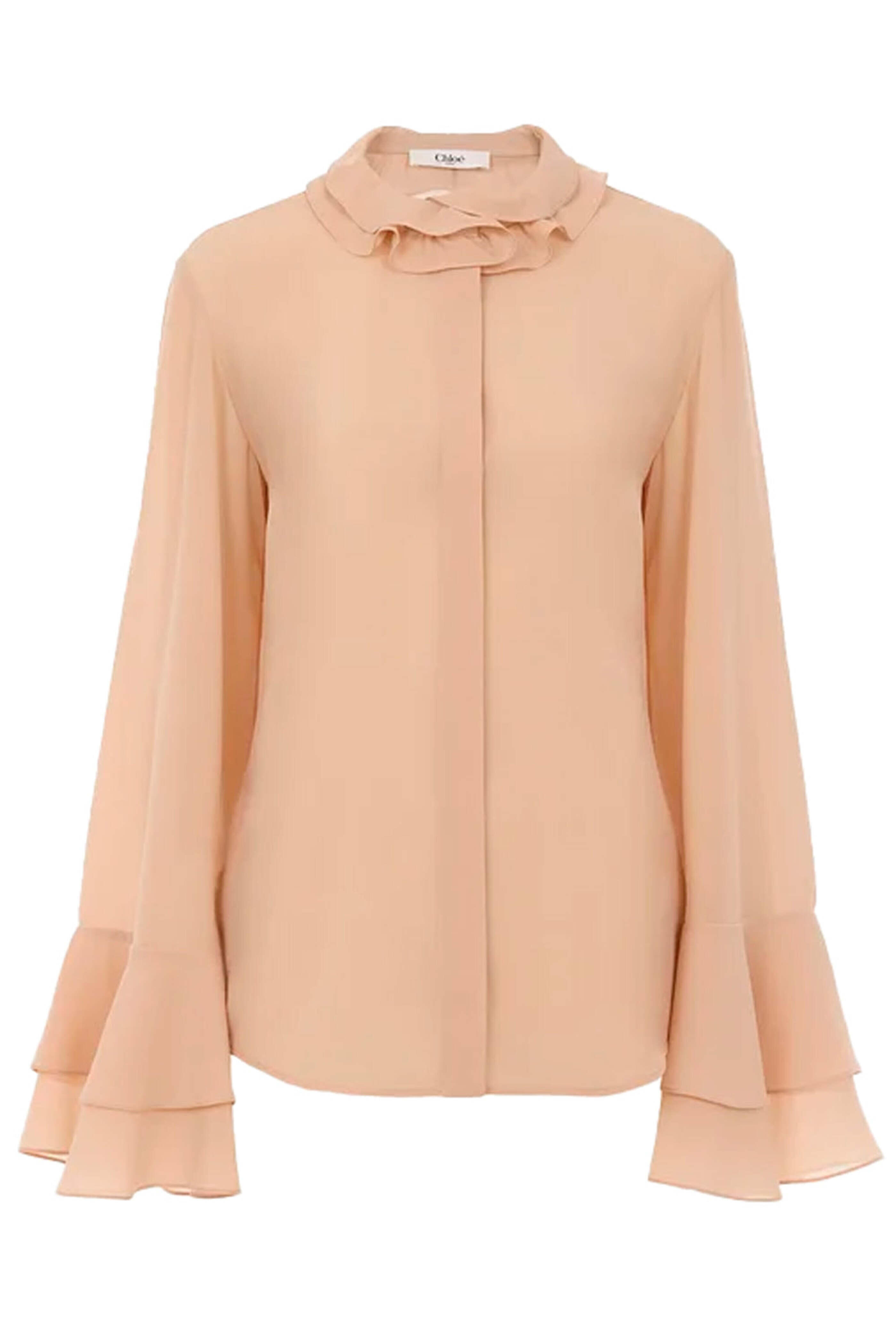Chloe Sand Brown Flare Sleeve Blouse. Round neck; tiered ruffle neck. Long sleeves; tiered ruffle cuffs. Concealed button down front closure. Relaxed fit. Rounded hem. Made in Italy. 100% silk.