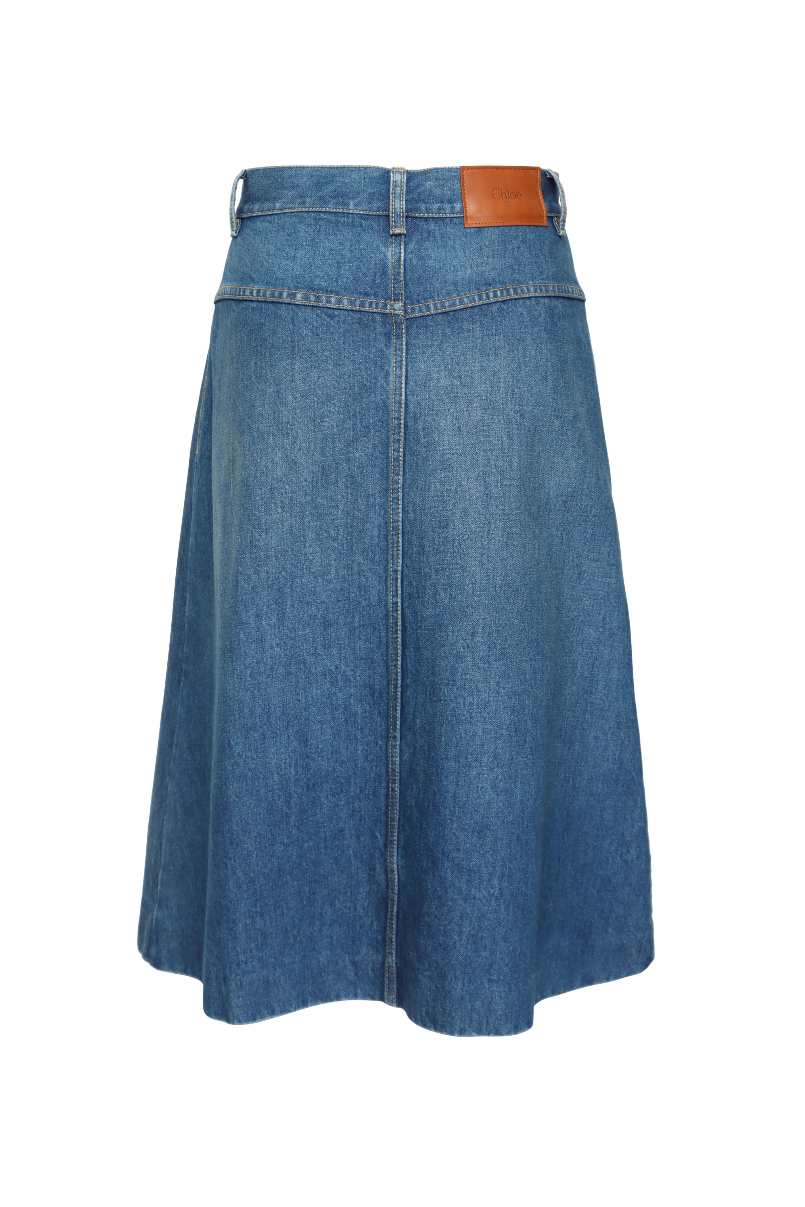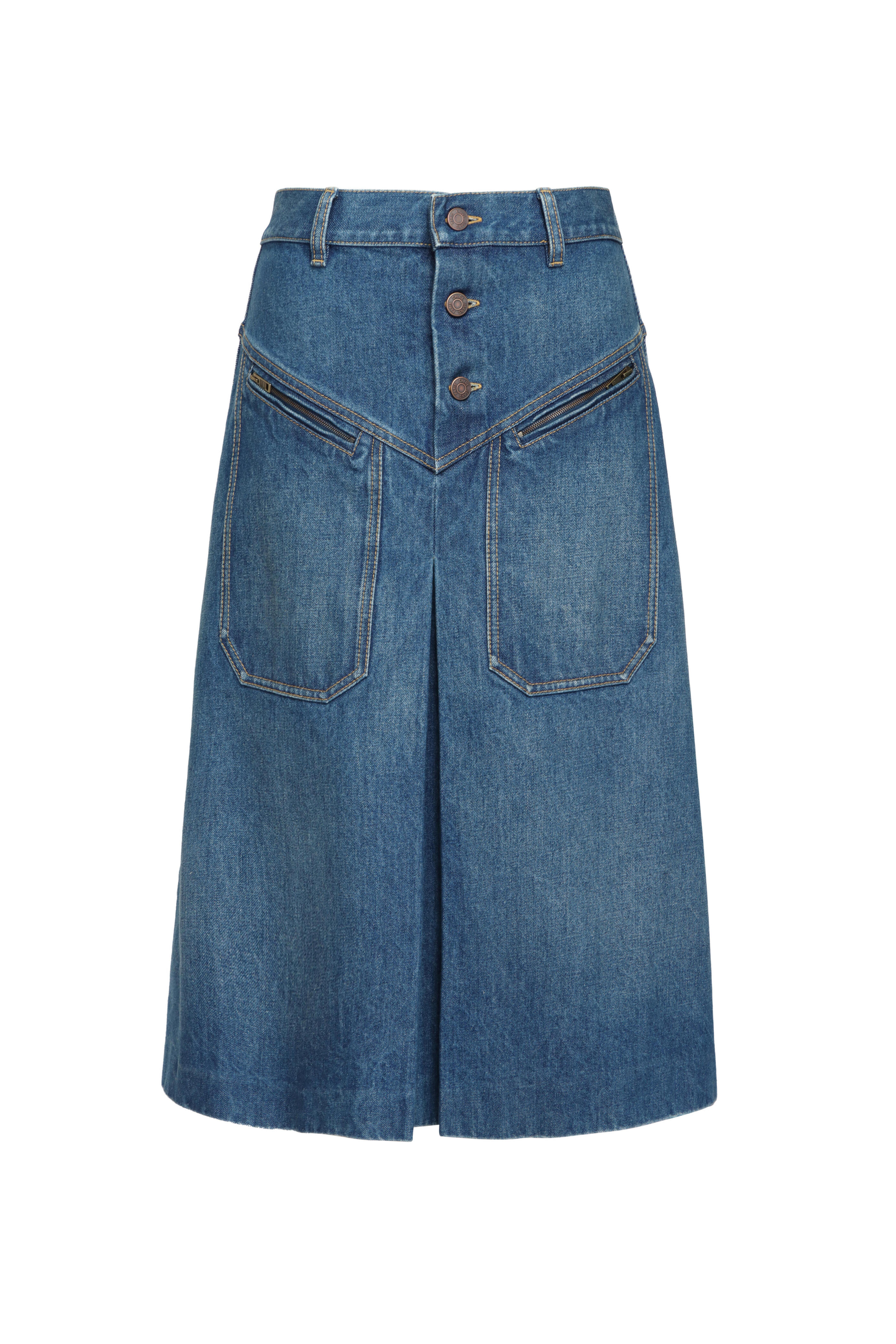 High rise. Button fly closure. Belt loops. Front patch pockets; zip closure. Aline silhouette. Front box pleat detail. Denim fabrication. Imported. Knee length. 100% cotton outer. Machine washable.