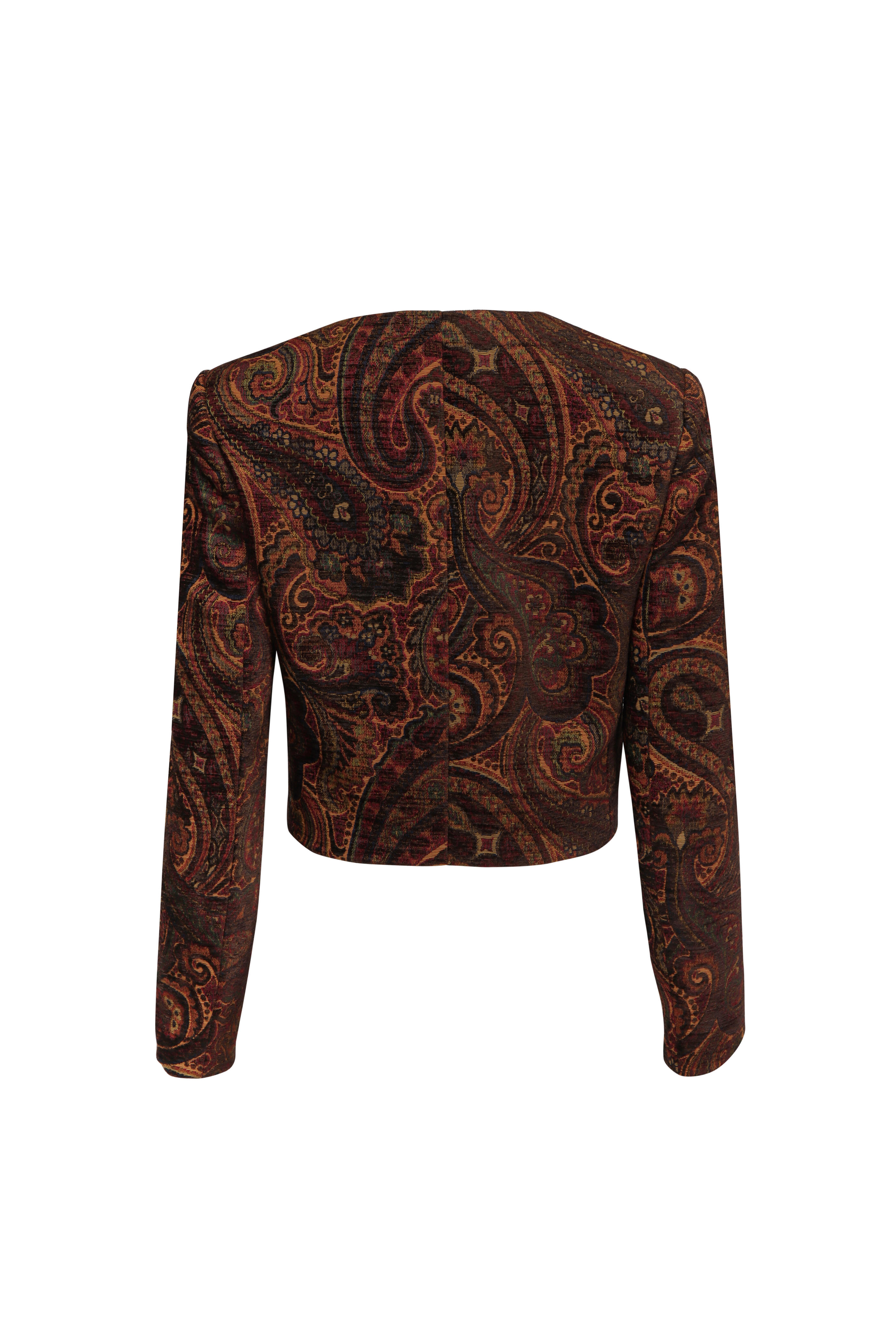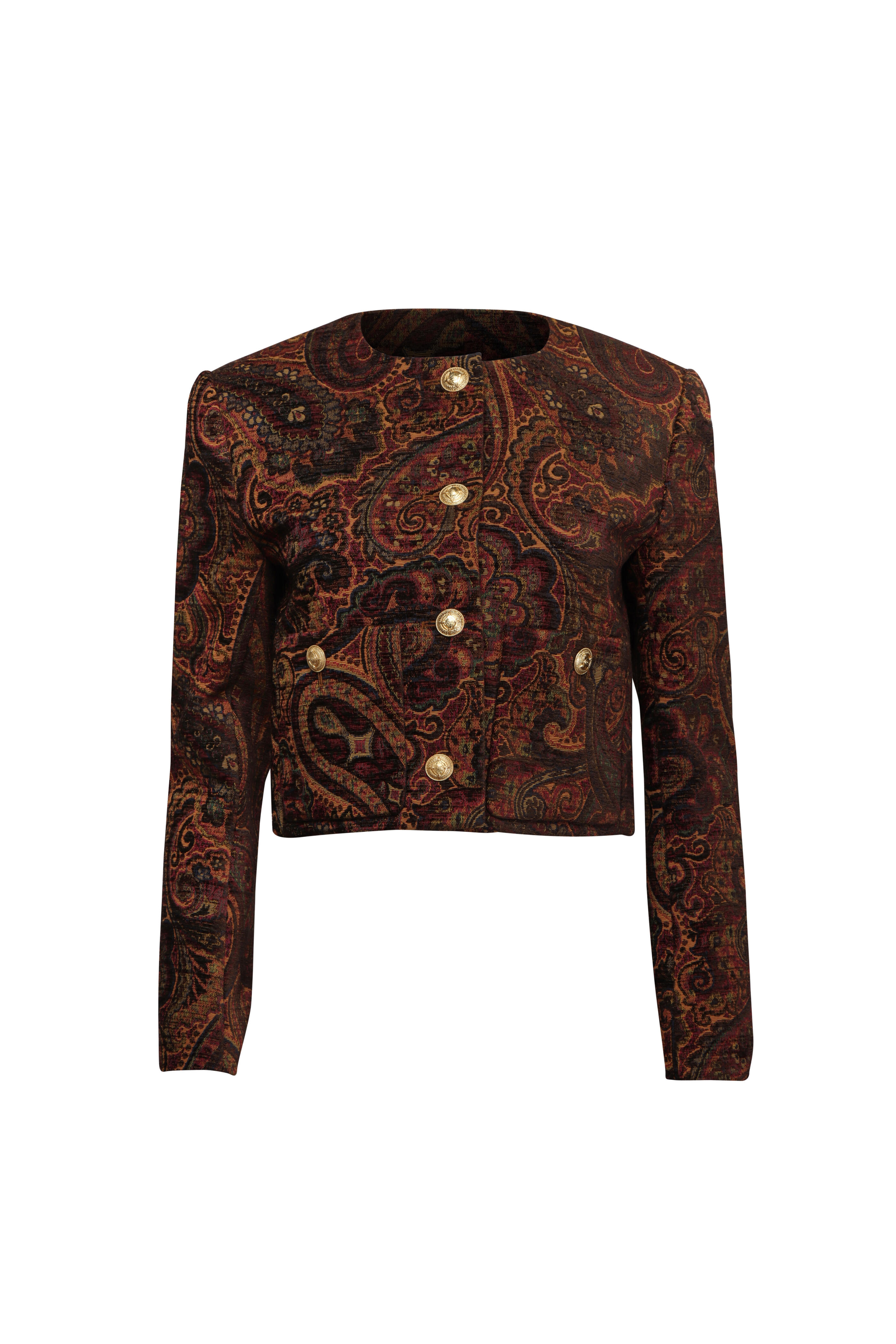 Round neck; collarless. Long sleeves; button cuffs. Button up front closure. Hip patch pockets; button closure. Gold tone statement button detail. Boxy fit. Cropped length. Jacquard tweed fabrication. Imported. 42% viscose, 30% polyester, 28% cotton outer, 62% viscose, 38% cotton lining. Dry clean.
