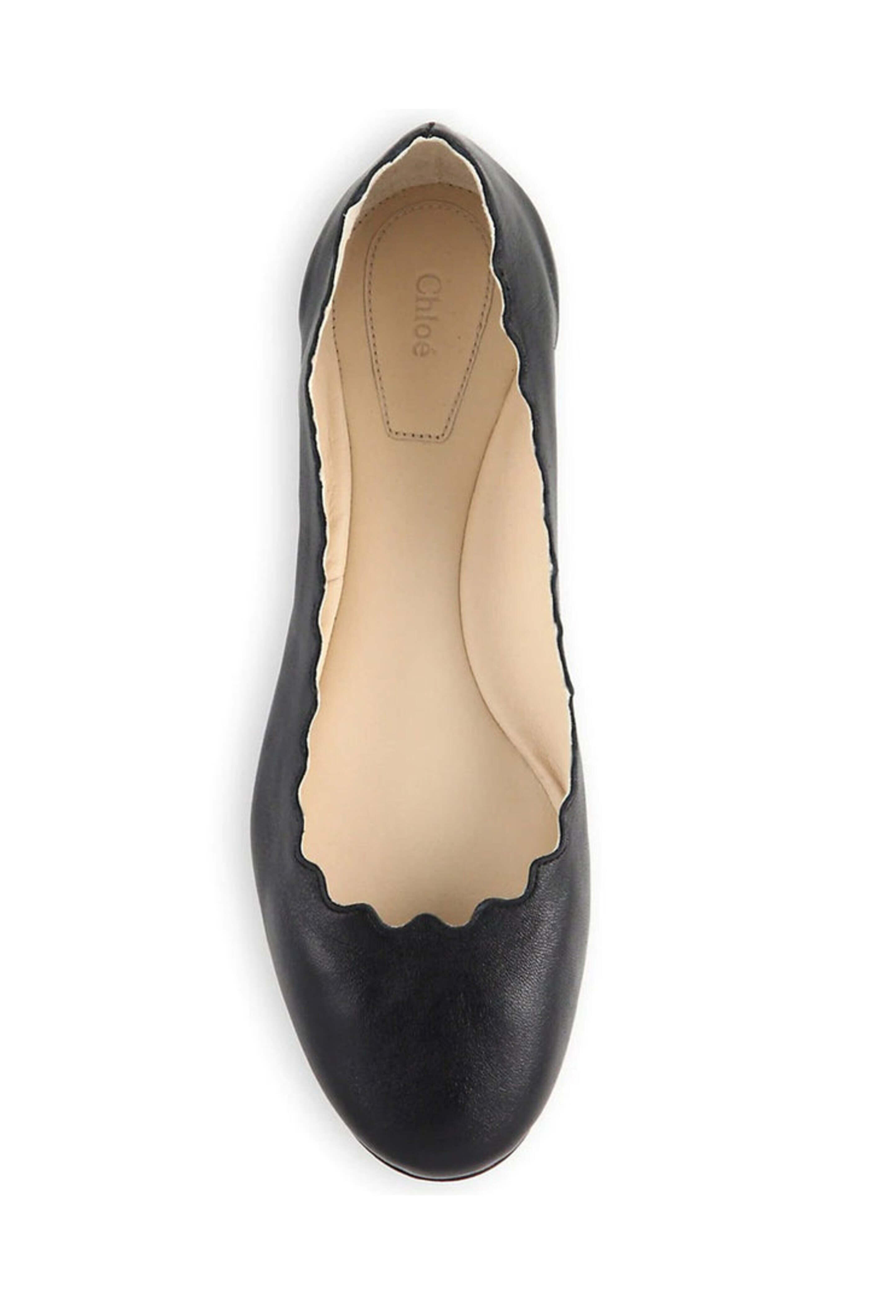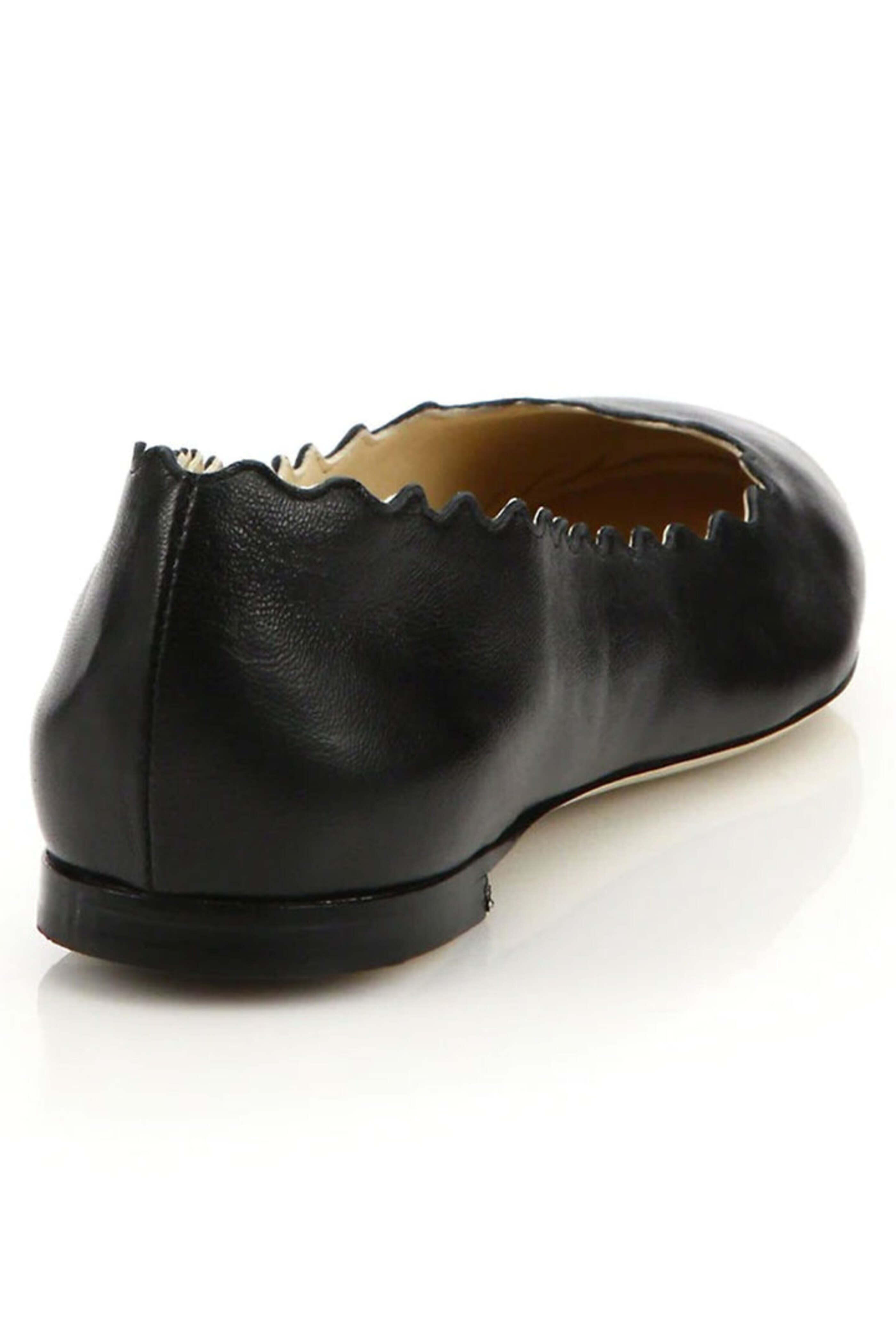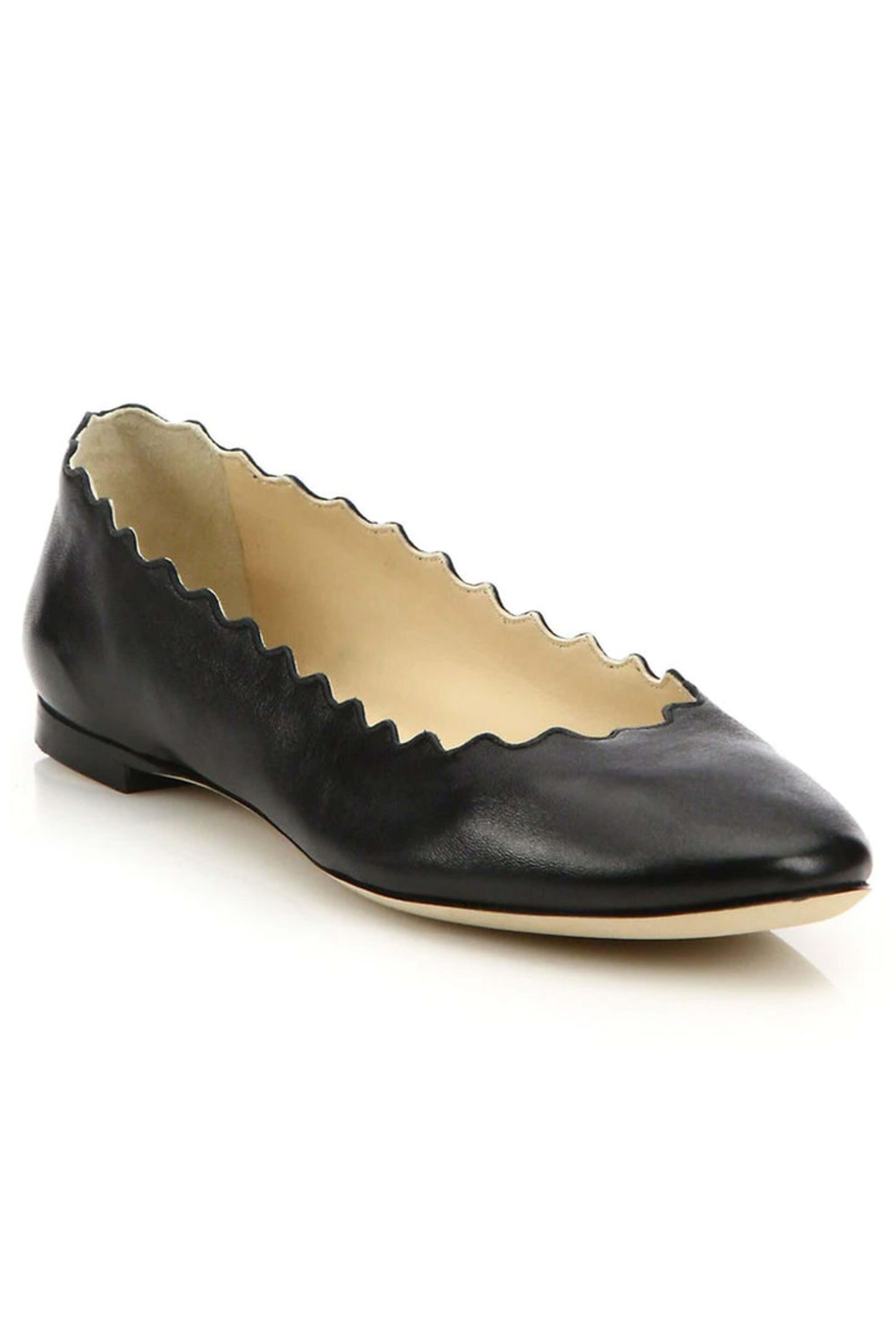 Chloe Lauren Ballet Flat in Black. Round toe. Scalloped edge ballet flat style. Slip on. Padded insole. Leather upper, lining and sole. Made in Italy.