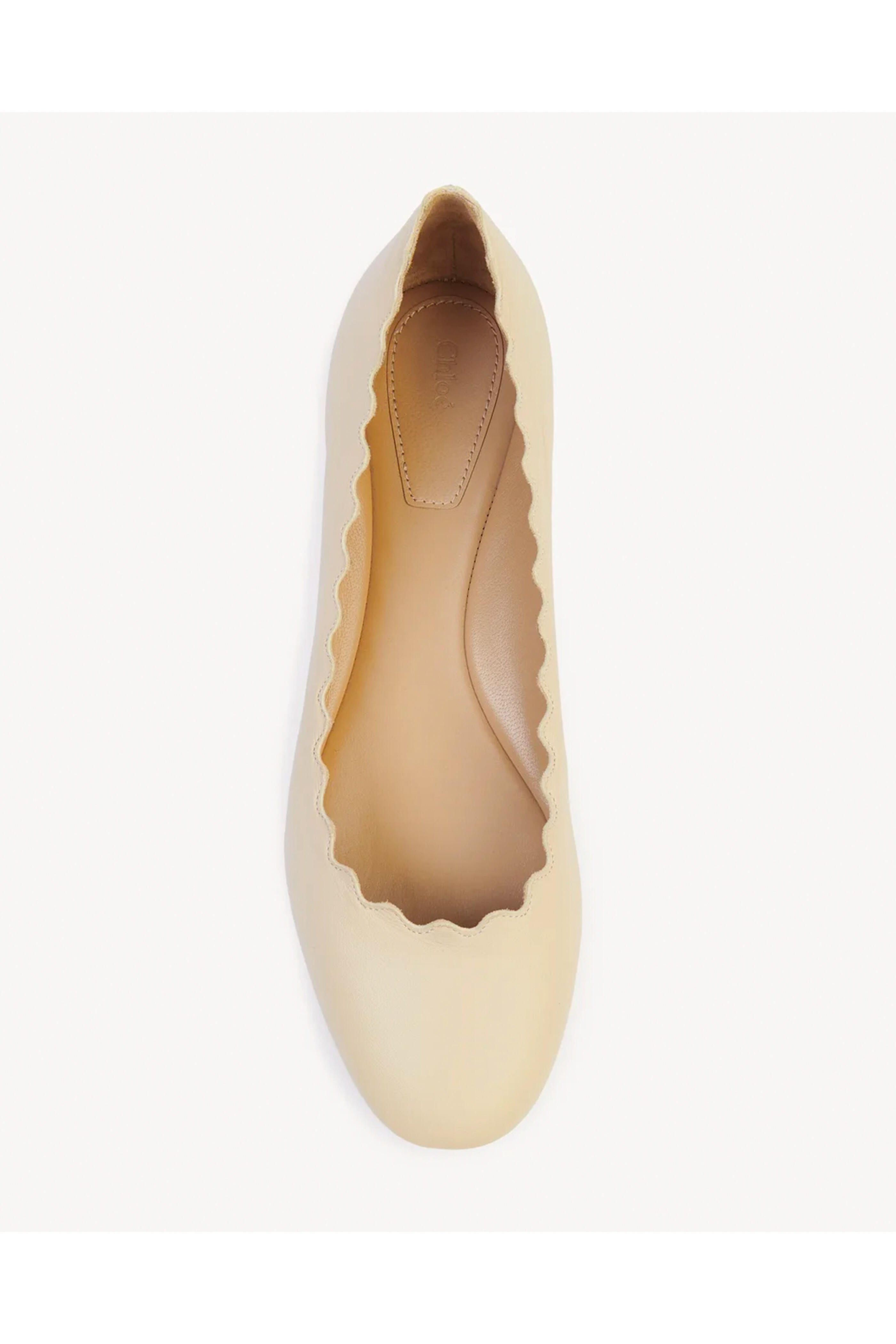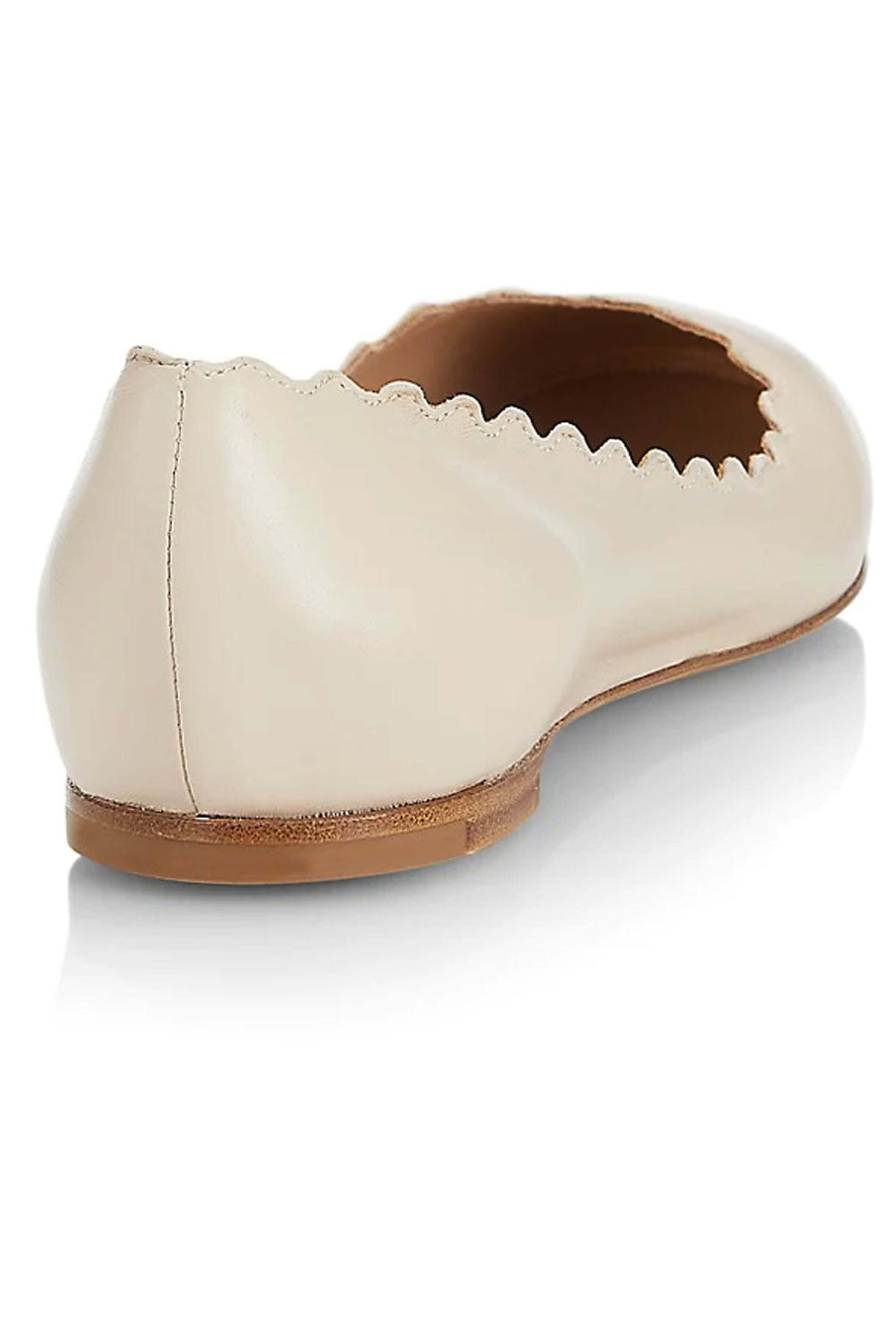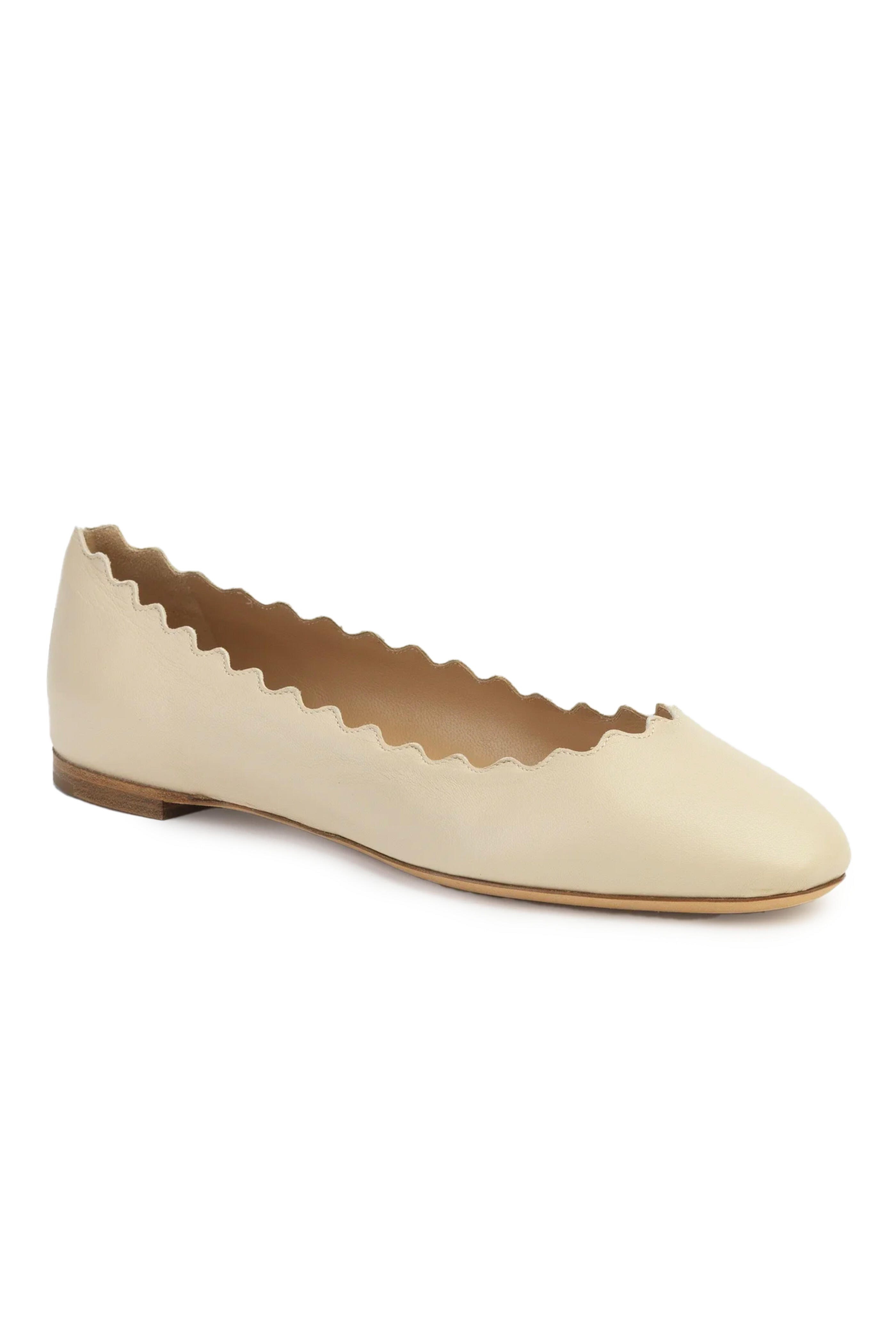 Chloe Lauren Ballet Flat in Pearl Grey. Round Toe. Scalloped edge ballet flat style. Slip on. Padded insole. Upper: Nappa sheepskin. Heel: Stacked calf. Sole: Calfskin. Lining: Goatskin. Made in Italy.