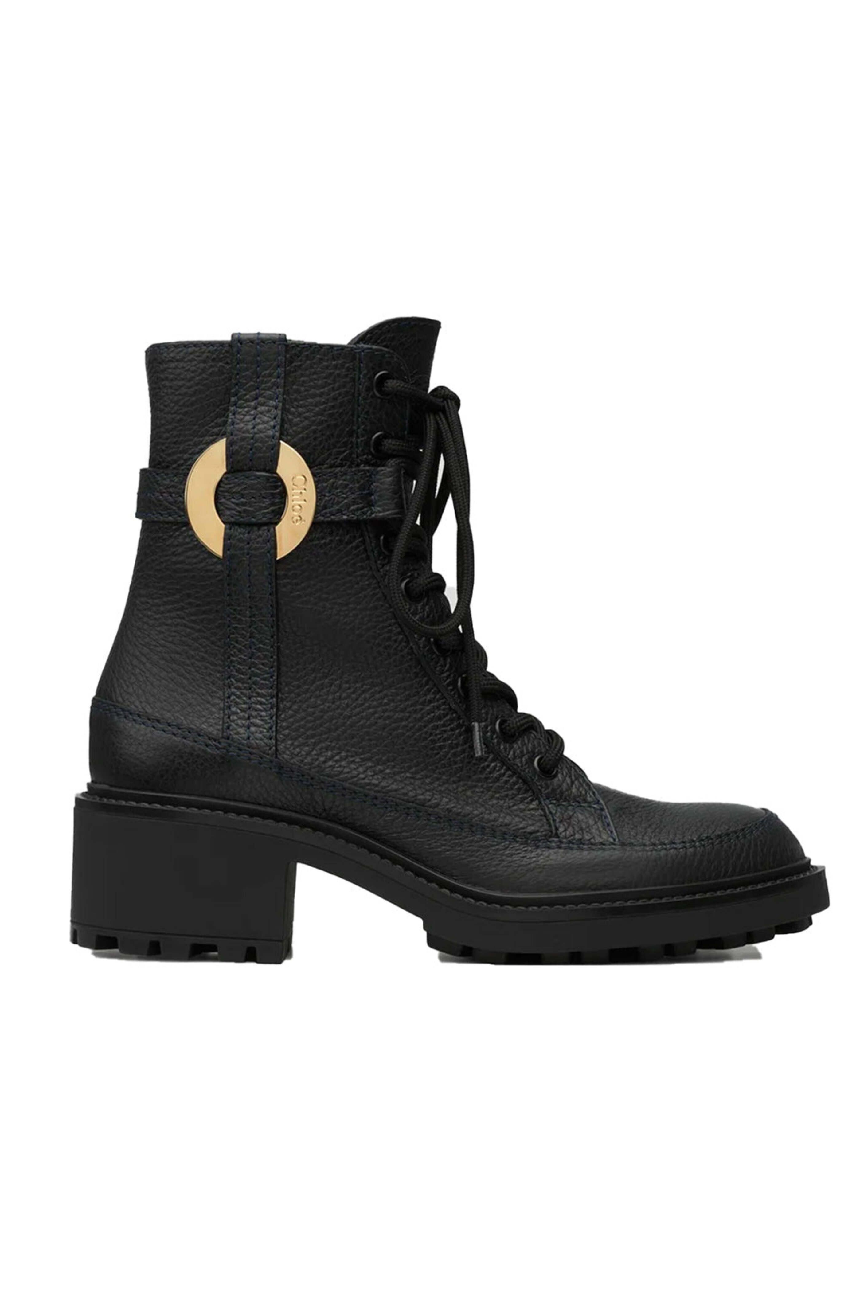 Chloe Black Darryl Lace Up Ankle Boot . Side zip . Lace-up . Gold metal Darryl Signature embellishment . Chunky sole . Heel height: 0.6 (15 mm) . Upper: calfskin . Sole: Rubber . Lining: 93% calfskin, 7% goatskin.