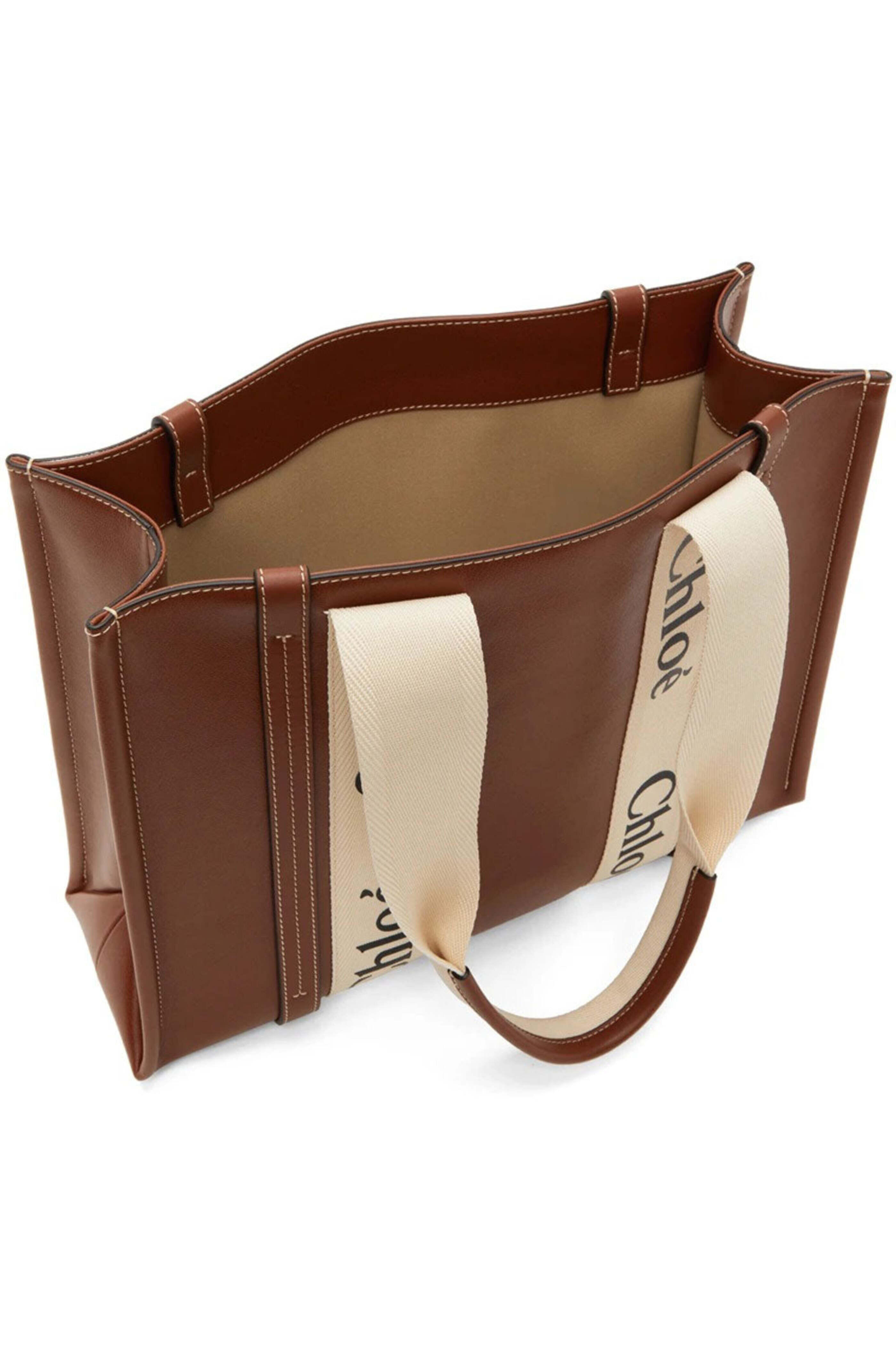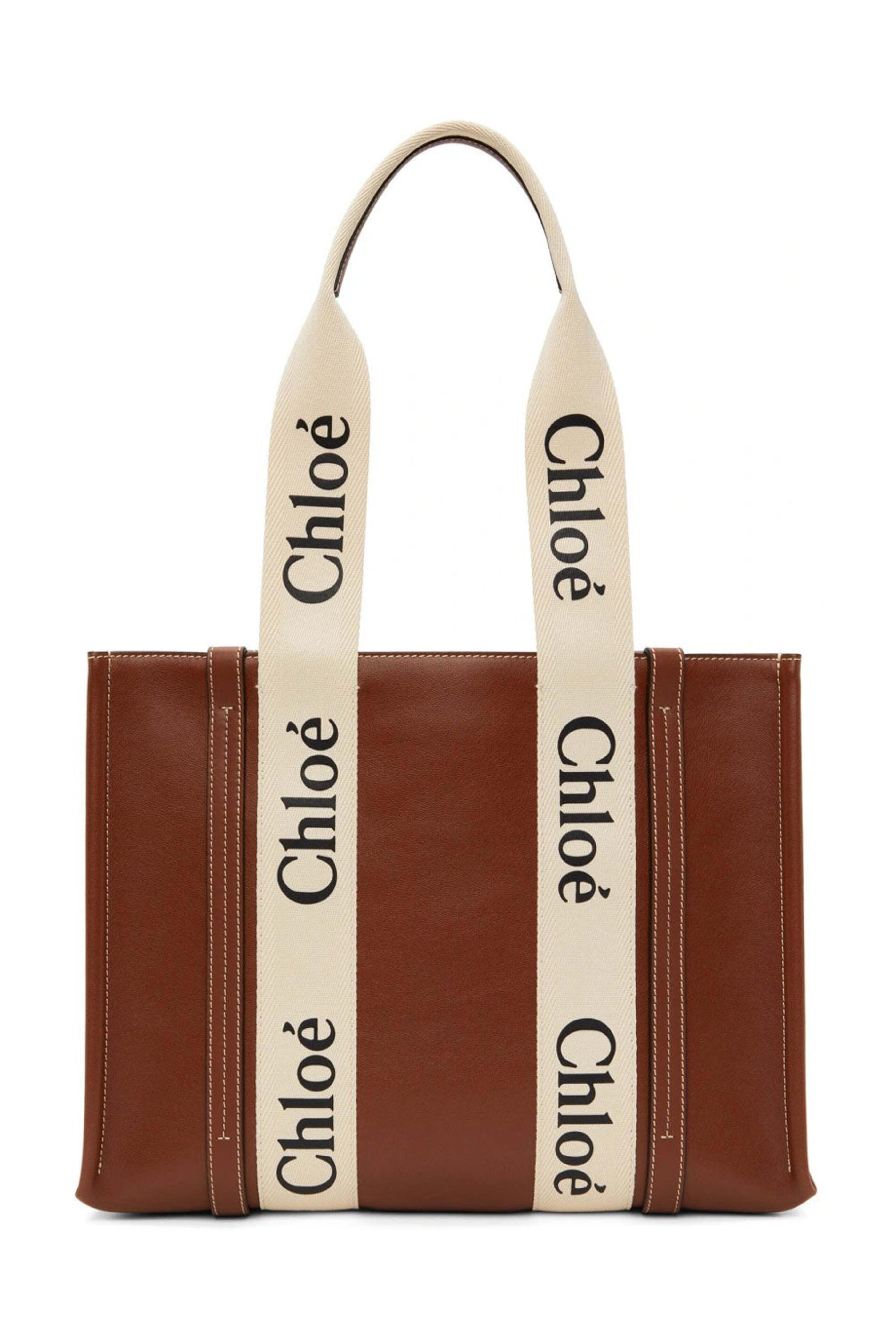 - Chloe Sepia Brown Woody Small Tote Leather tote Open top 10 handle drop Fabric lined interior One flat pocket 14 W X 11.25 T X 5 D Made in Italy