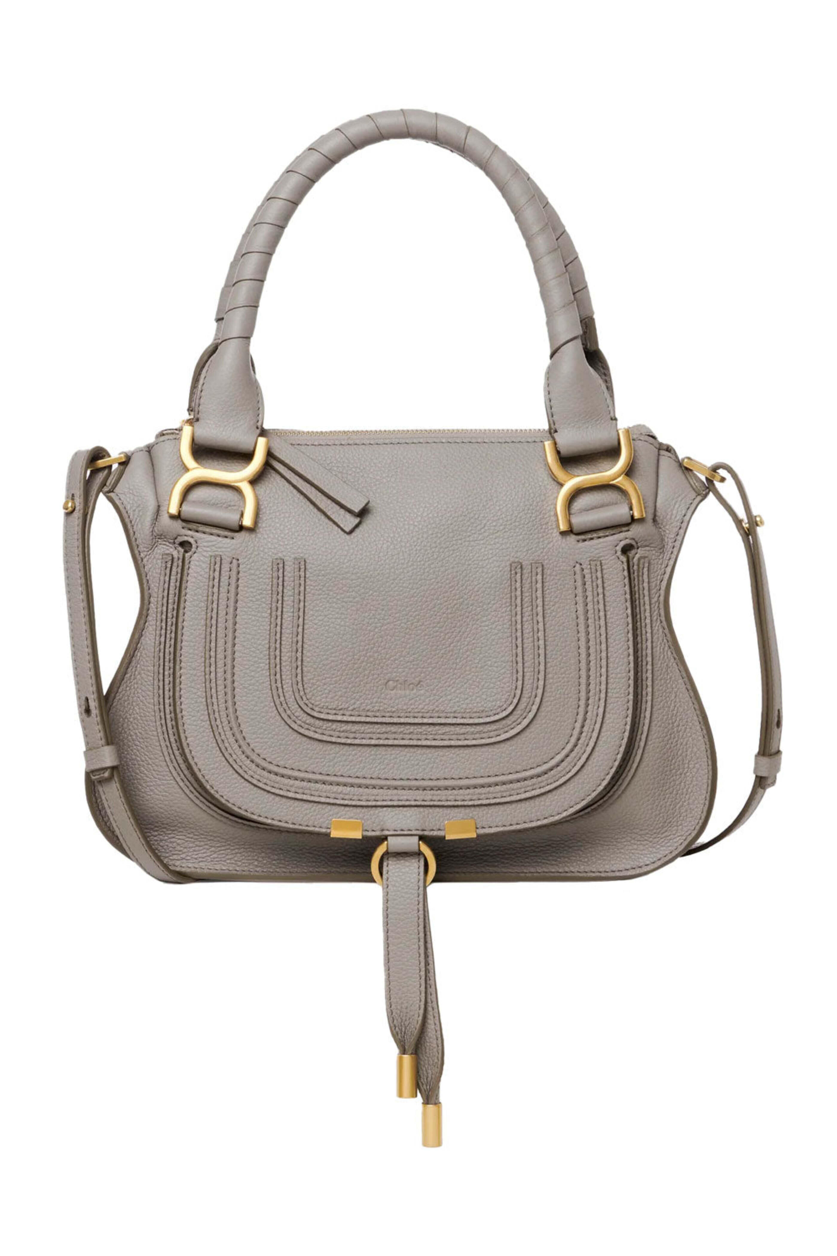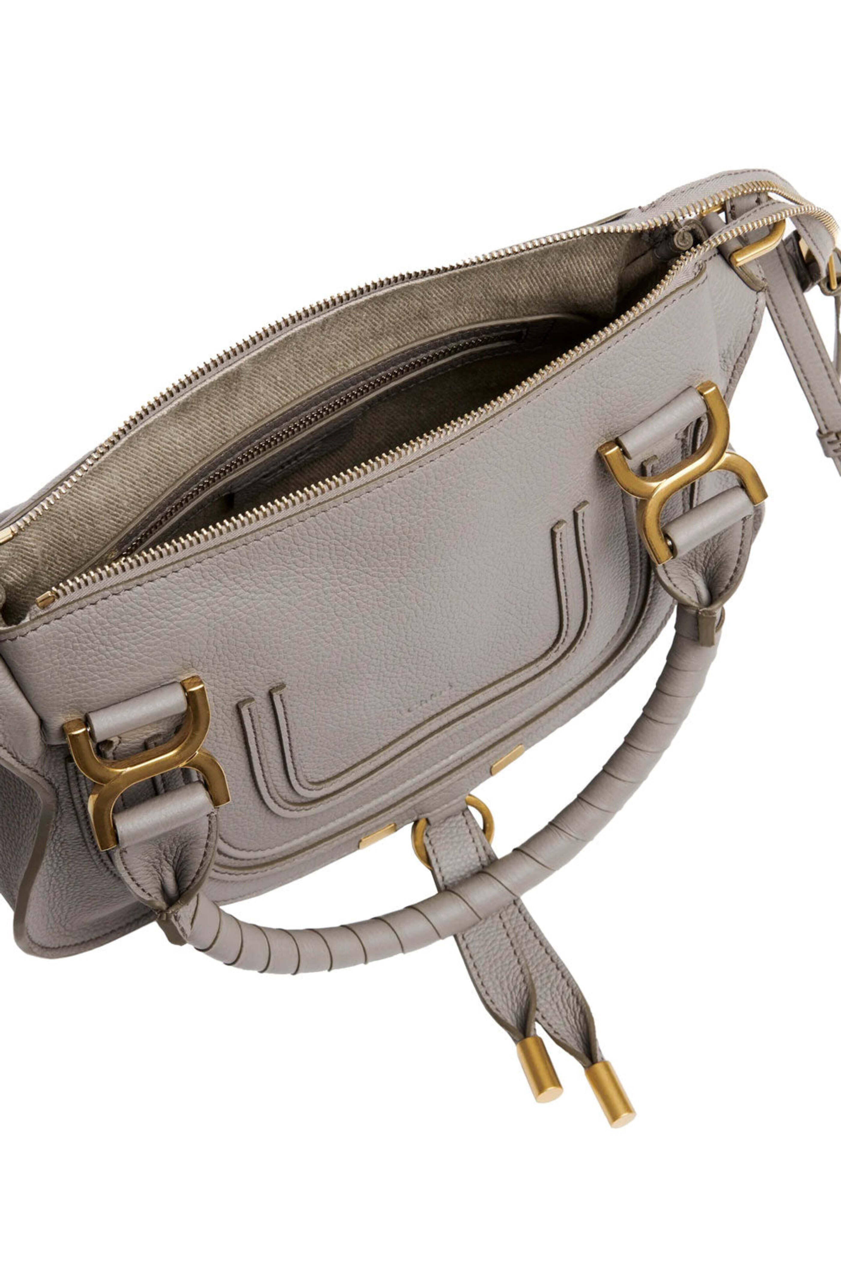 Chloe Marcie Small Satchel in Cashmere Grey. Double top handles. Adjustable detachable crossbody shoulder strap. Top zip closure. Single large interior compartment. Hidden flap pocket. Interior zip pocket. Interior slip pocket. Tonal stitching. Antique gold-tone hardware. Leather upper. Cotton lining. 9 H x 11.8 W x .35 D. 20.1 shoulder strap length. 6 top handle drop. Made in Italy.