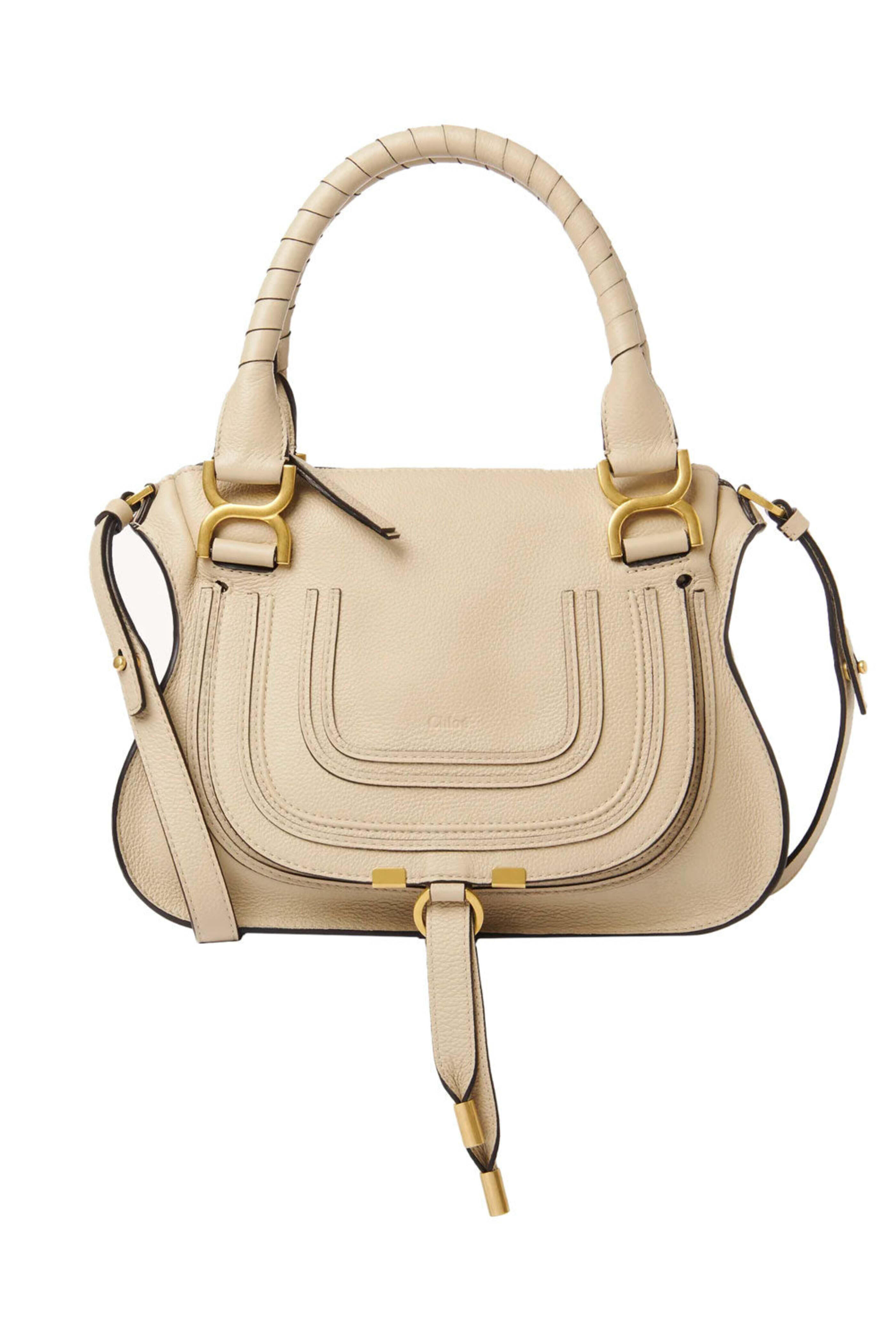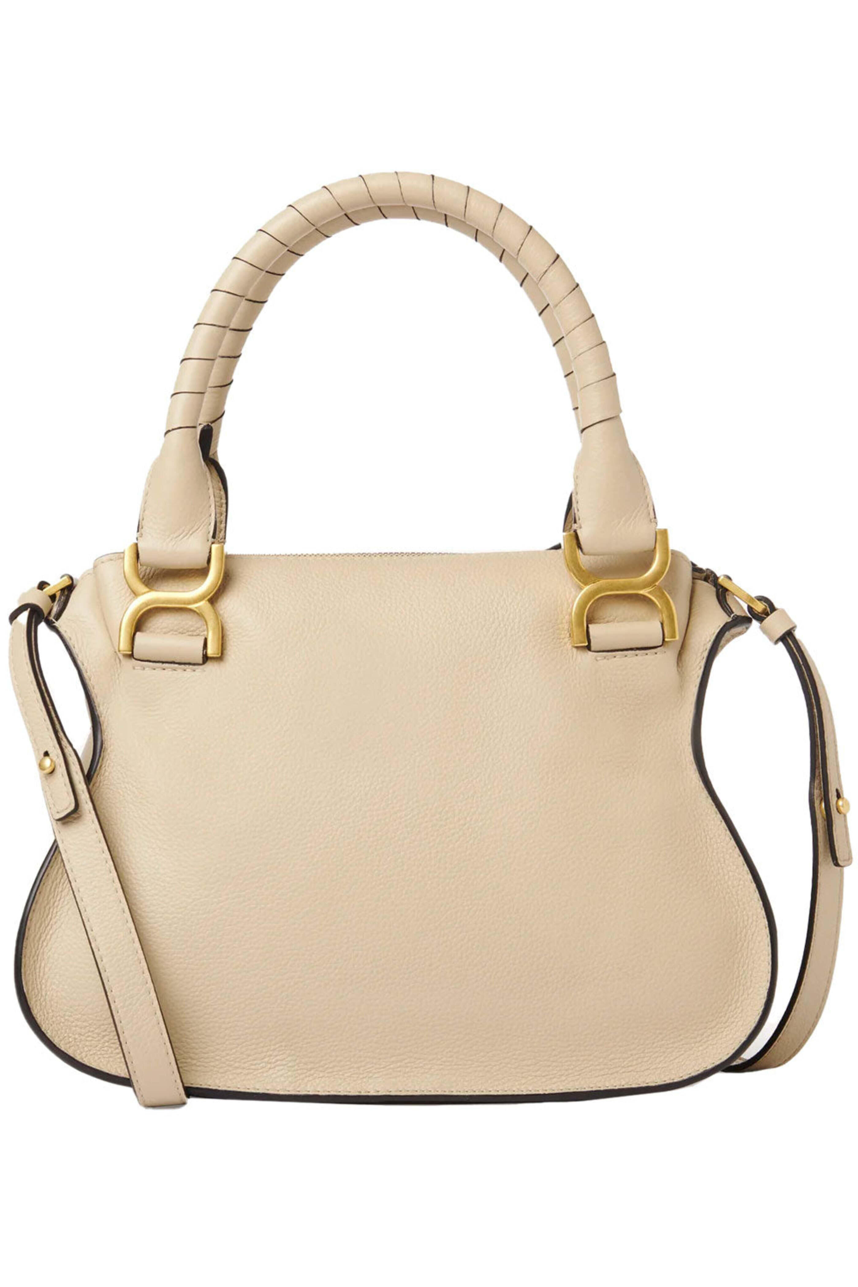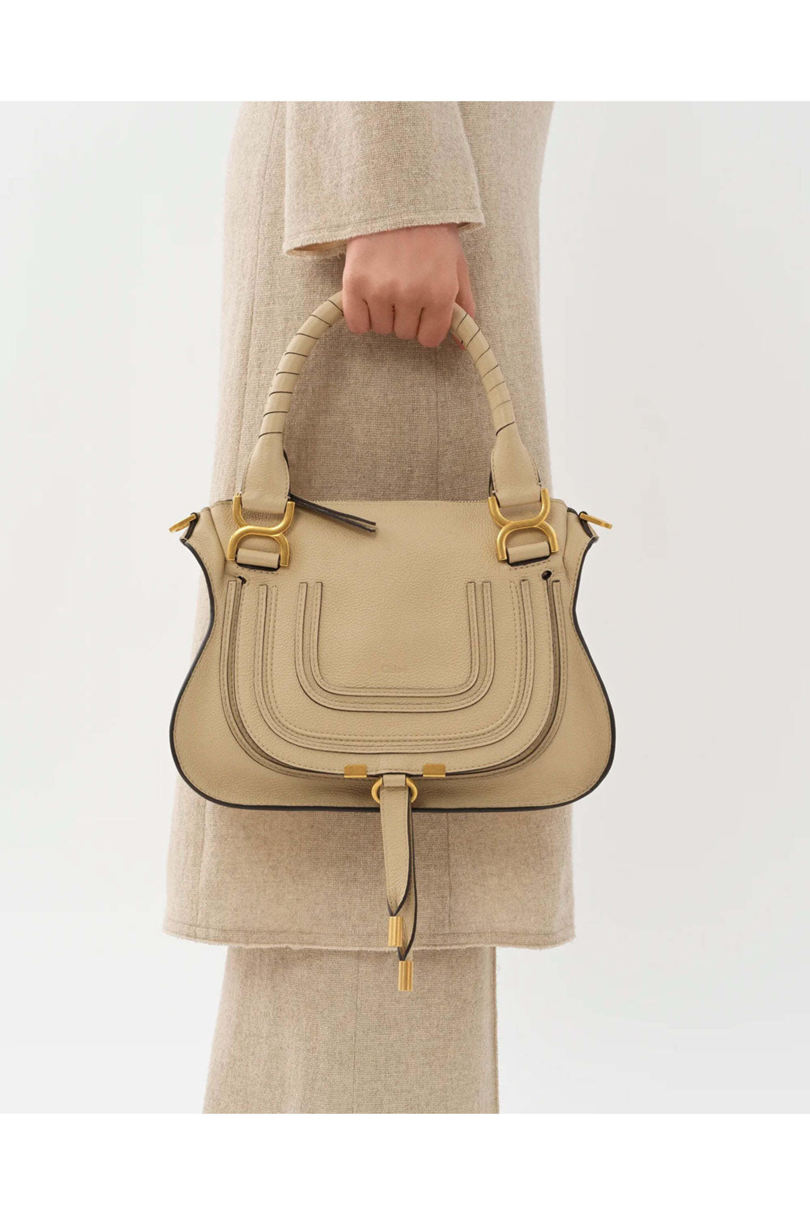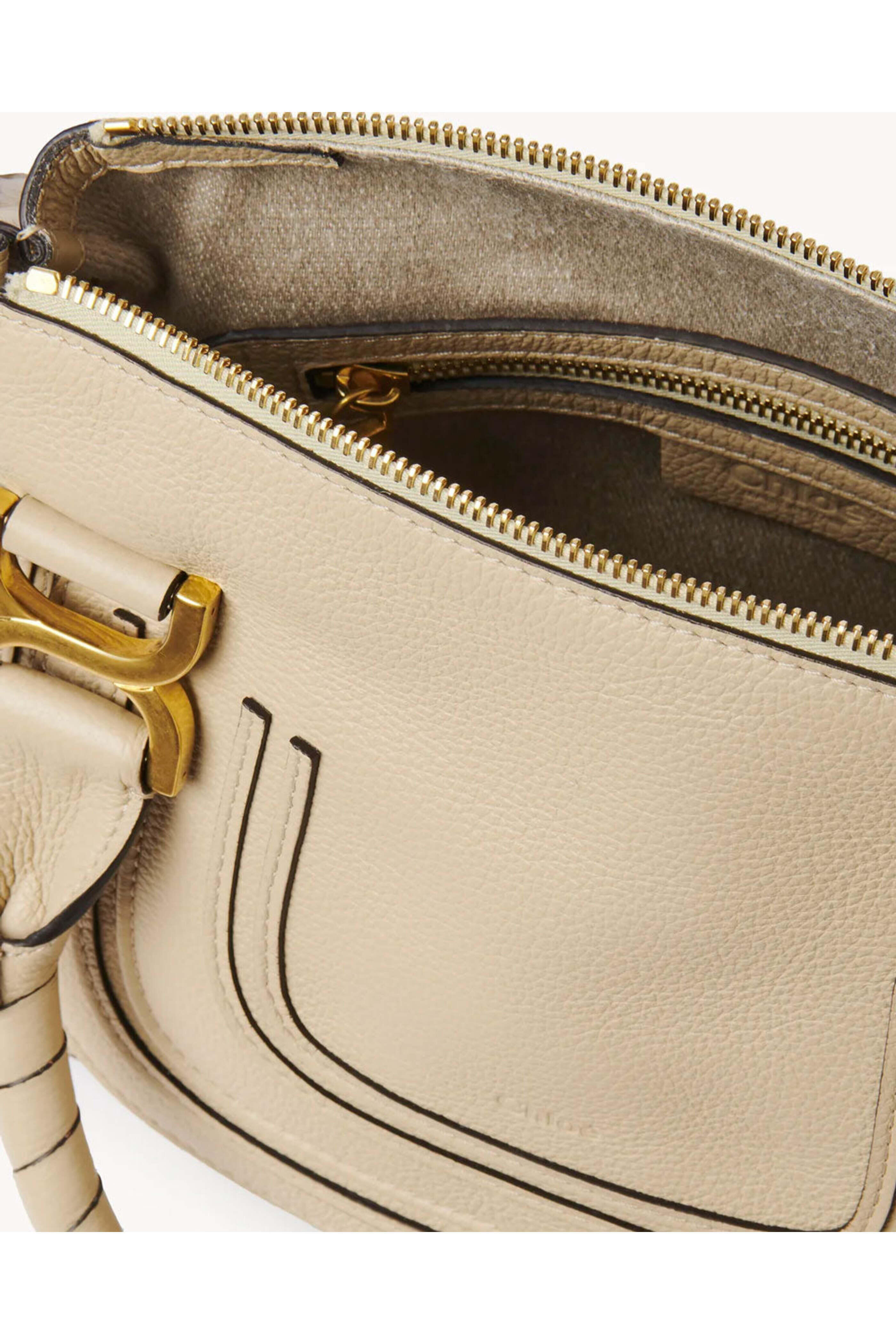 Chloe Medium Marcie Satchel in Root Beige. Top zip closure. Two top handles. Adjustable detachable strap. Large interior compartment. Hidden flap pocket. Inside zip pocket. Tonal stitching. Gold tone metal. Leather upper. Cotton lining. 11.8 W X 9 H X 3.5 D. 20.1 adjustable crossbody strap drop. Made in Italy.