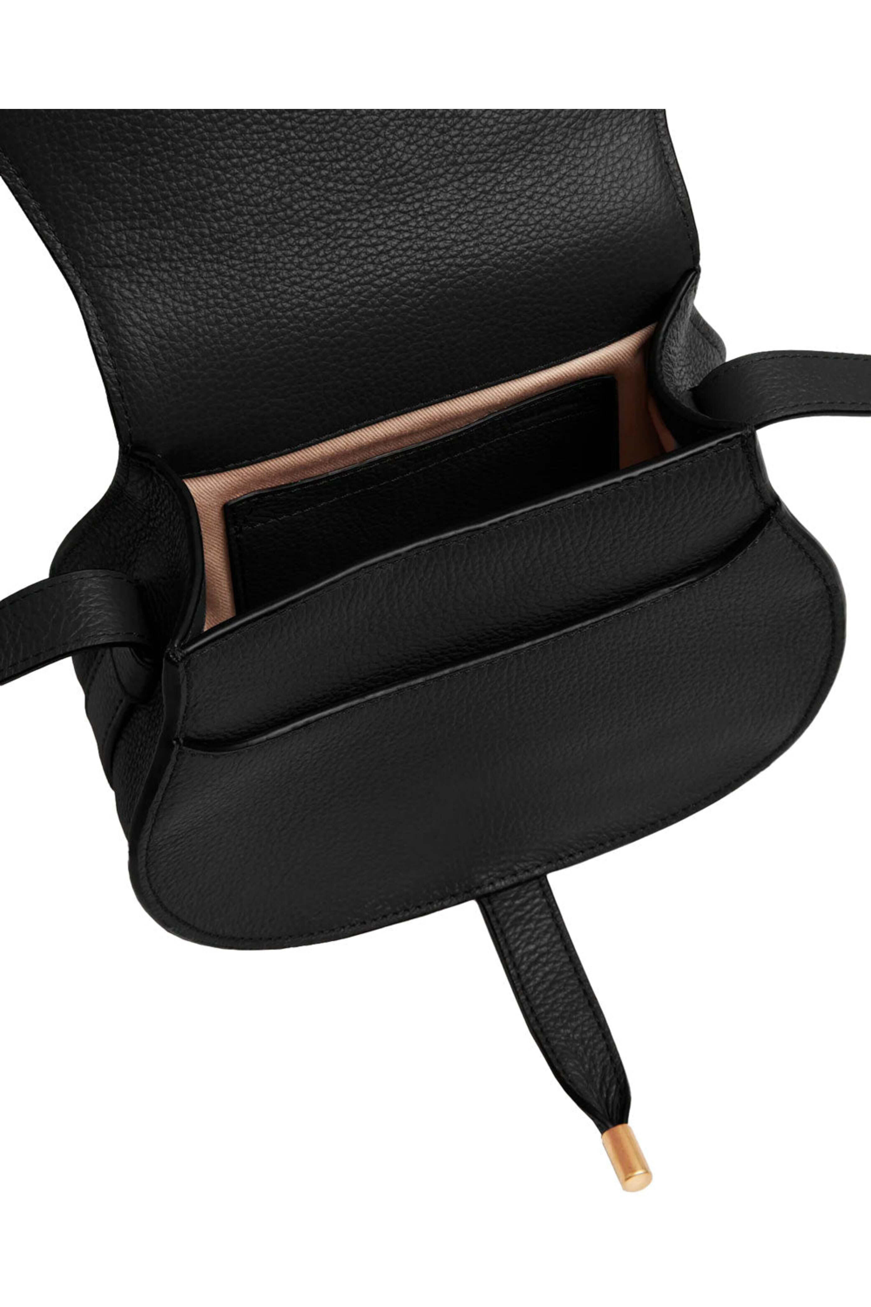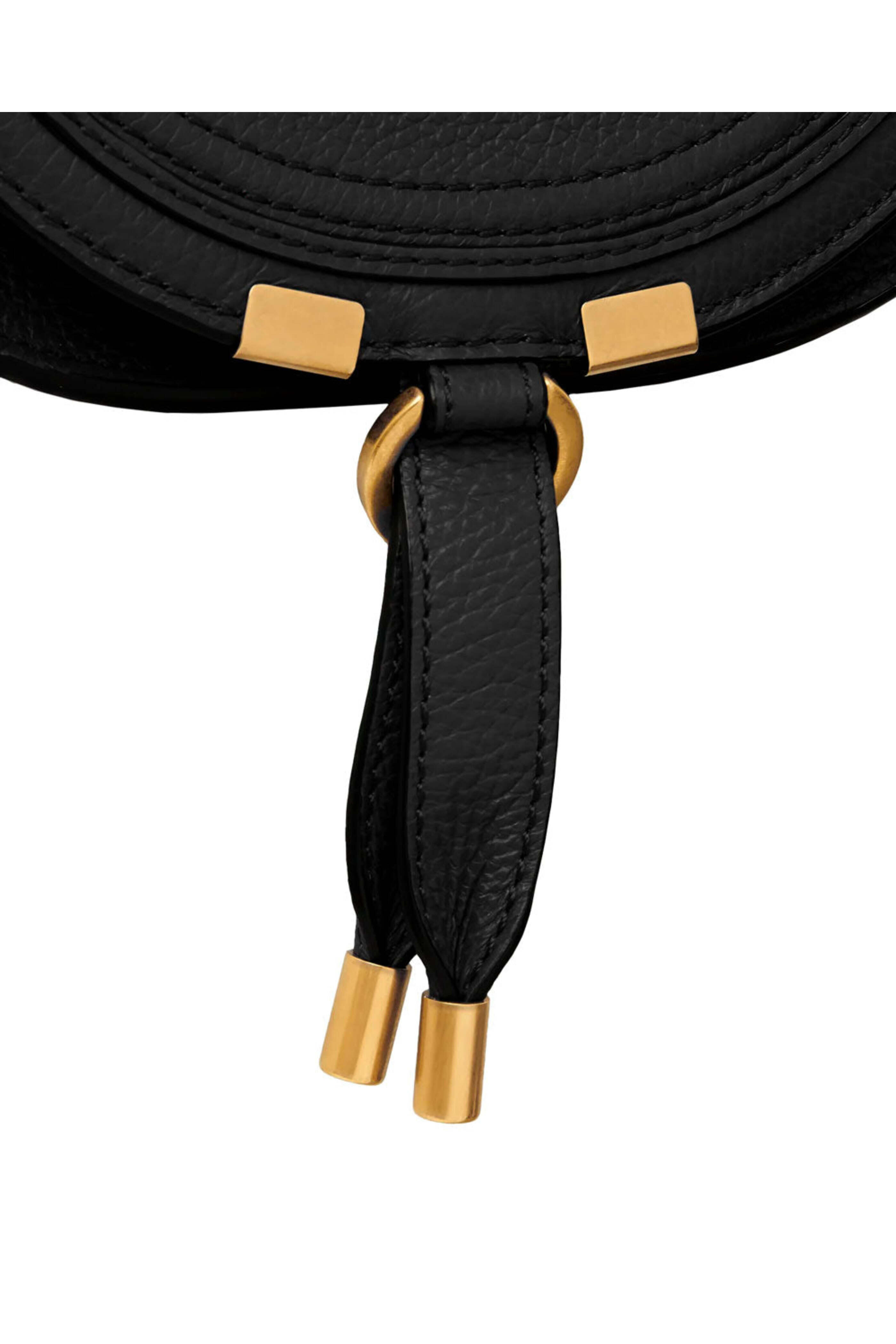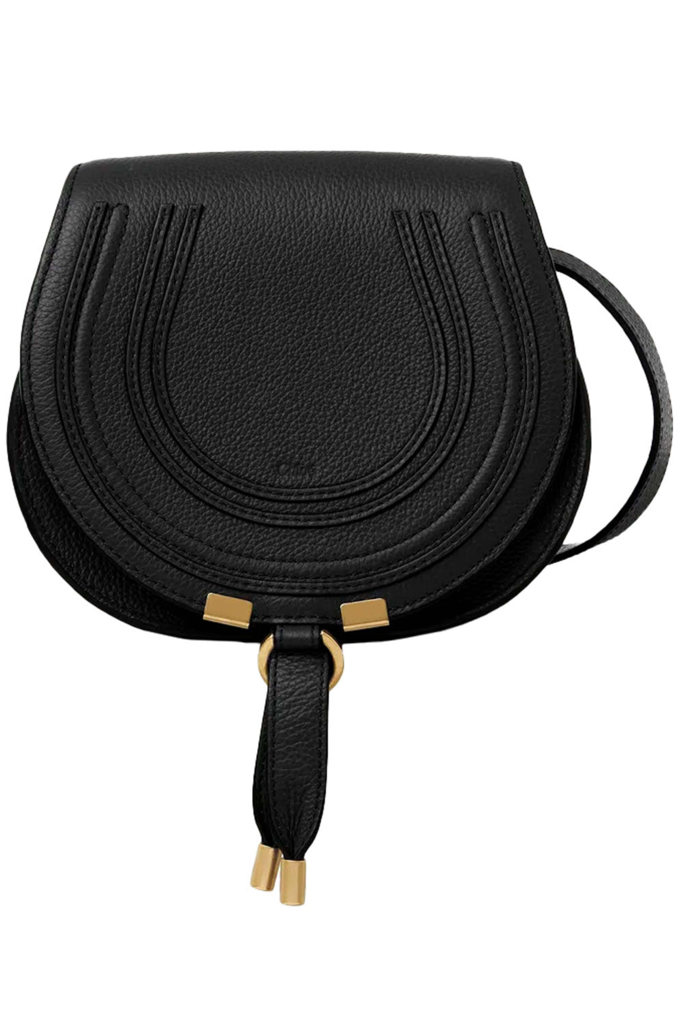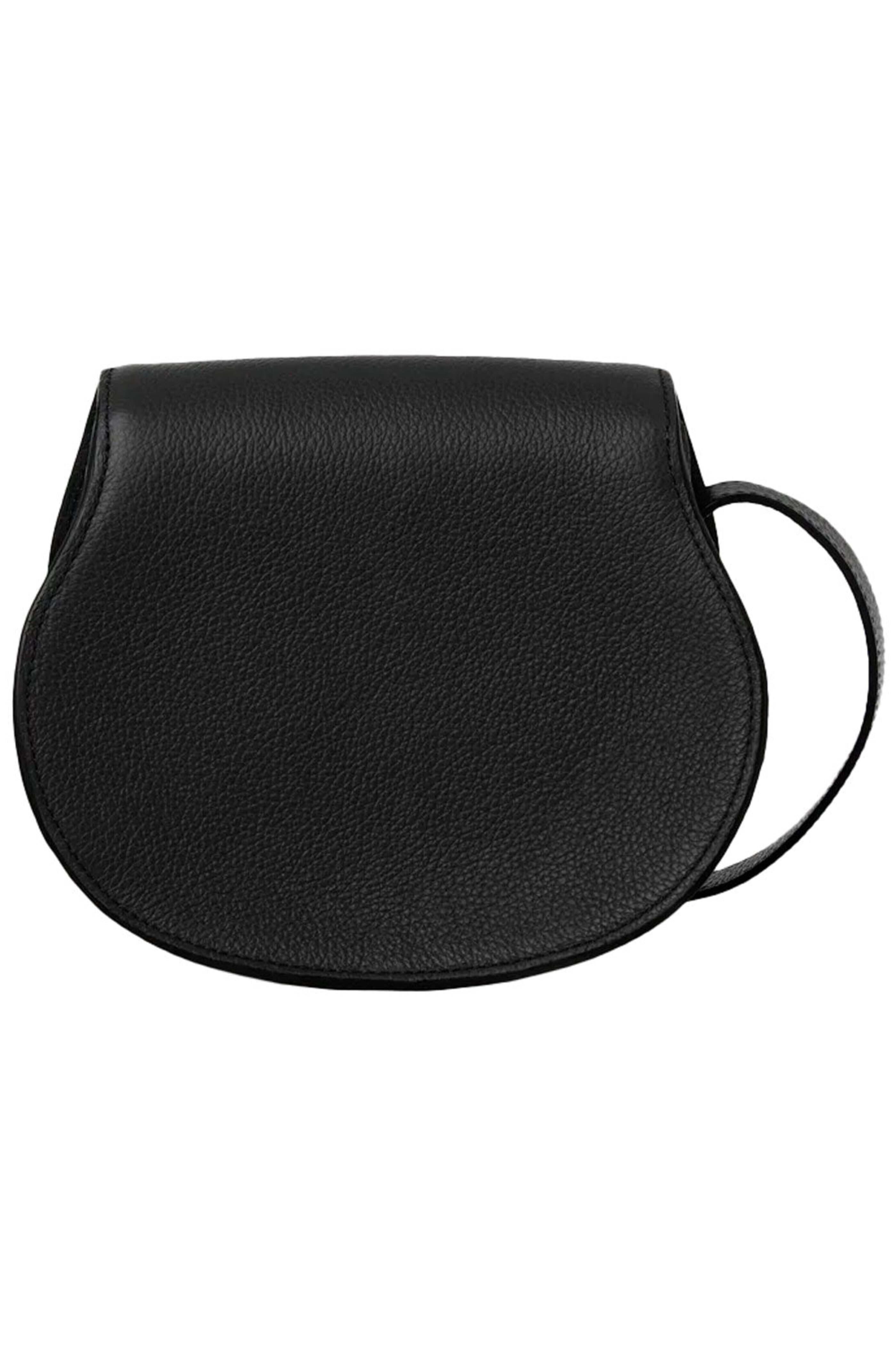 Chloe Marcie Small Saddle Bag in Black. Top flap closure; tassel and ring fastening. Adjustable leather crossbody strap; square buckle fastening. Single large interior compartment. Front slip pocket. Single interior flat card pocket. Antique gold-tone hardware. Calfskin leather outer. Cotton lining. 6.7 H x 7.1 W x 3.9 D. 19.7 23.6 strap drop. Made in Spain.