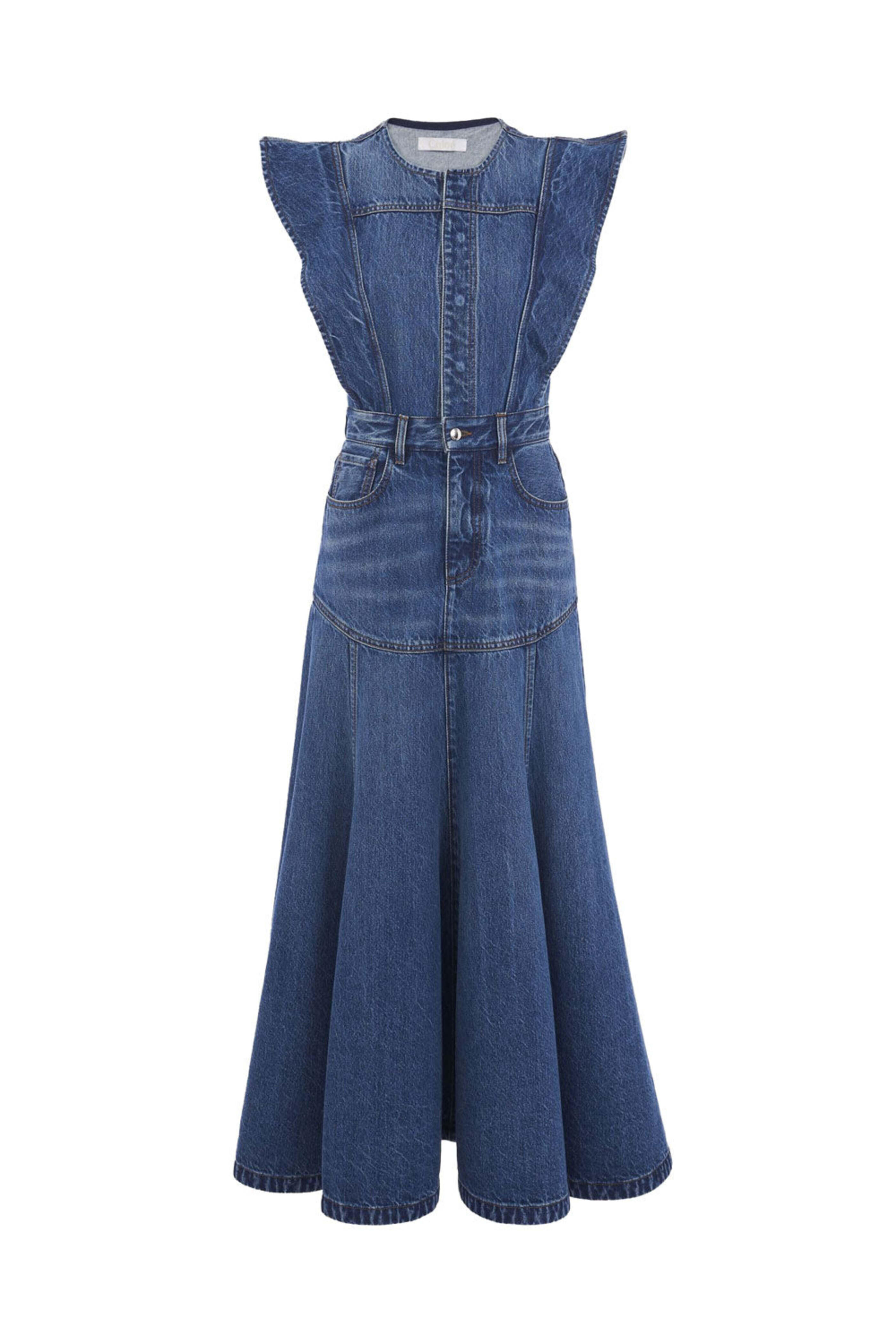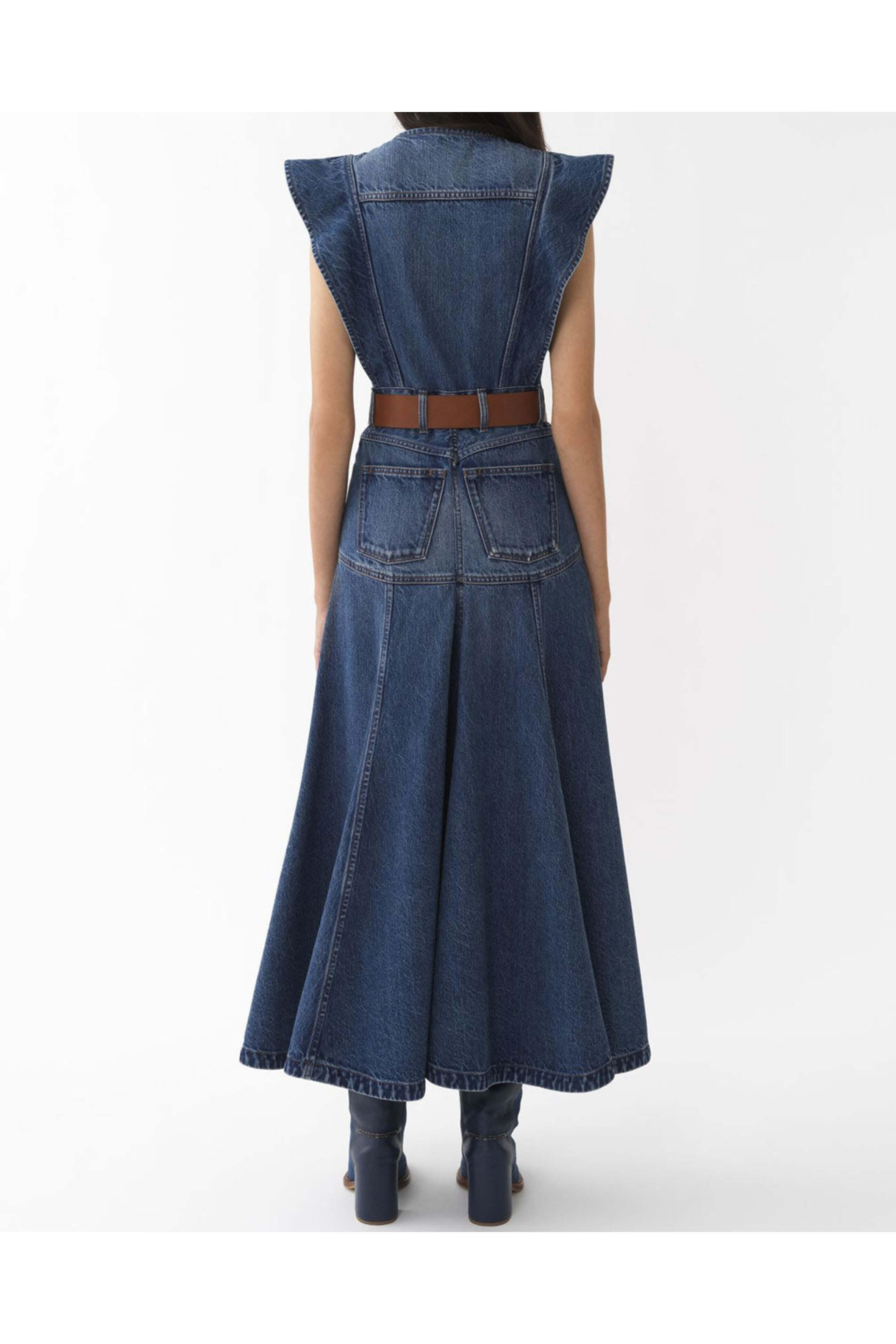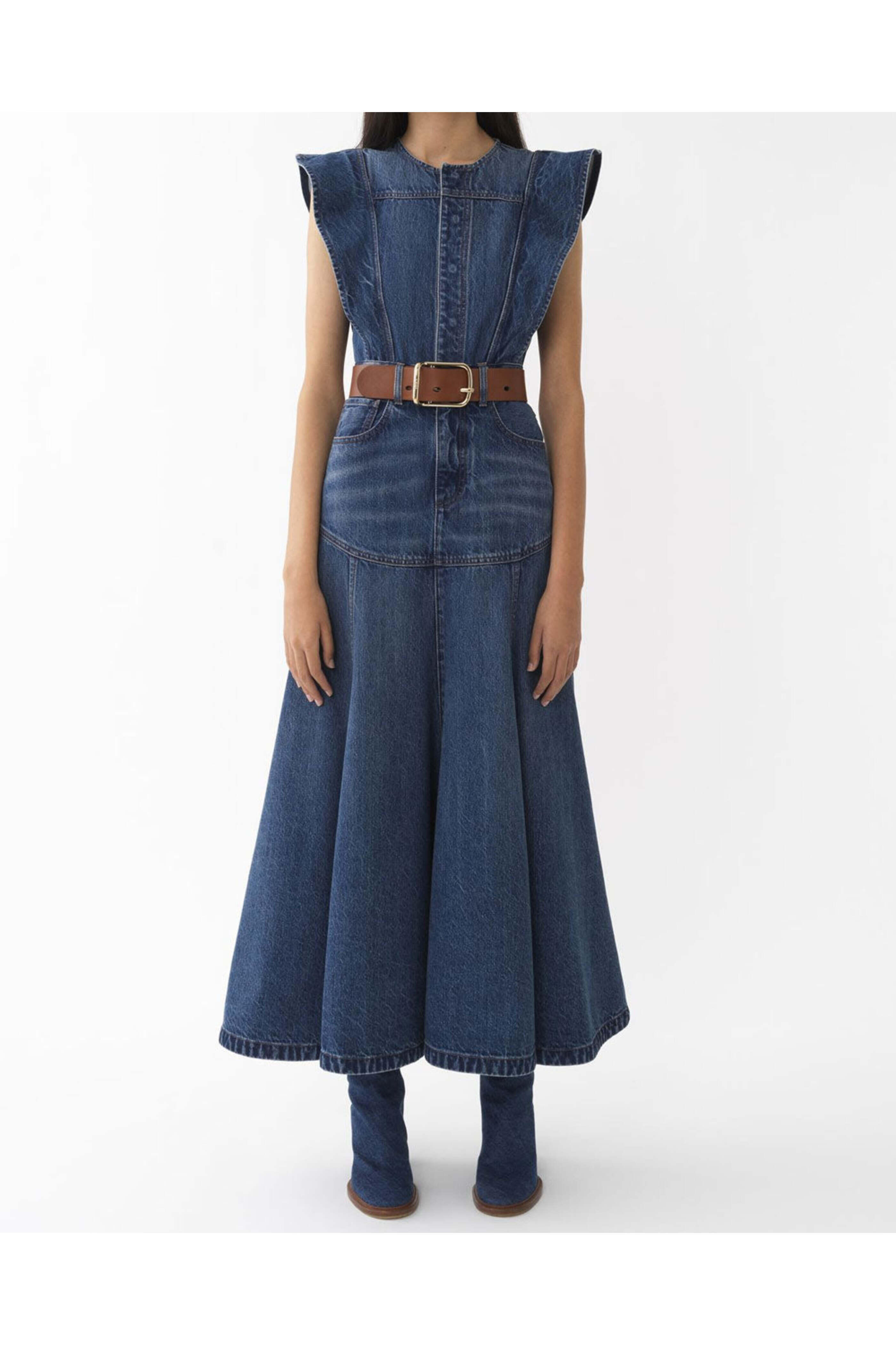 Chloe Dusky Blue Denim Dress. Round neck. Ruffle shoulder detail. Sleeveless. Concealed button placket. Belt loops. Five pocket style. Fit and flare silhouette. Midi length. Denim fabrication. 100% organic cotton.