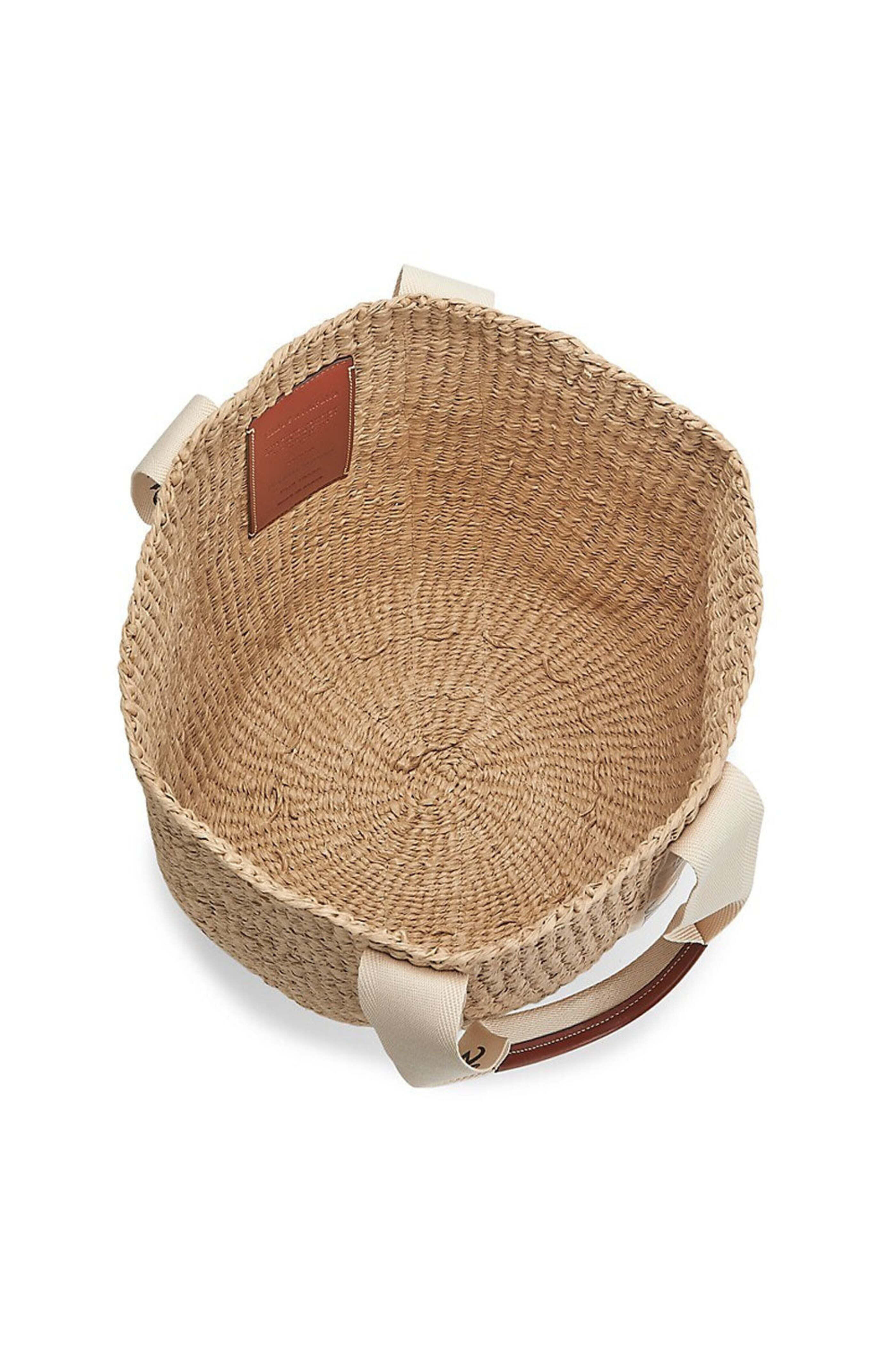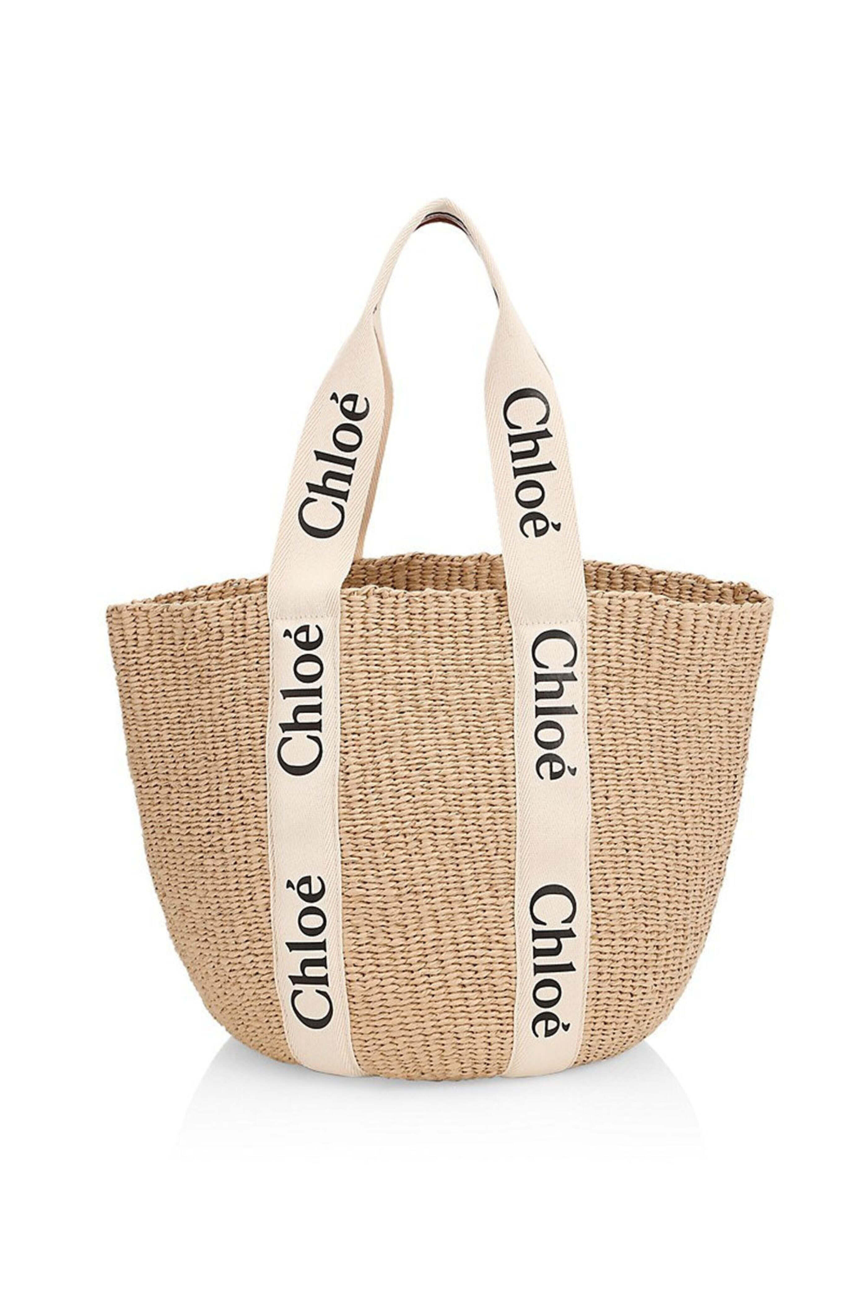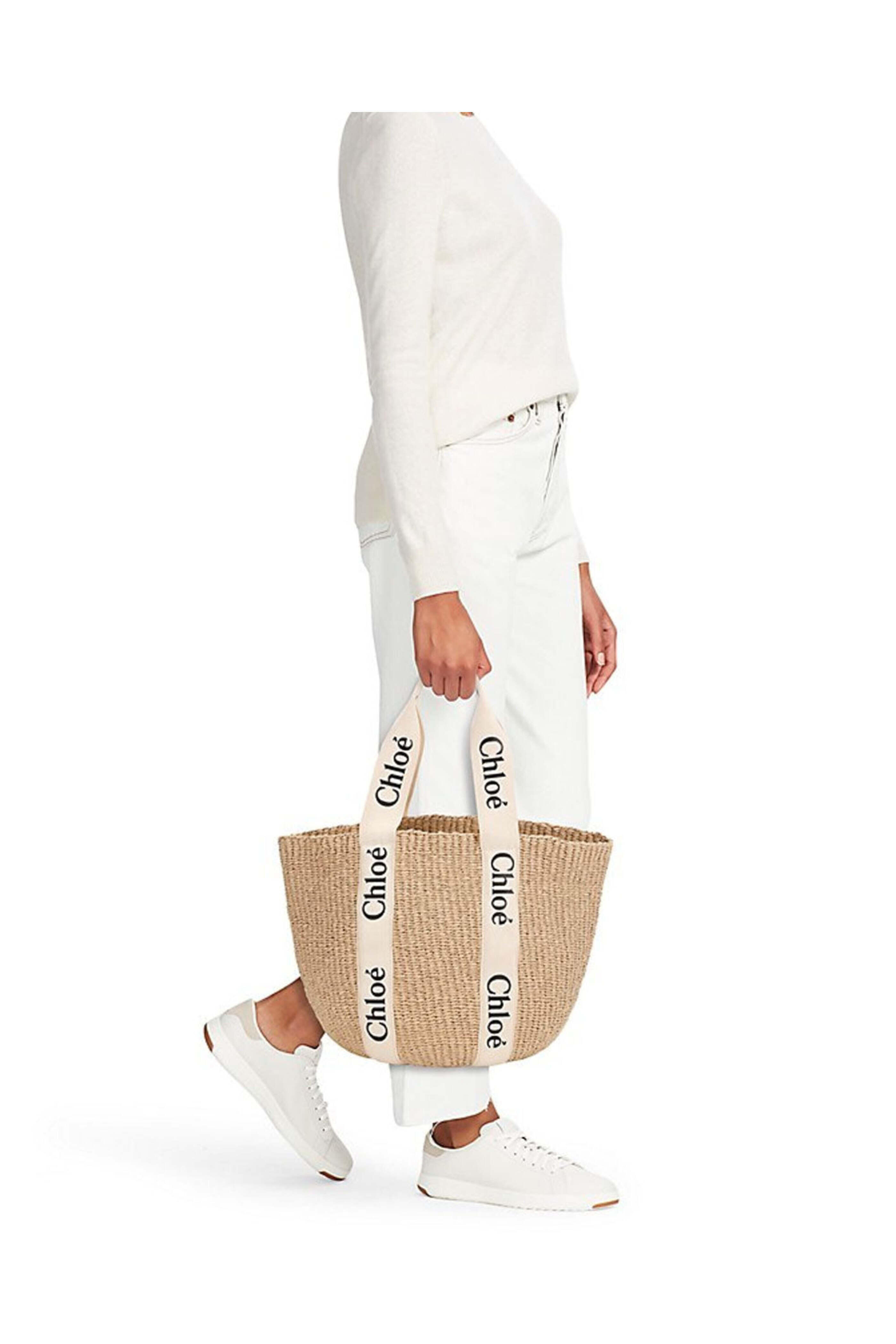 Chloe Woody Straw Woven Tote in White. Open toe. Dual top handles. Main compartment. Signature logo tape straps. 10W x 8H x 3D. Made in Italy.
