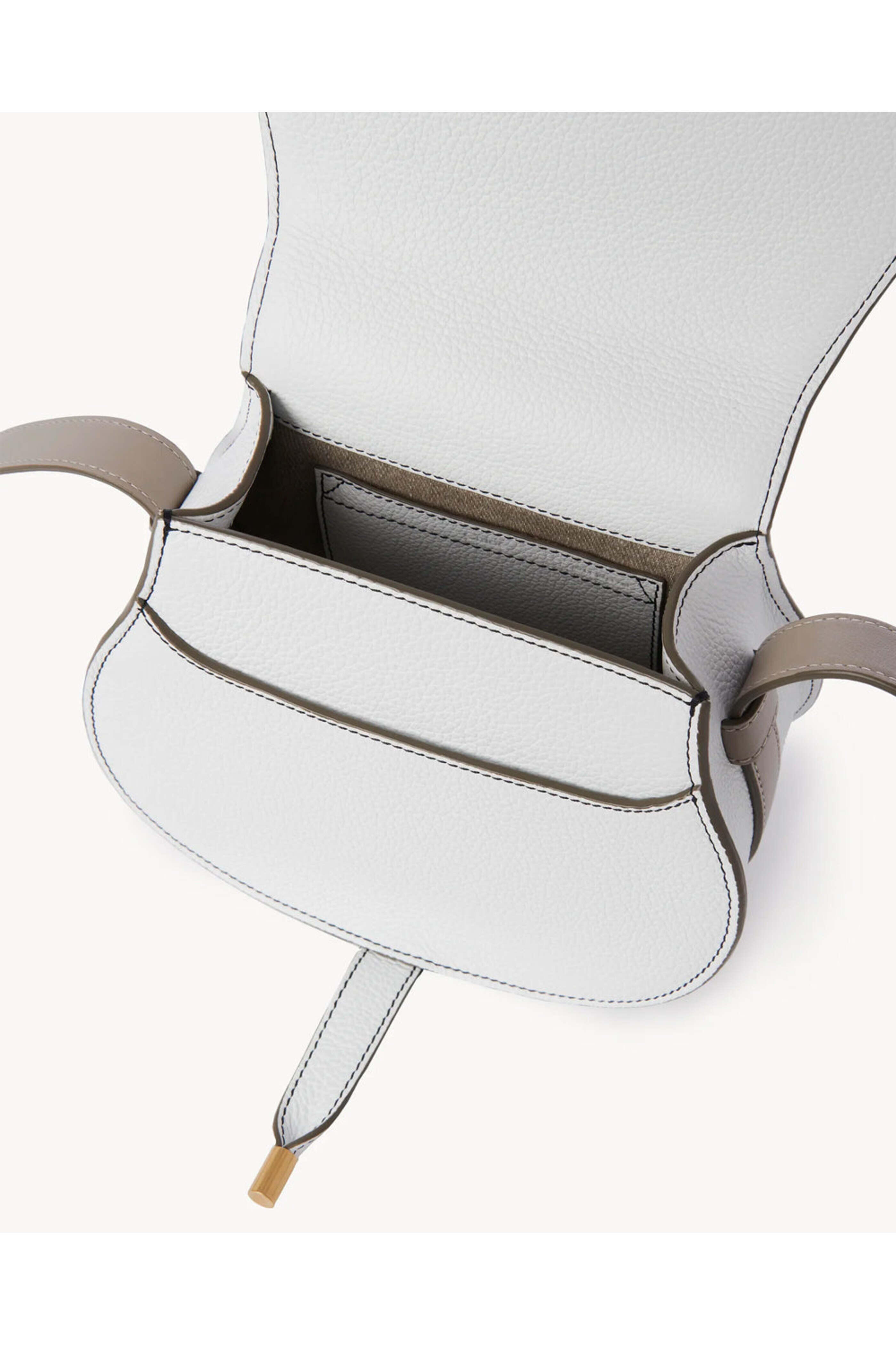 Chloe Marcie Small Saddle Bag Crossbody in Crystal White. Bicolor grained calfskin with contrast stitching. Top flap closure; tassel and ring fastening. Adjustable leather crossbody strap; square buckle fastening. Single large interior compartment. Front slip pocket. Single interior flat card pocket. Antique gold finishing. Calfskin leather outer. Cotton lining. 6.7 H x 7.1 W x 3.9 D. 19.7 23.6 strap drop. Made in Spain.