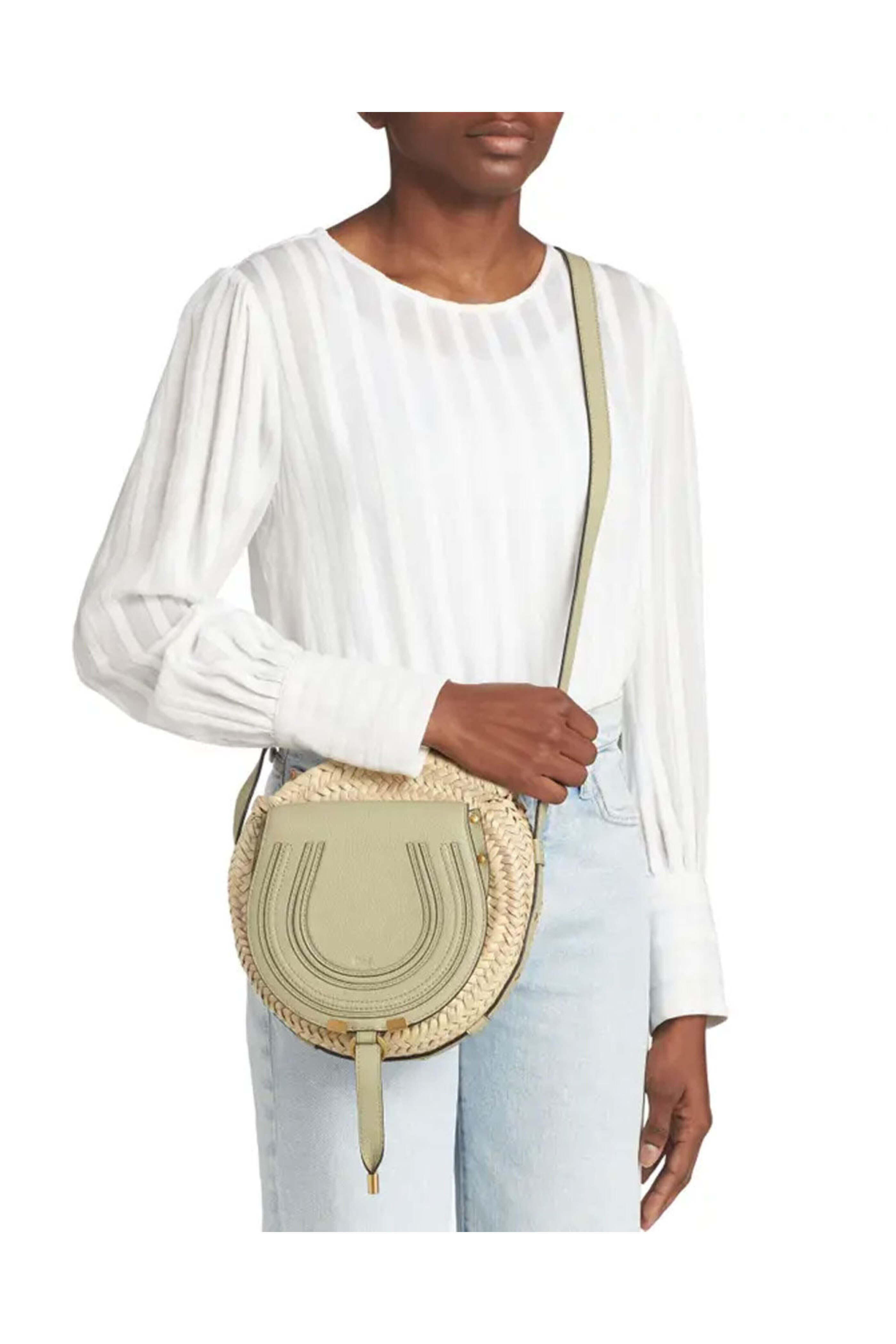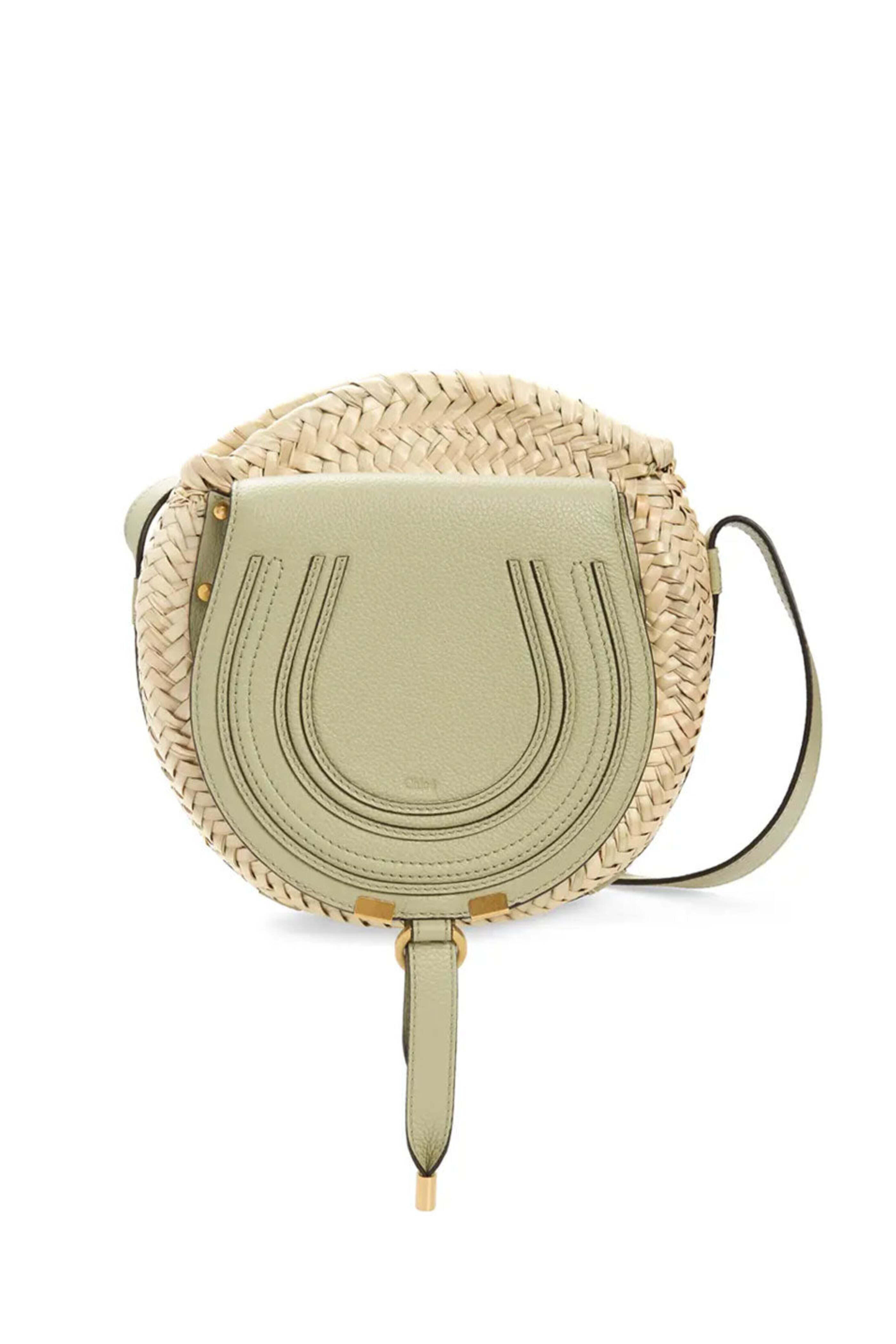 Chloe Marcie Crossbody Basket in Faded Green. Magnet closure. Adjustable leather strap. 1 main compartment. 1 internal flat pocket. Marcie's signature details. Gold-toned hardware. Hand braided raffia. Small grain calfskin. 7 W x 9.4 H x 3.1 D. Min strap drop: 16.9. Max strap drop: 21.3. Made in Italy.