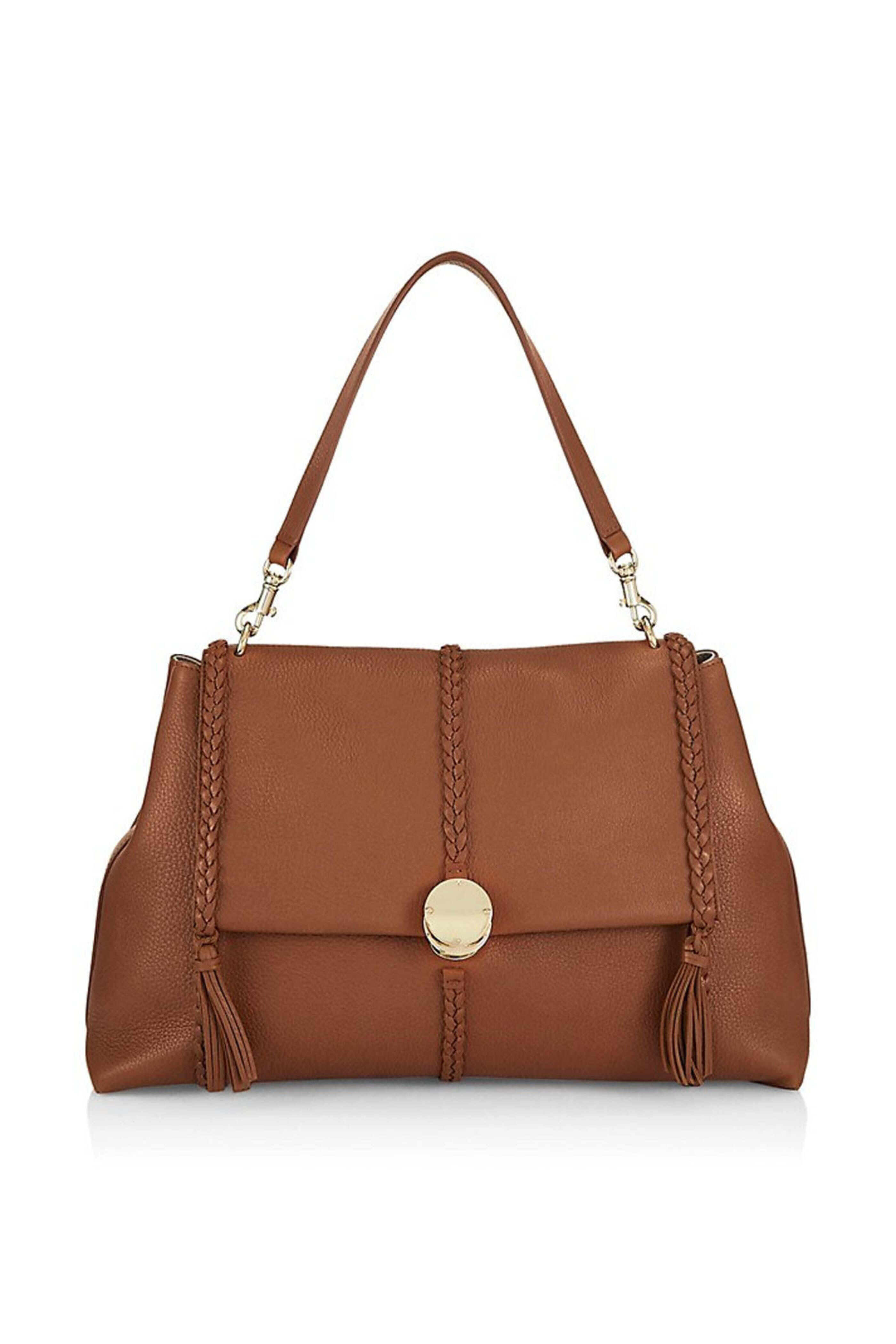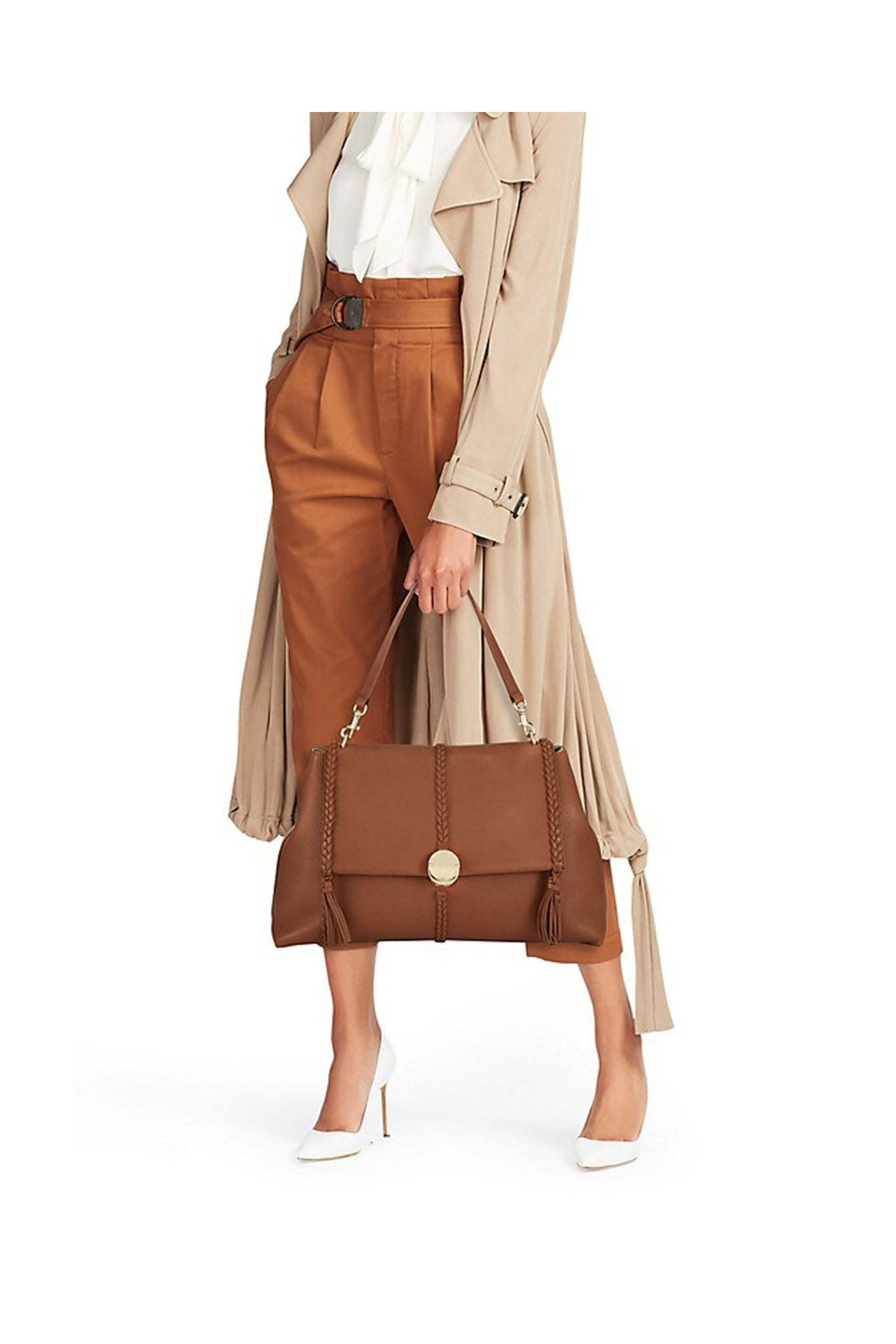 Chloe Penelope Tote in Caramel. Magnetic flap fastening. Single top handle. Removeable strap. Tassel detailing. Gold-tone hardware. Interior zip pocket. 13W x 9.1H x 4.3D. 9 handle drop. 41.3 strap length. Made in Italy.