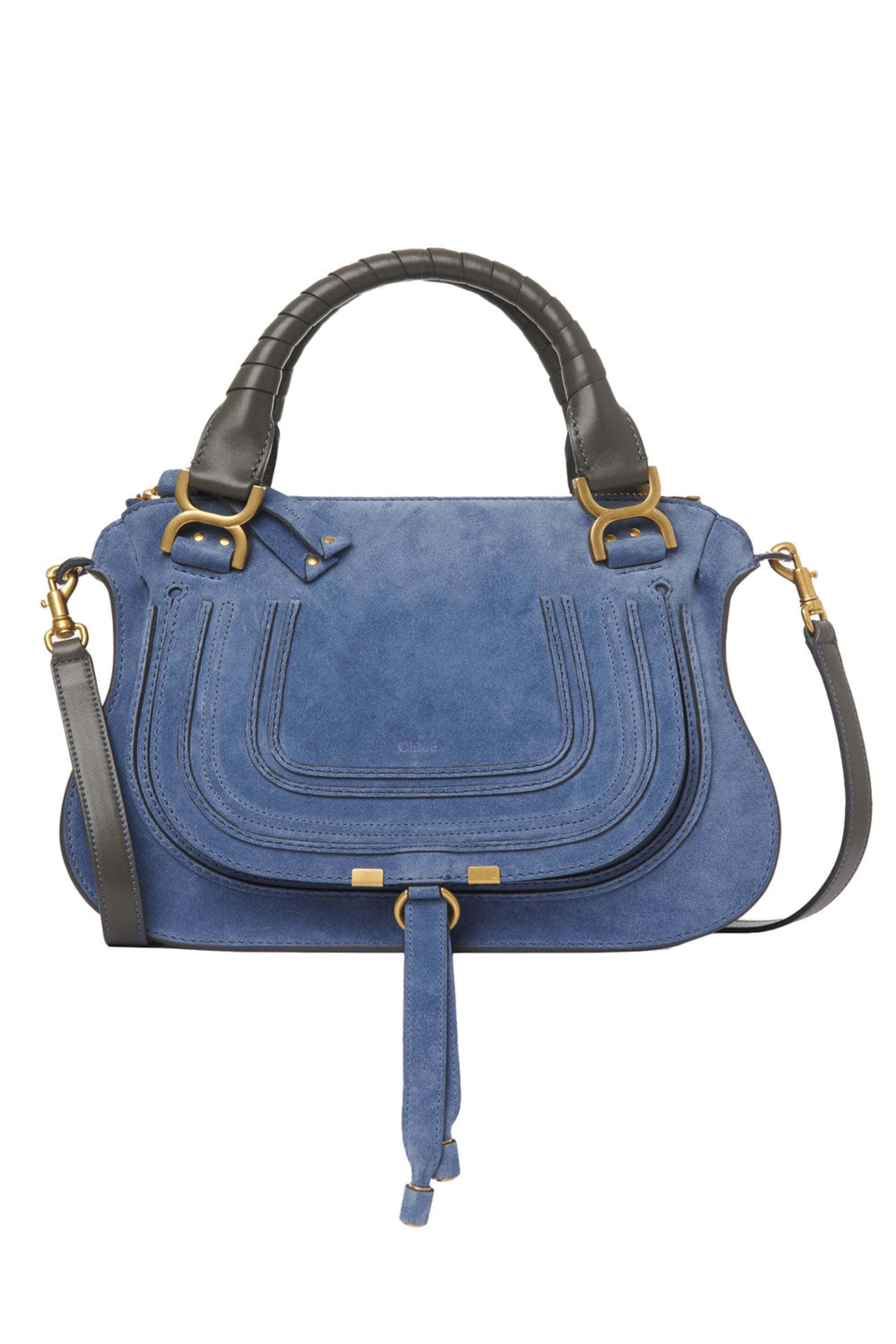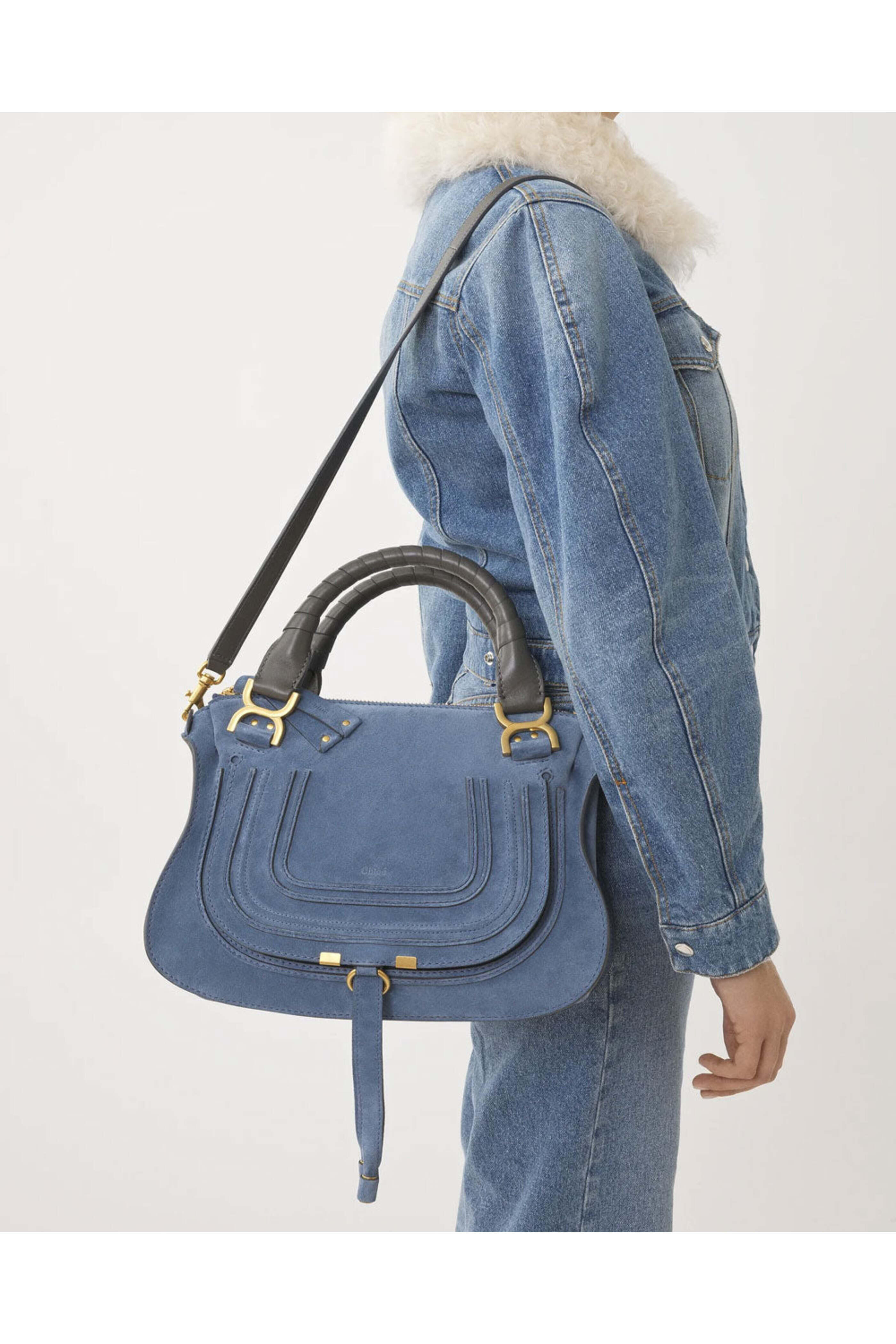 Chloe Marcie Handbag in Heaven Blue. Top zip closure. Top handle. Detachable and adjustable crossbody strap. Large interior compartment. Concealed slip pocket. Interior zip pocket. Antique gold hardware. Grained calfskin leather exterior. Cotton lined. 9 H x 11.8 W x 3.5 D. 20.1 long strap length. Made in Italy.