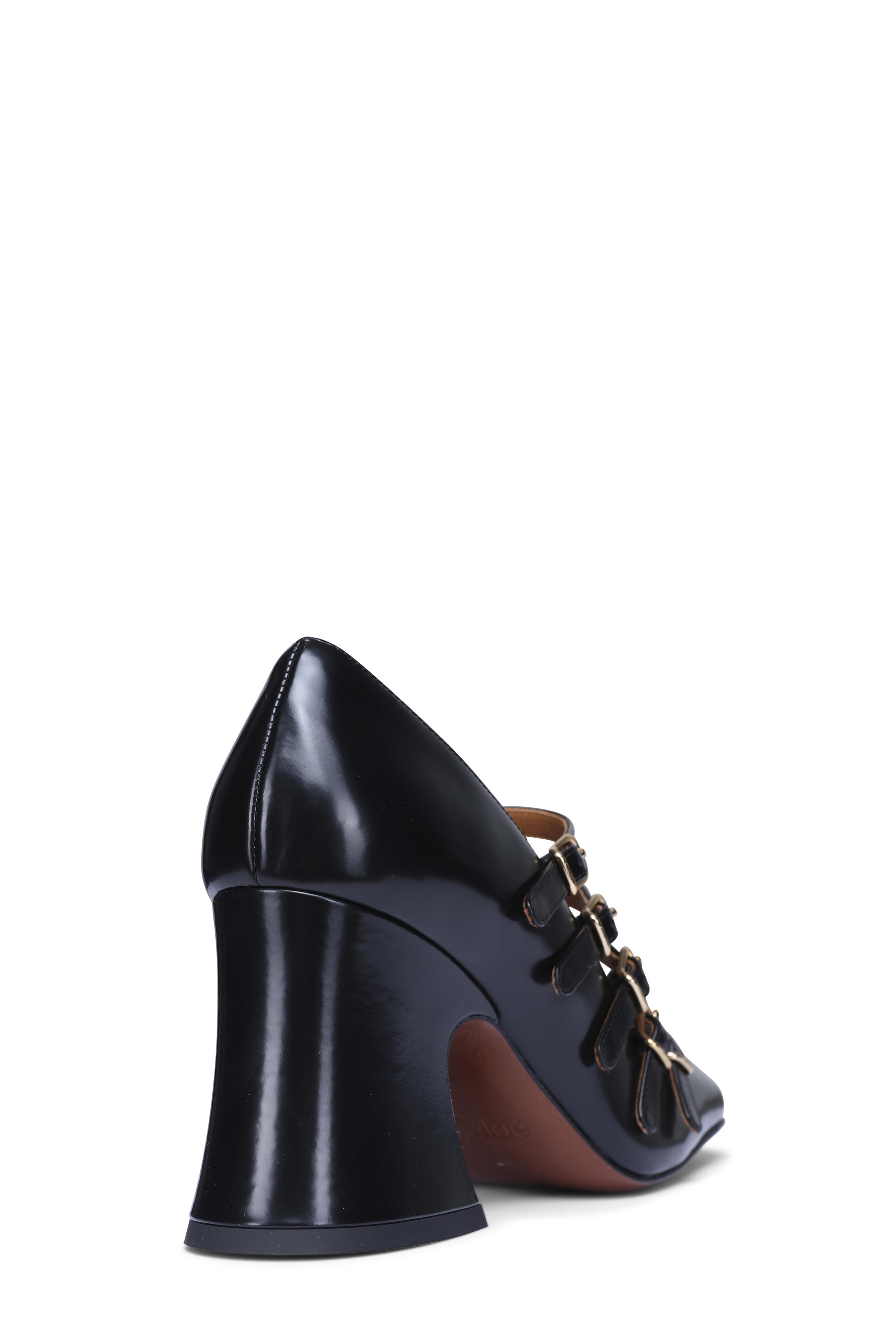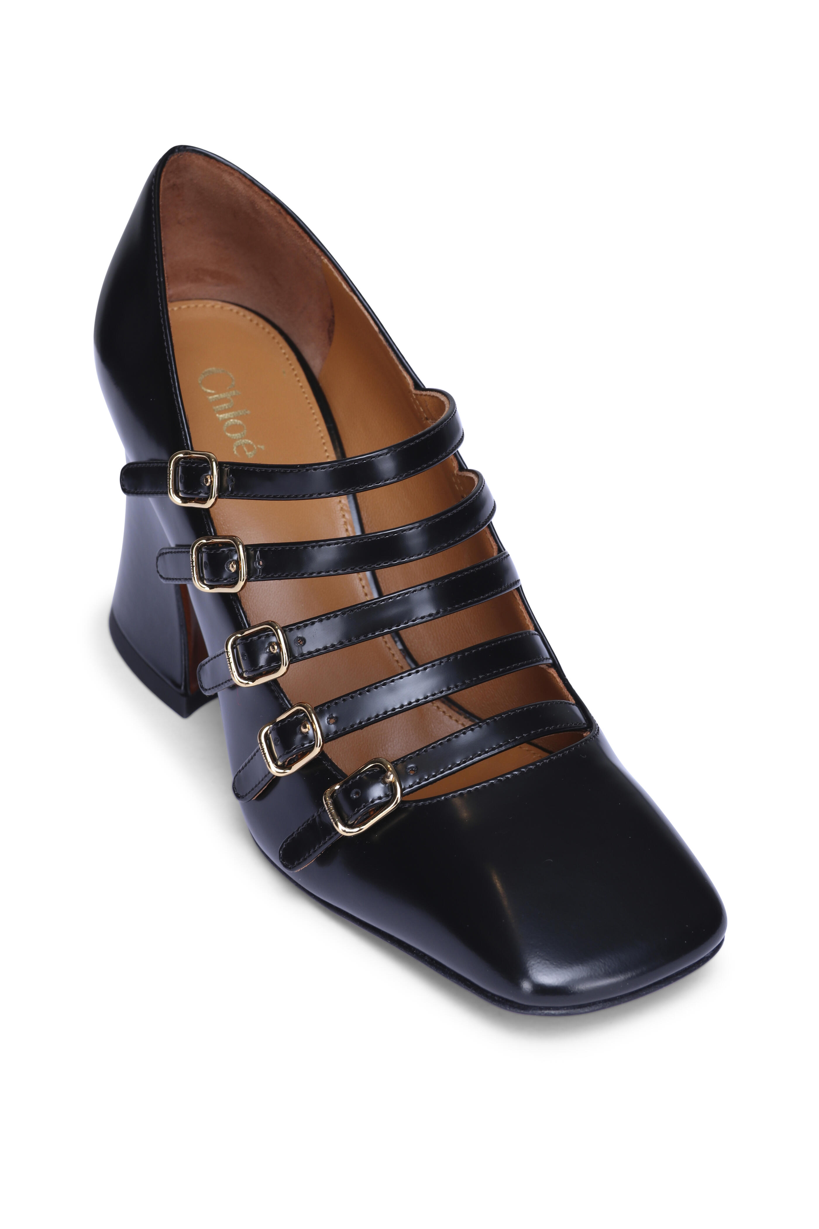 Calfskin leather upper. Lambskin leather lining. Cowhide sole. Square toe. Multiple adjustable buckle straps. Gold-tone buckle engraved with Chloe logo. Flared block heel. Made in Italy. Heel measurement: 3.1”.