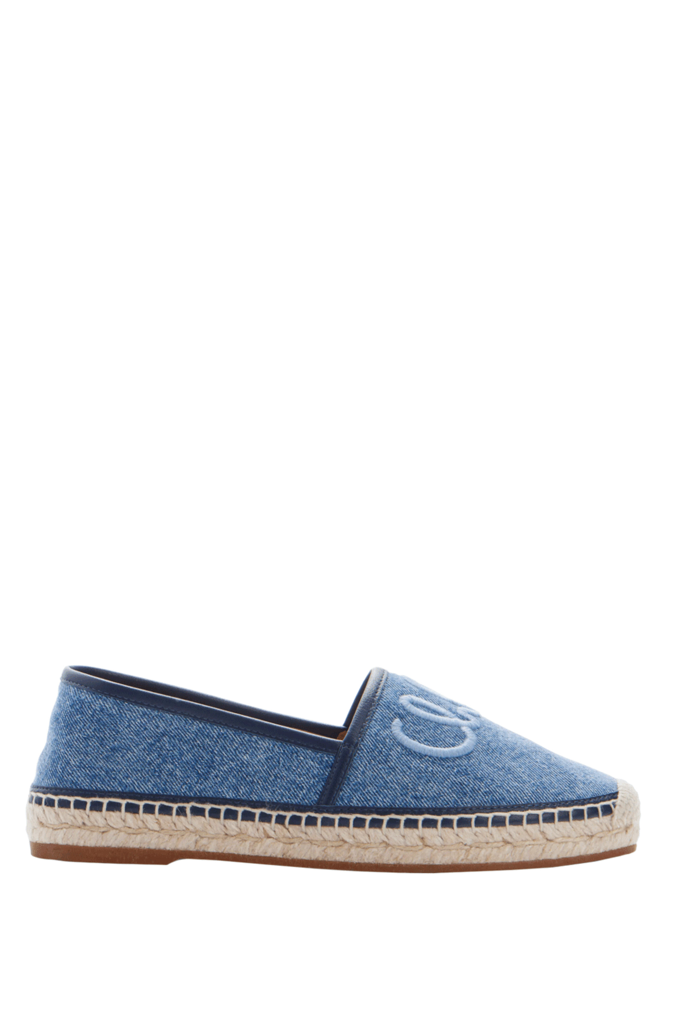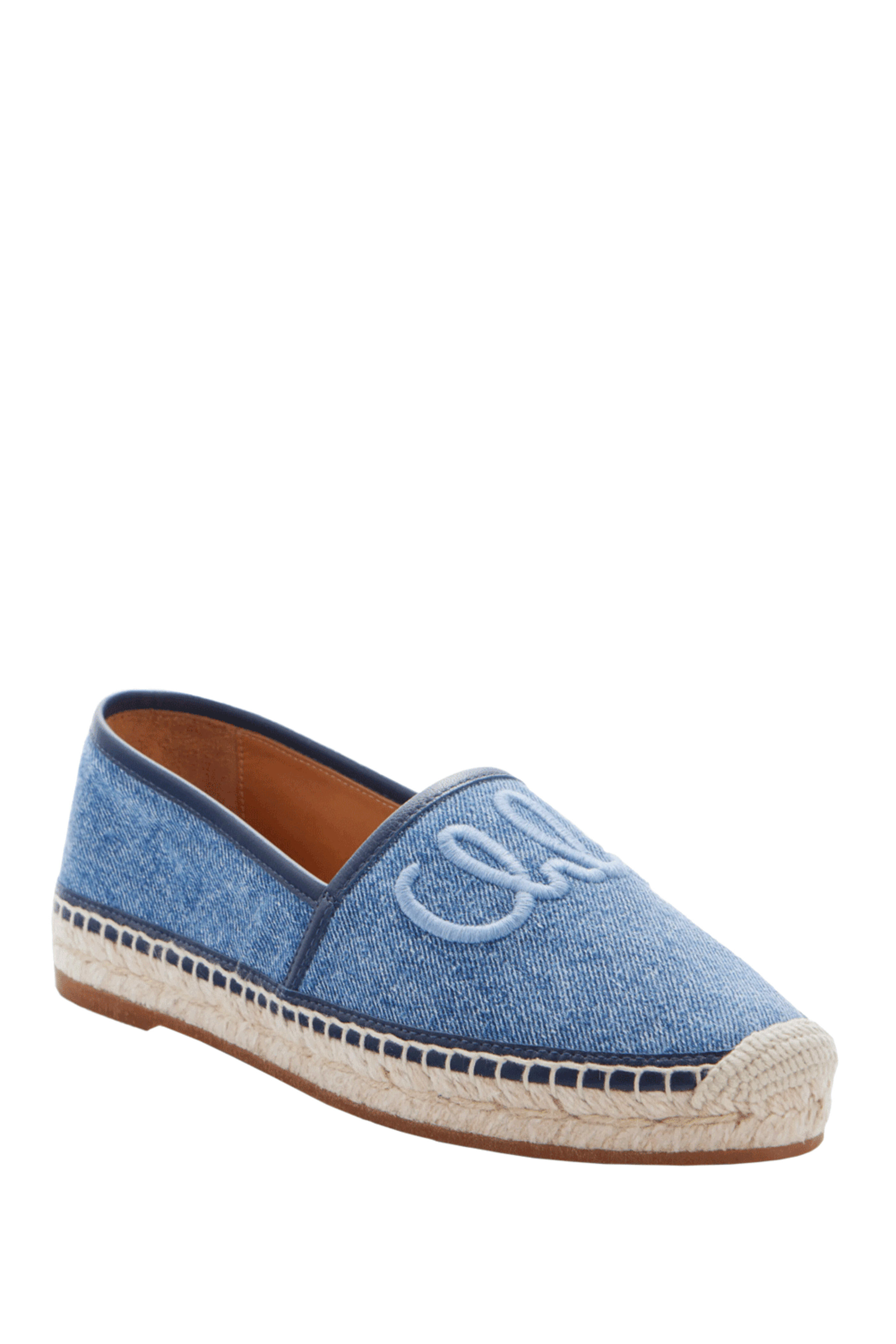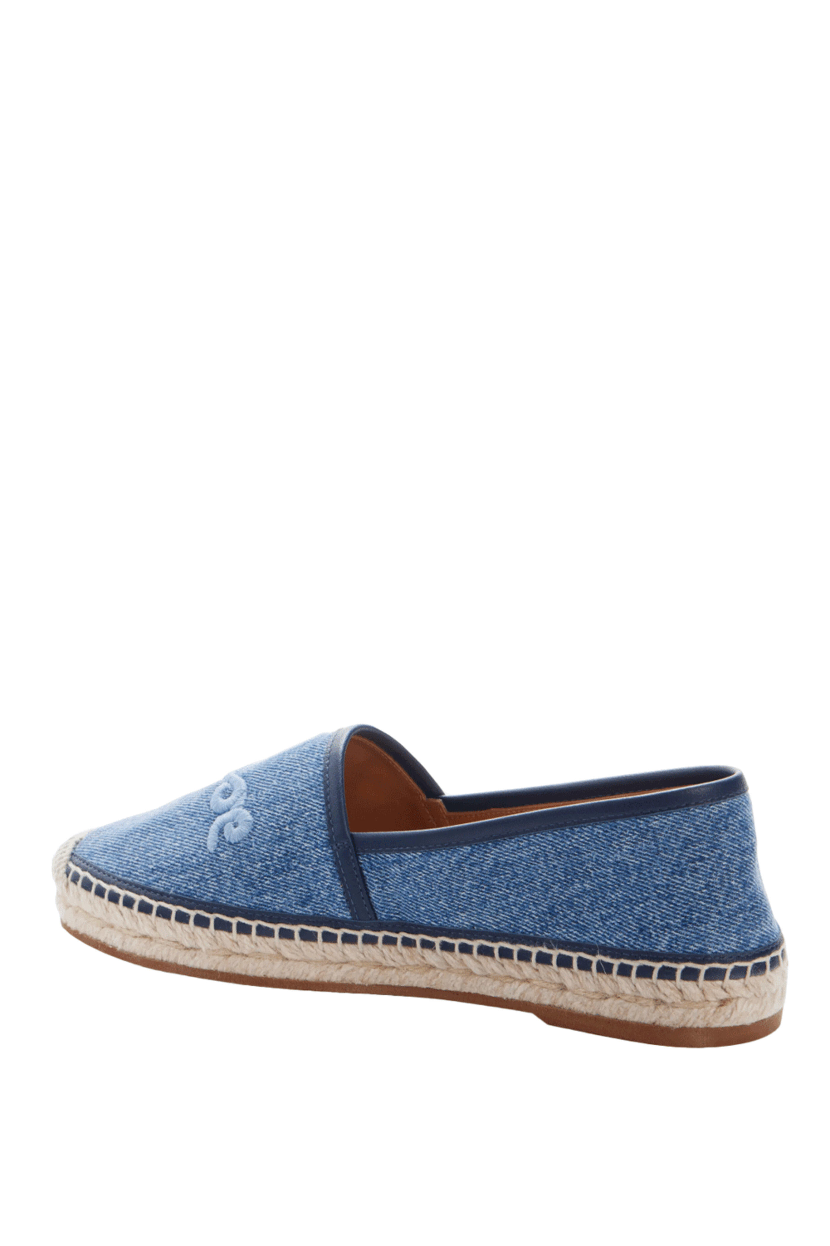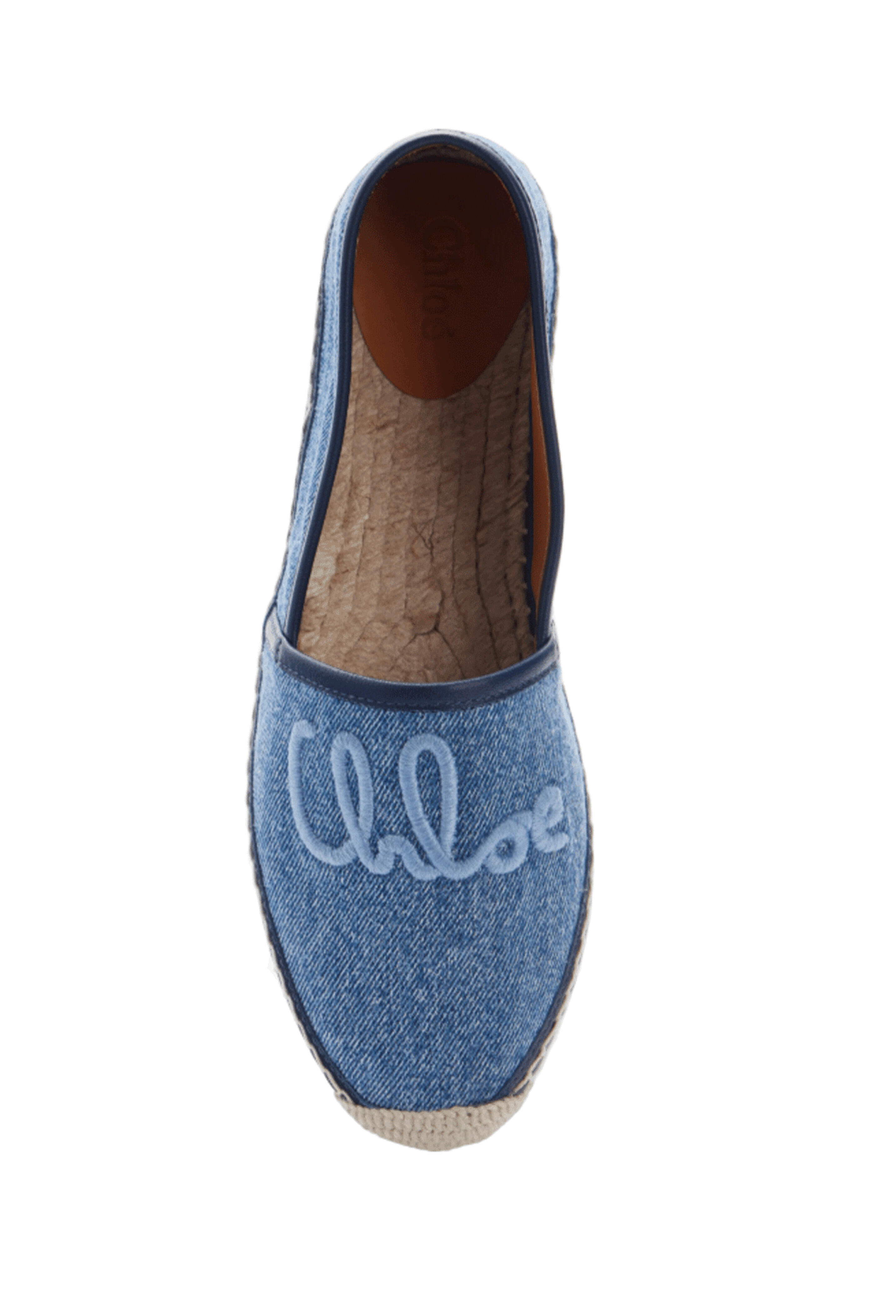 Chloe Isla Embroidered Espadrille in Denim. Almond toe. Slip-on style. Tonal stitching. Logo-embroidered detailing. Denim fabric upper. Leather lining. Jute and rubber sole. Made in Spain.