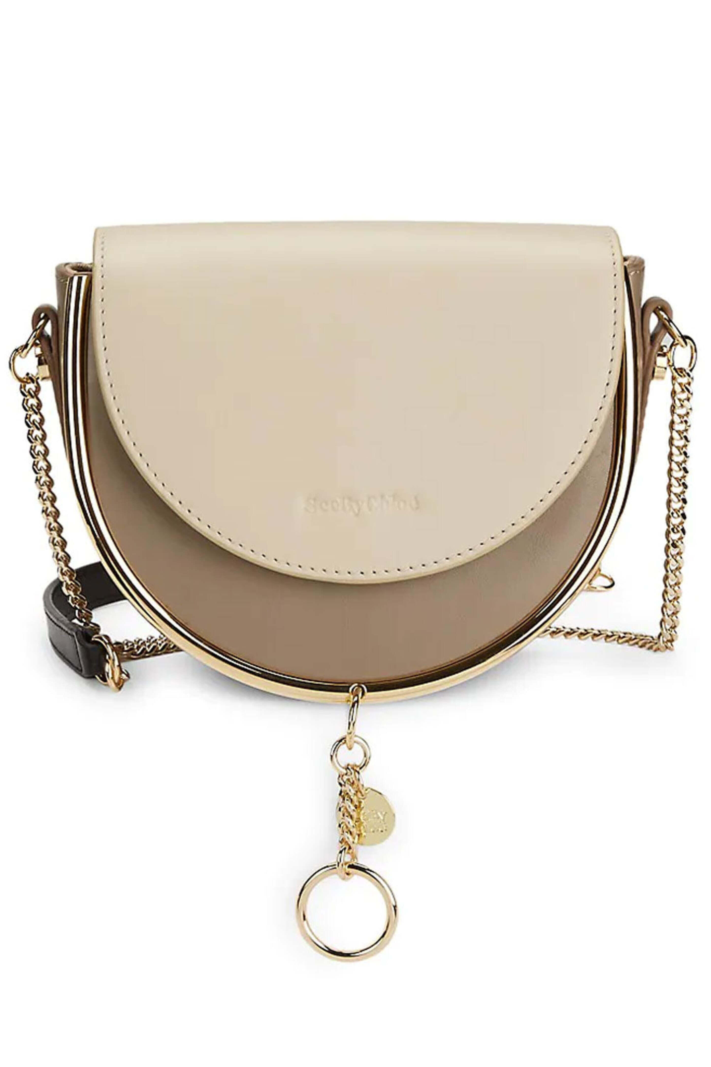 See by Chloe Mara Evening Crossbody Bag in Motty Grey. Flap top with magnetic closure. Chain crossbody strap. Interior slip pocket. Gold tone hardware. Color block leather outer. Lined. 7 W X 5.75 H X 3 D.
