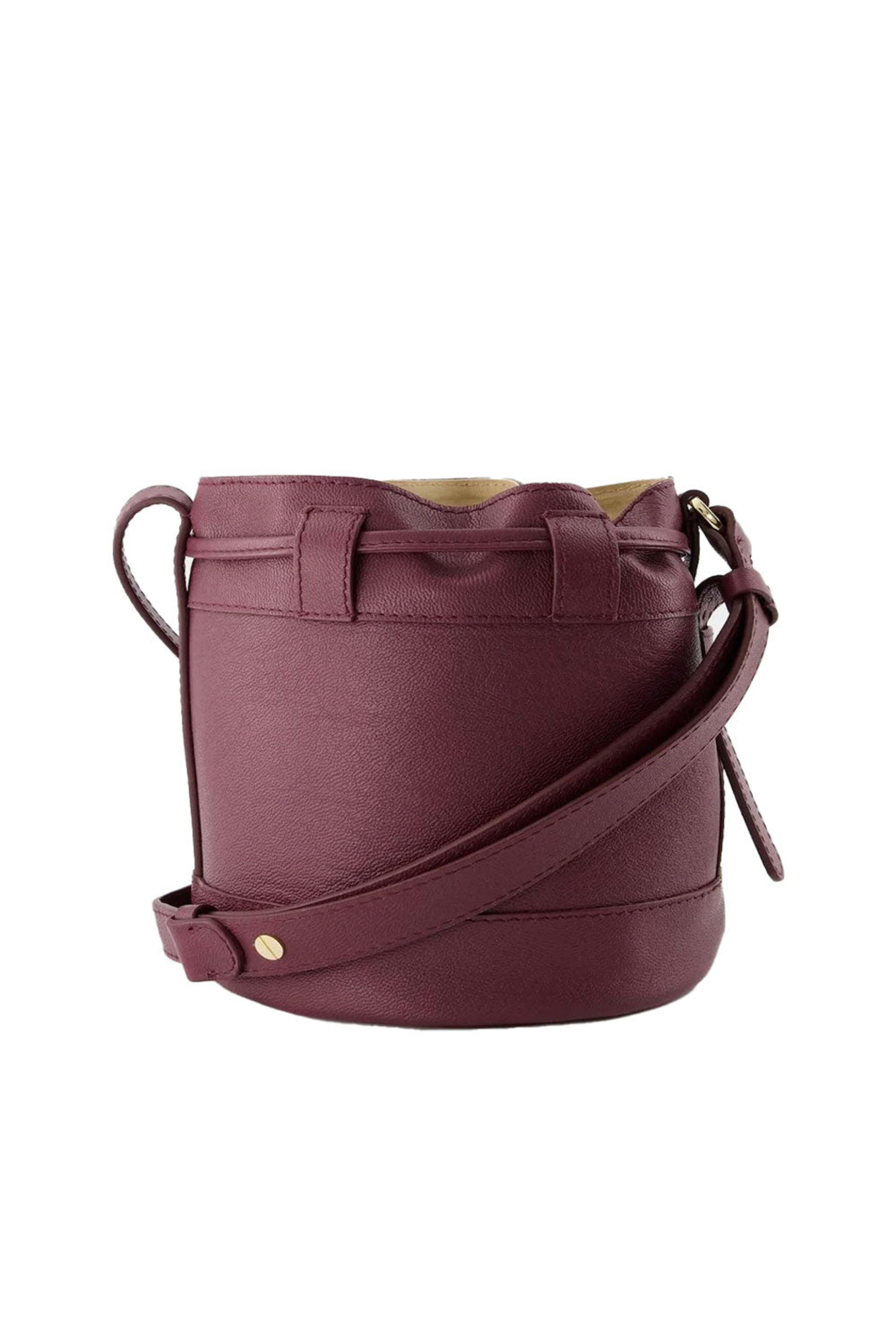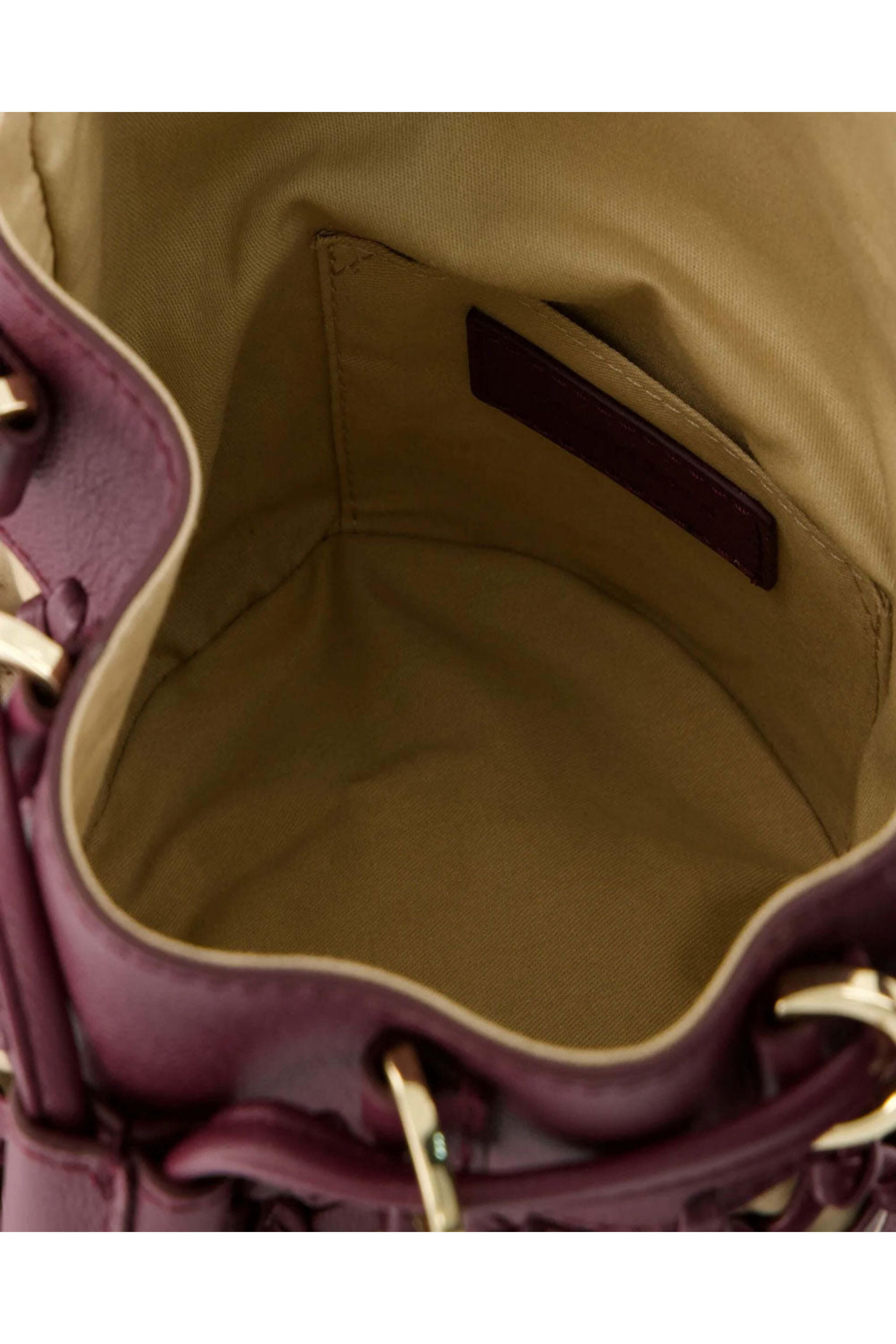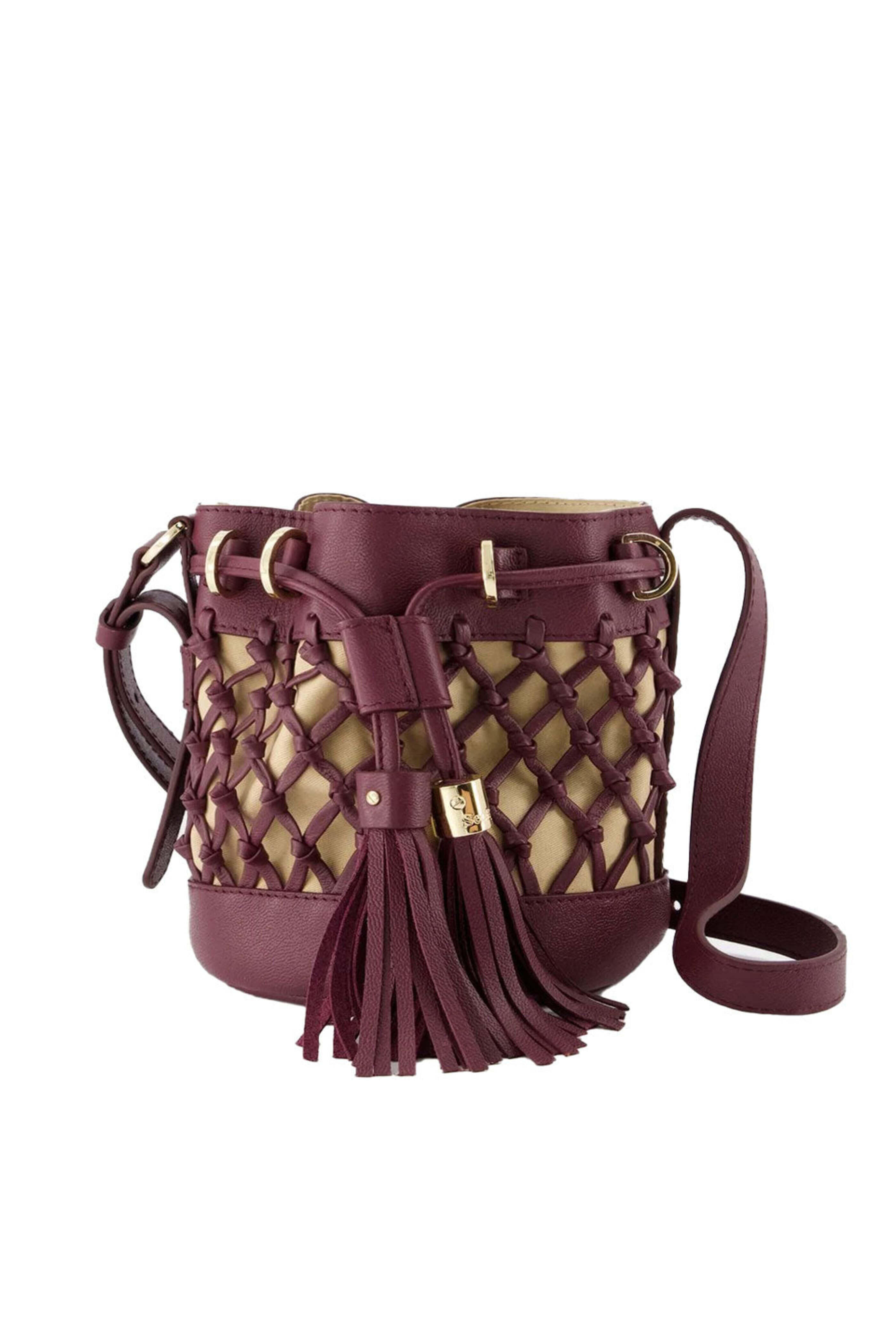 See By Chloe Vicki Bag in Violine. Drawstring closure. Adjustable crossbody strap. Main compartment interior. 1 card slot. Leather tassels. Gold hardware. Leather and cotton outer. Cotton lining. 9W x 7.1H x 5.9D. 3 strap drop.