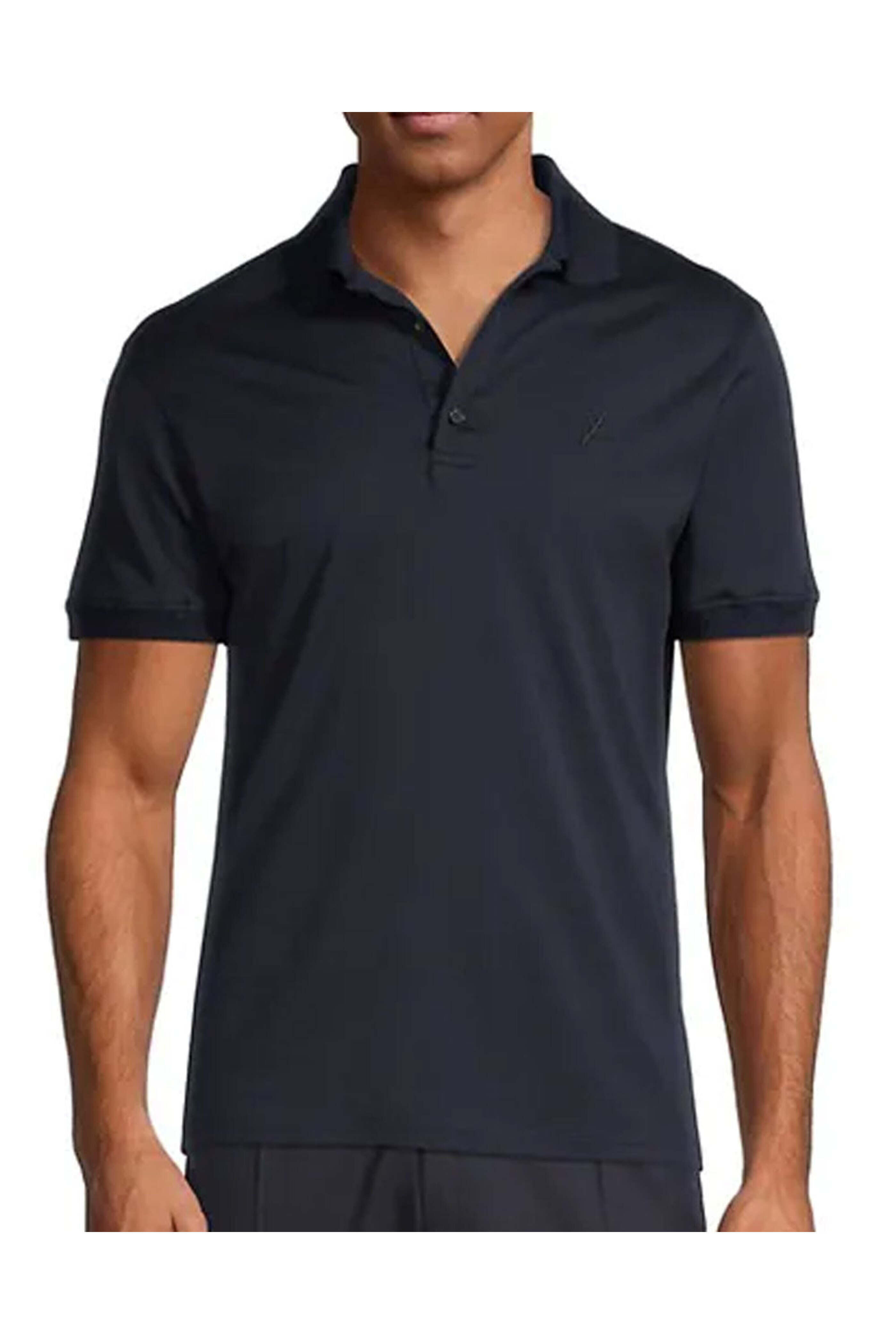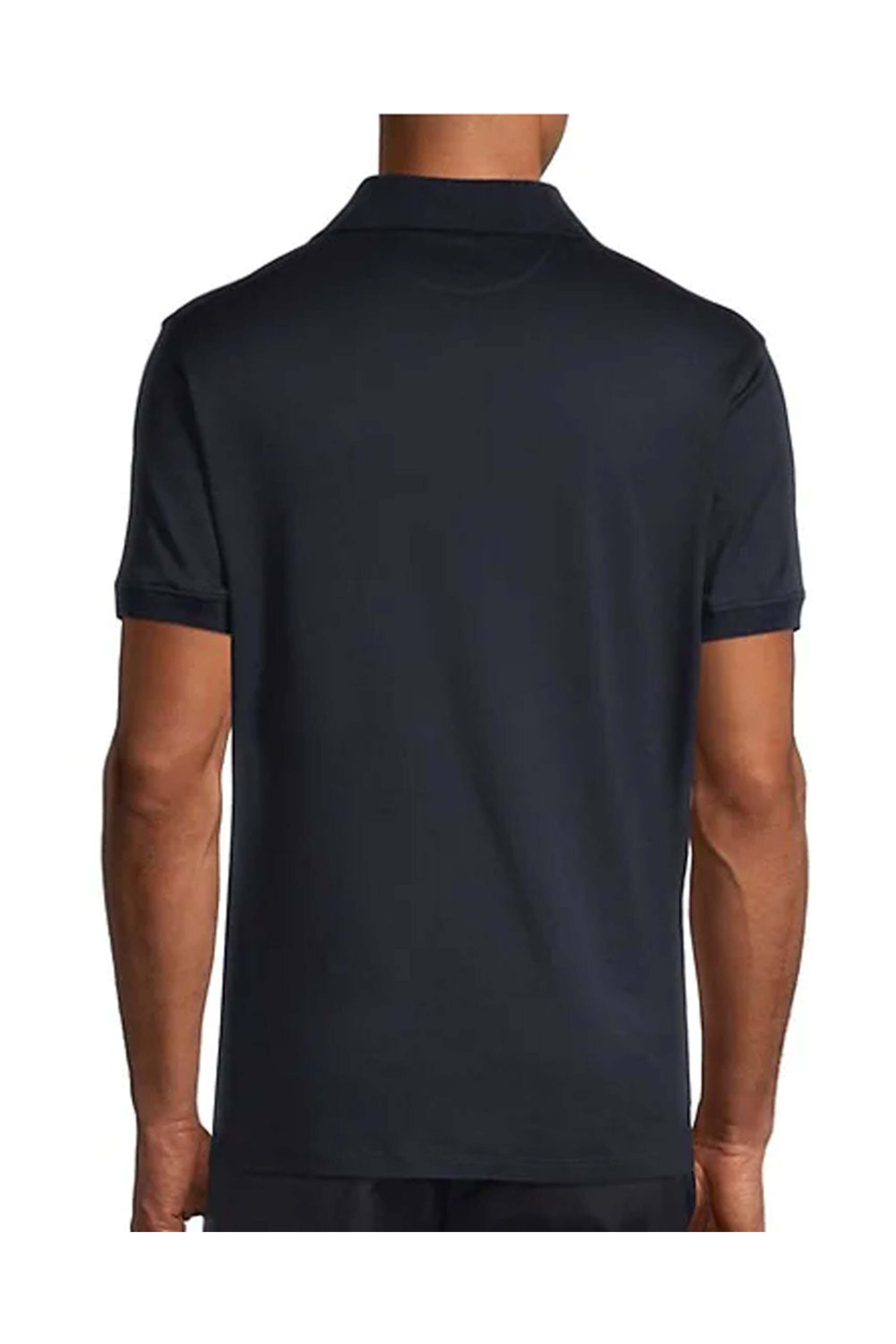 Isaia Navy Logo Embroidered Polo. Spread collar. Three button polo. Short sleeves. Pull over style. Made in Italy. 100% cotton.