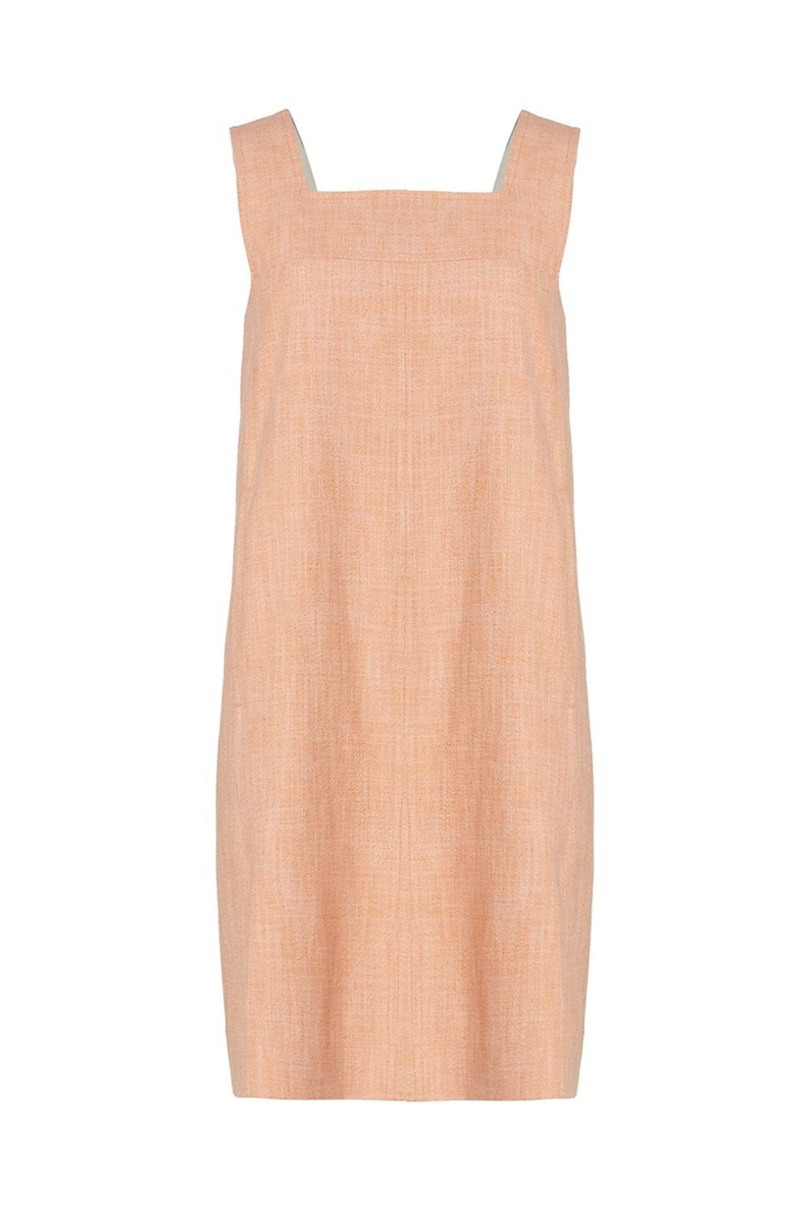 See by Chloe Blondie Pink Pinafore Dress. Square neck. Square back. Sleeveless; thick shoulder straps. Concealed back zip closure. Side slip pockets. Relaxed fit. Shift silhouette. Mini length. Lined. 56% cotton, 44% linen/ flax outer, 100% cotton lining.
