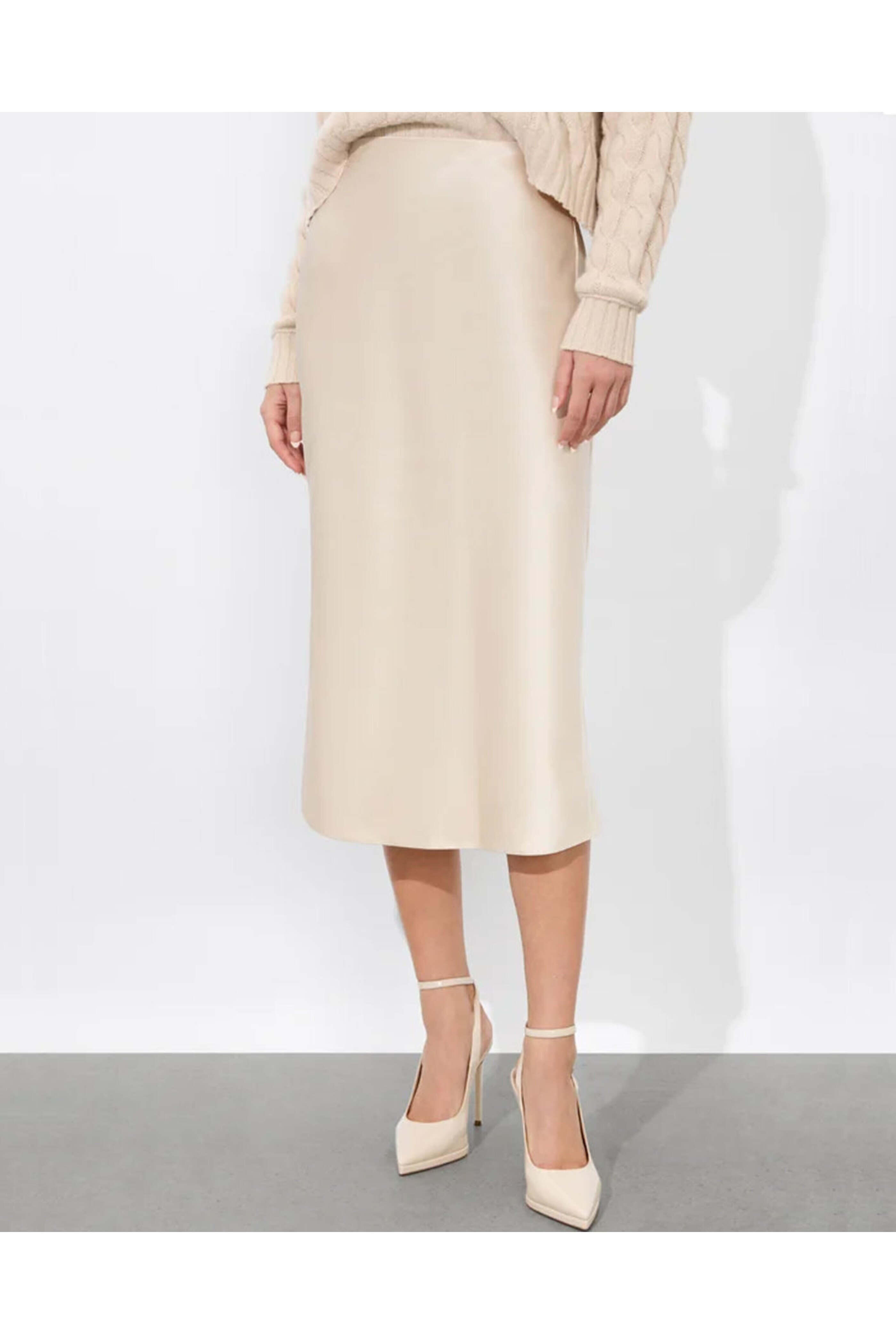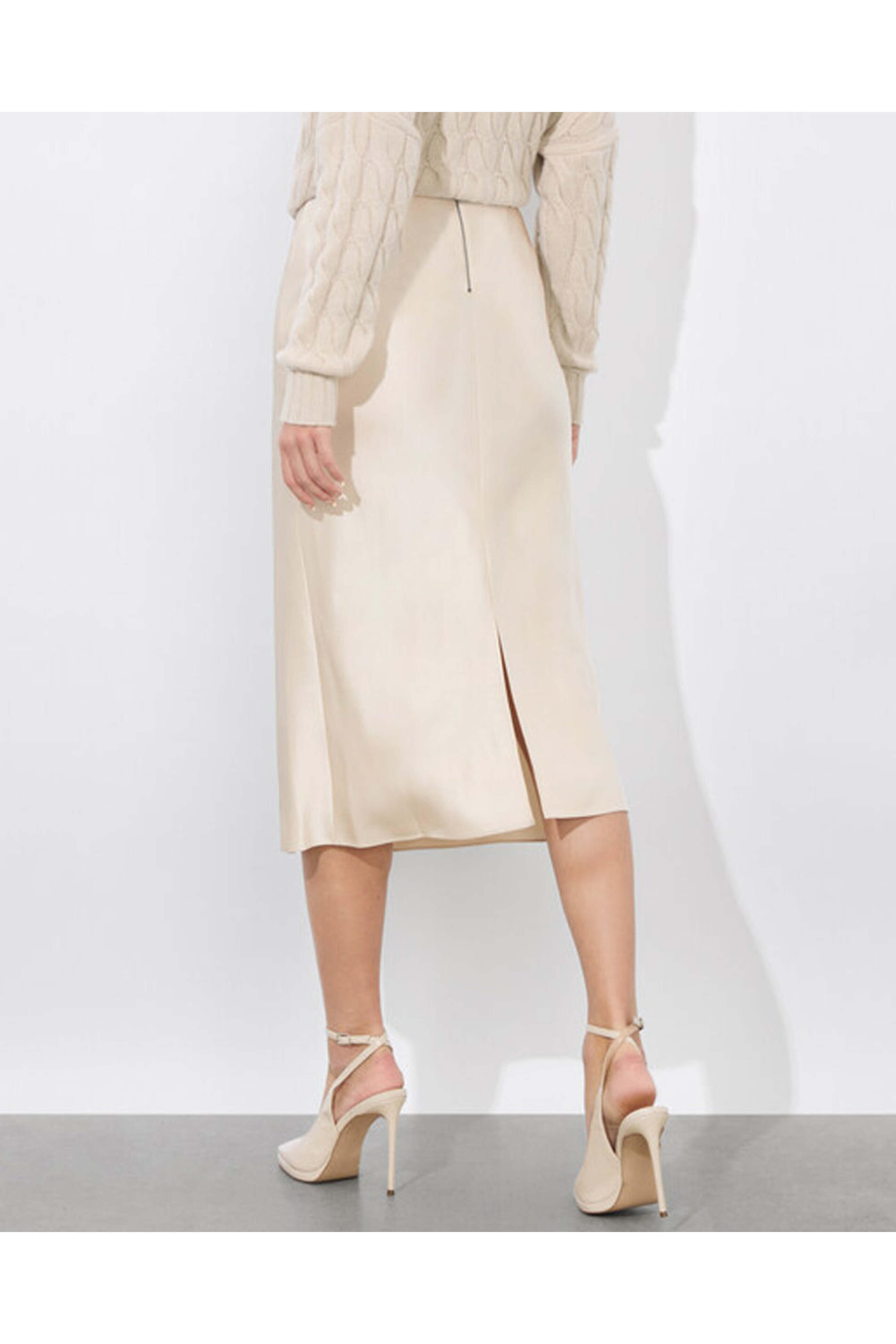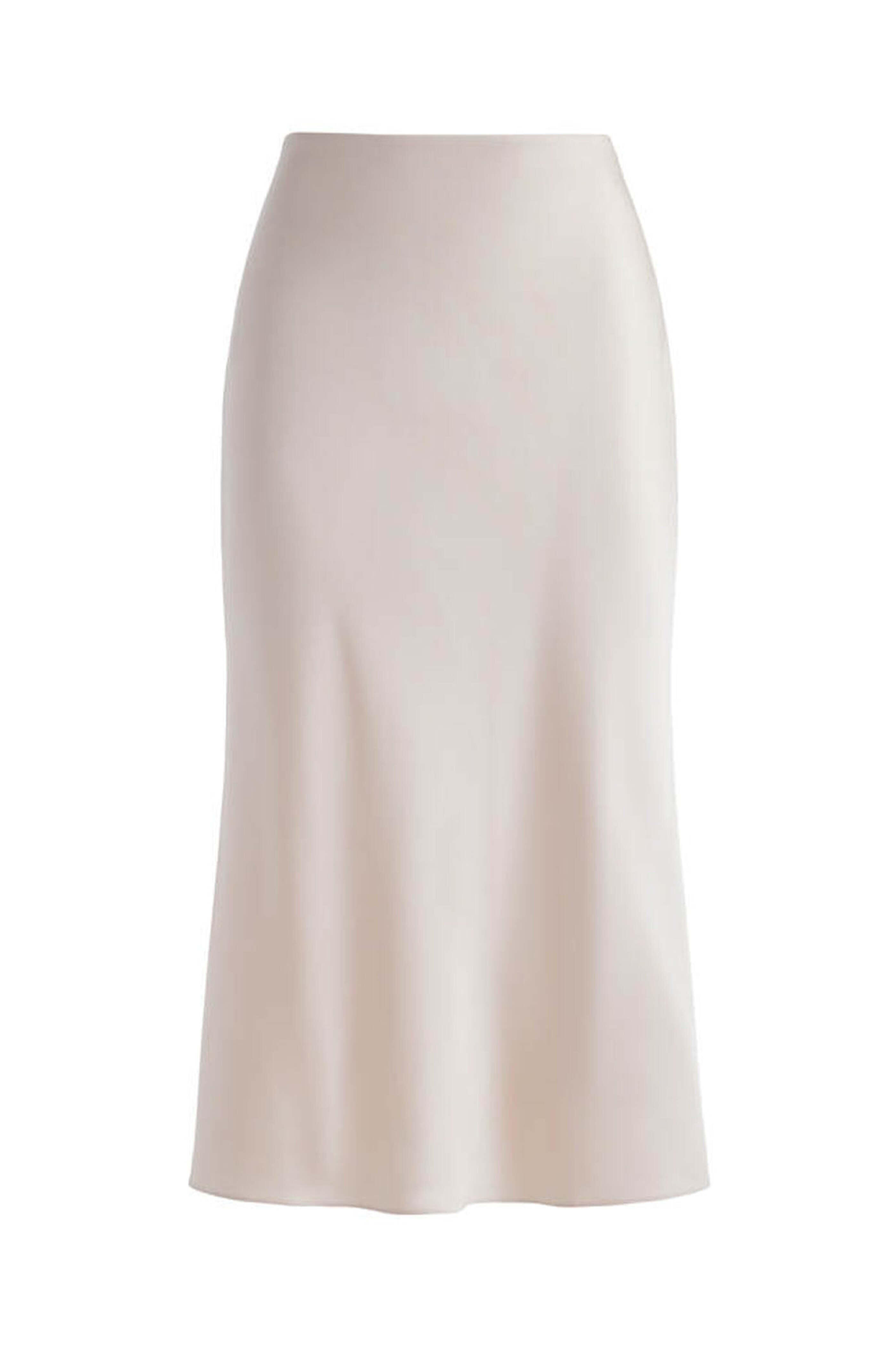 Alice + Olivia Chino Maeve Midi Slip Skirt. High rise. Flat waist. Back zip closure. Slip silhouette. Midi length. Back hem vent. 100% polyester.