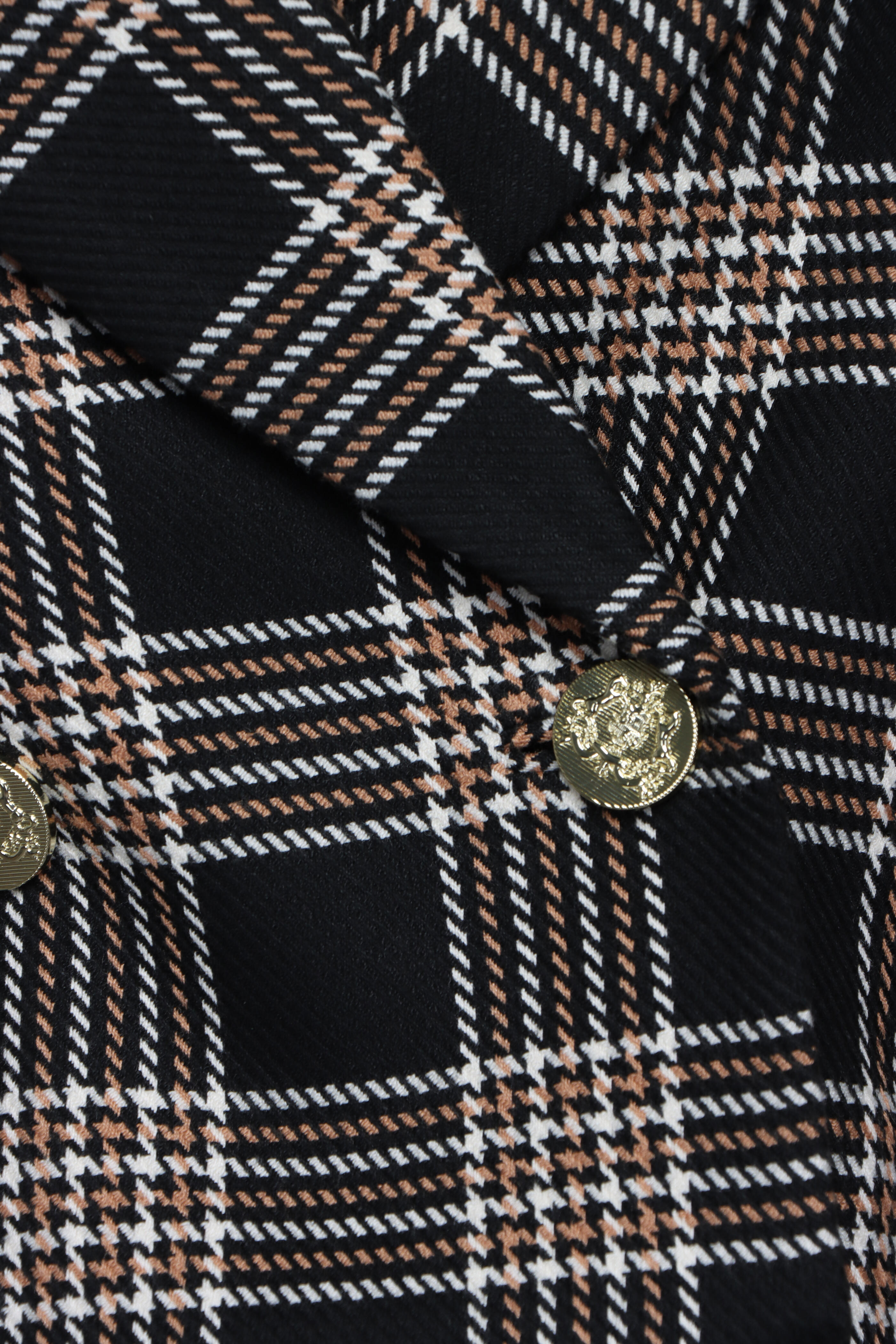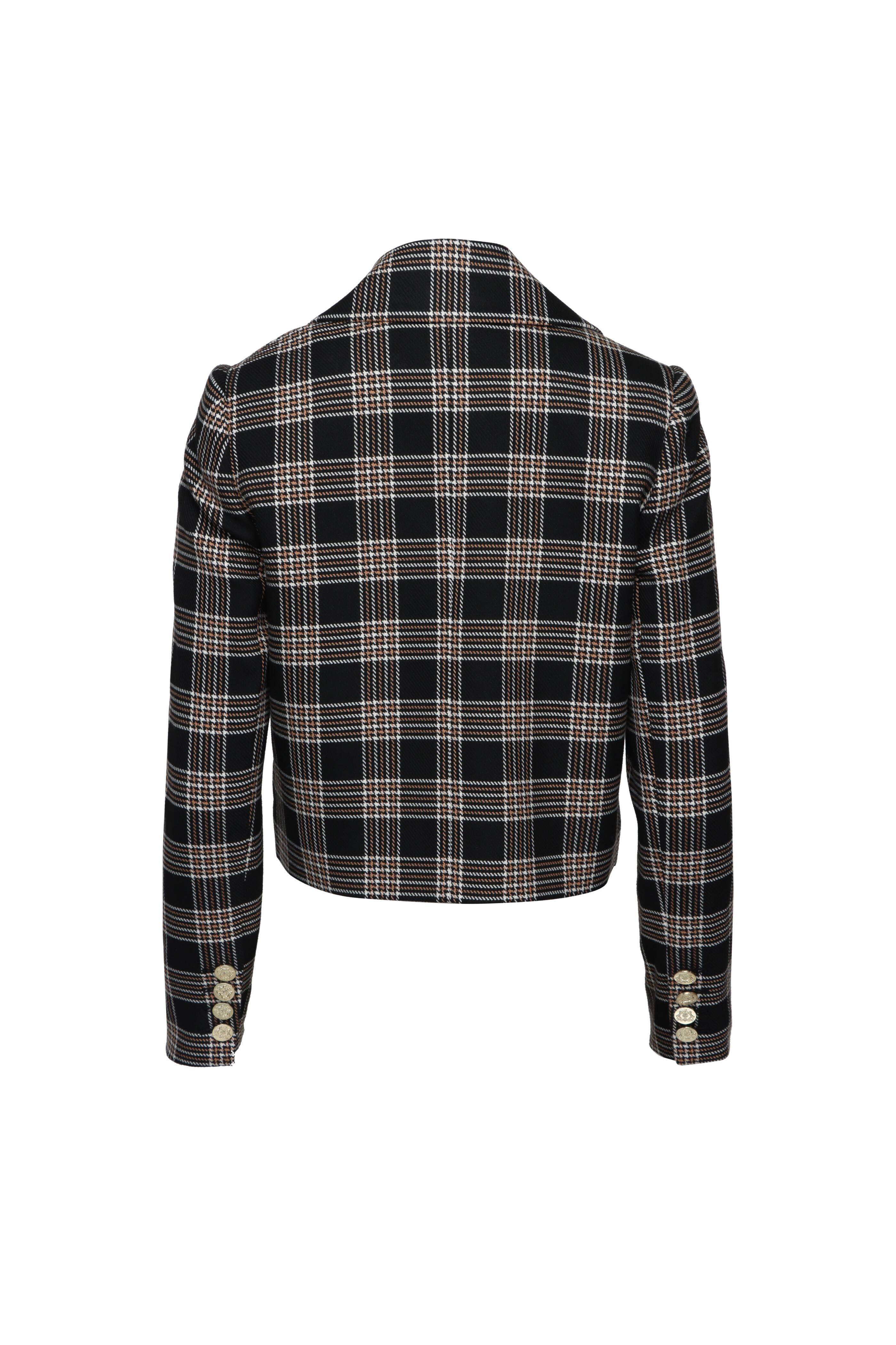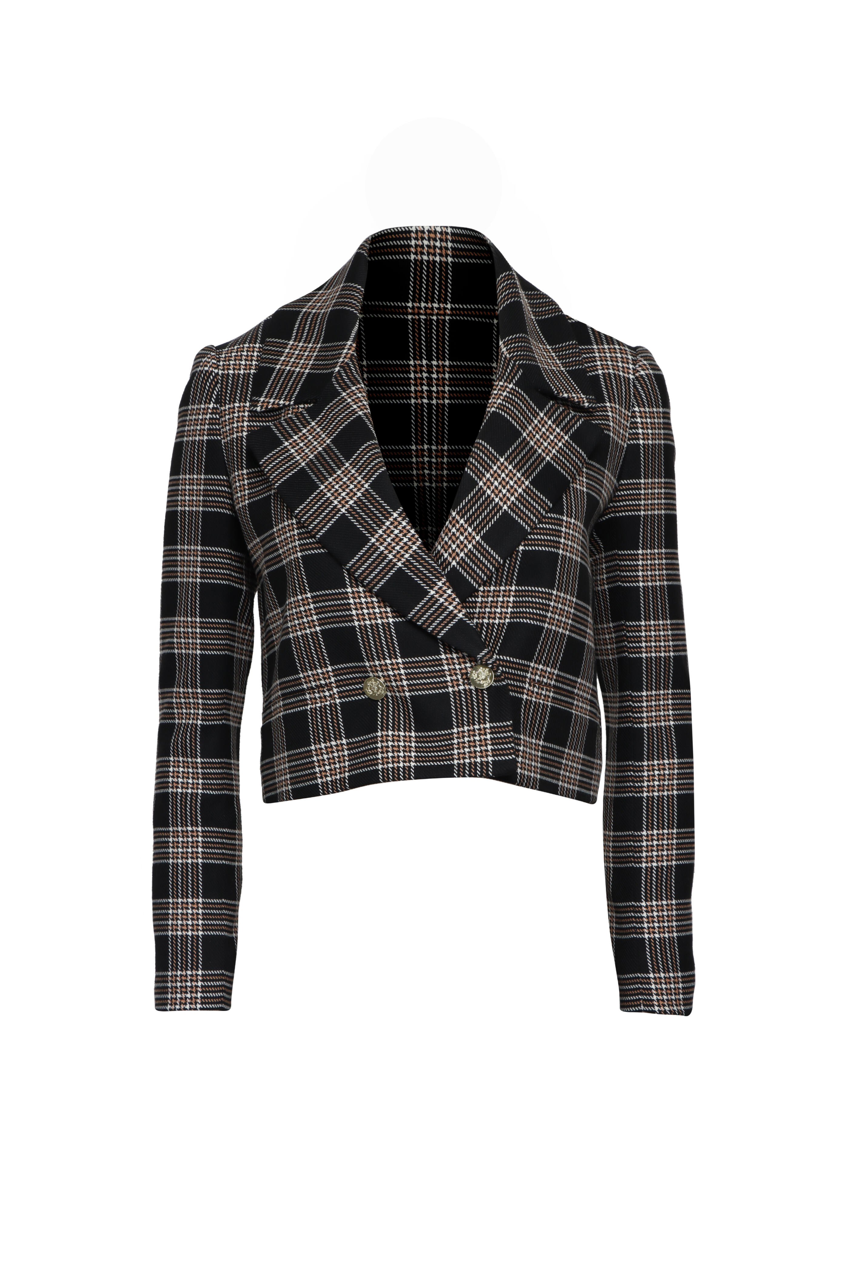 Notch lapel. Long sleeves. Double breasted front button closure. Imported. Length 19.5” (Size S). Cropped length. 65% recycled polyester, 32% viscose, 3% elastane. Dry clean.