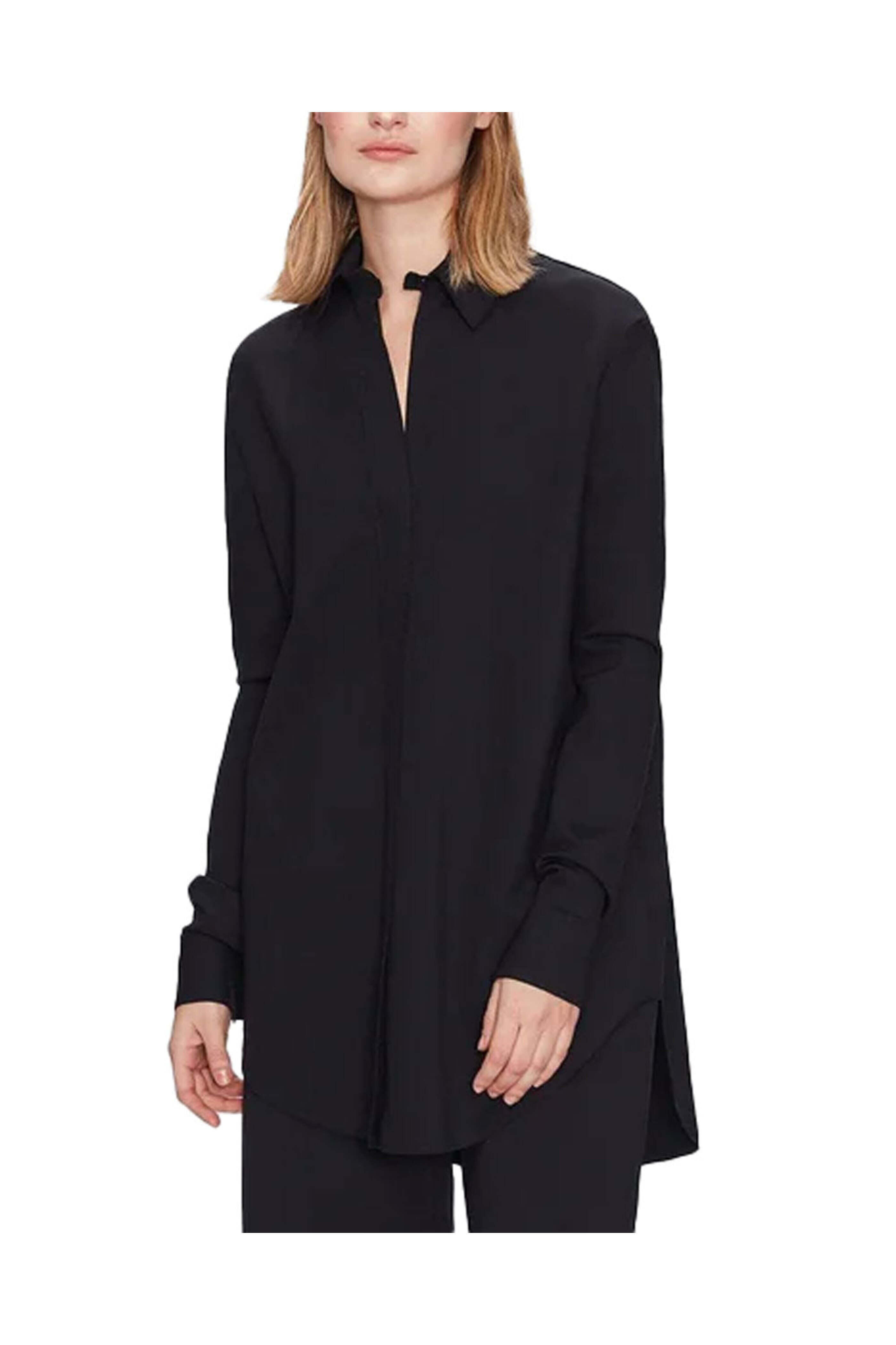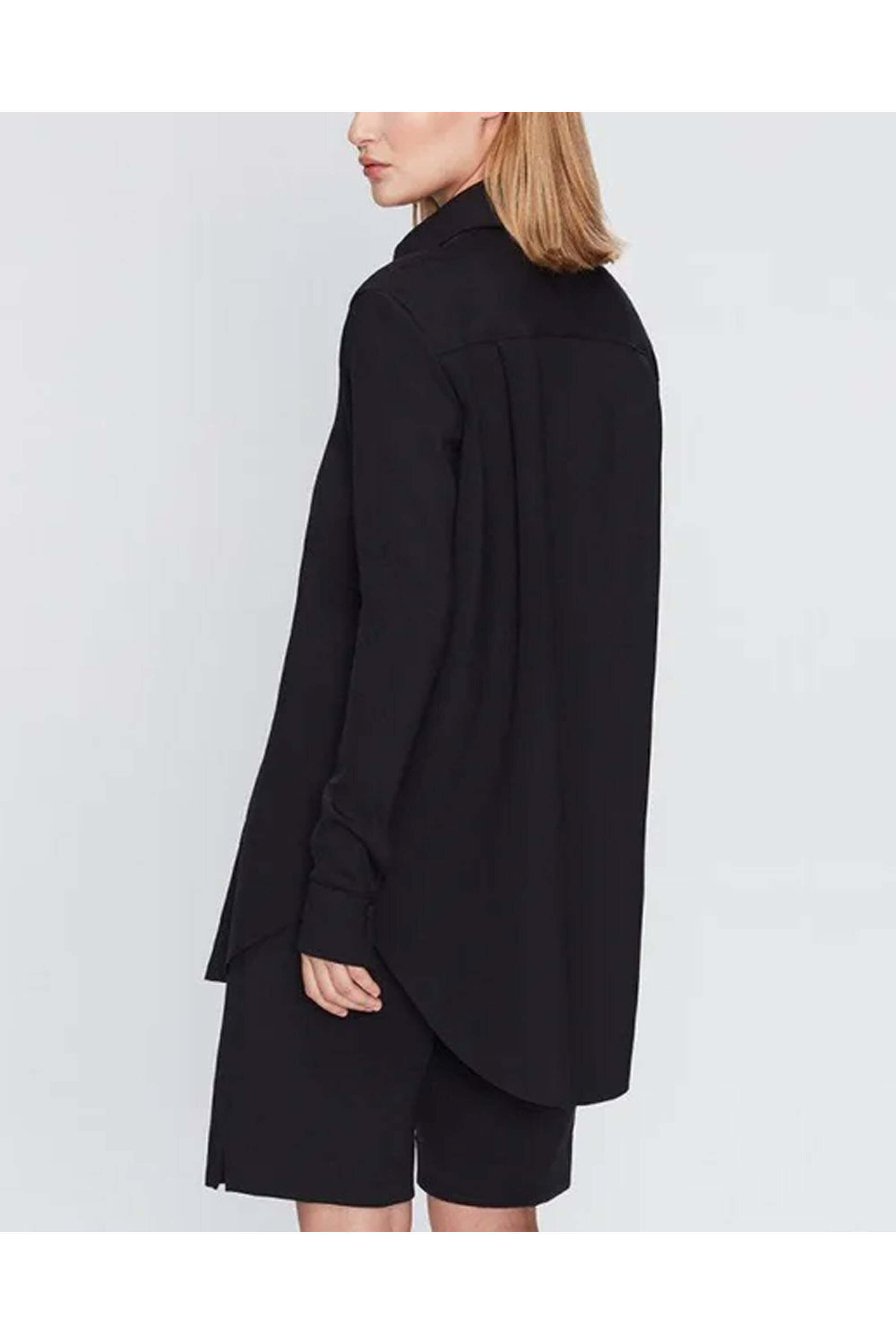 Marie Saint Pierre Black Tile Shirt. Collar. Long sleeves ; button cuffs. Concealed zip front closure. Tunic silhouette. Rounded hem. Mid thigh length. Made in Montreal. 86% polyamide, 14% elastane.