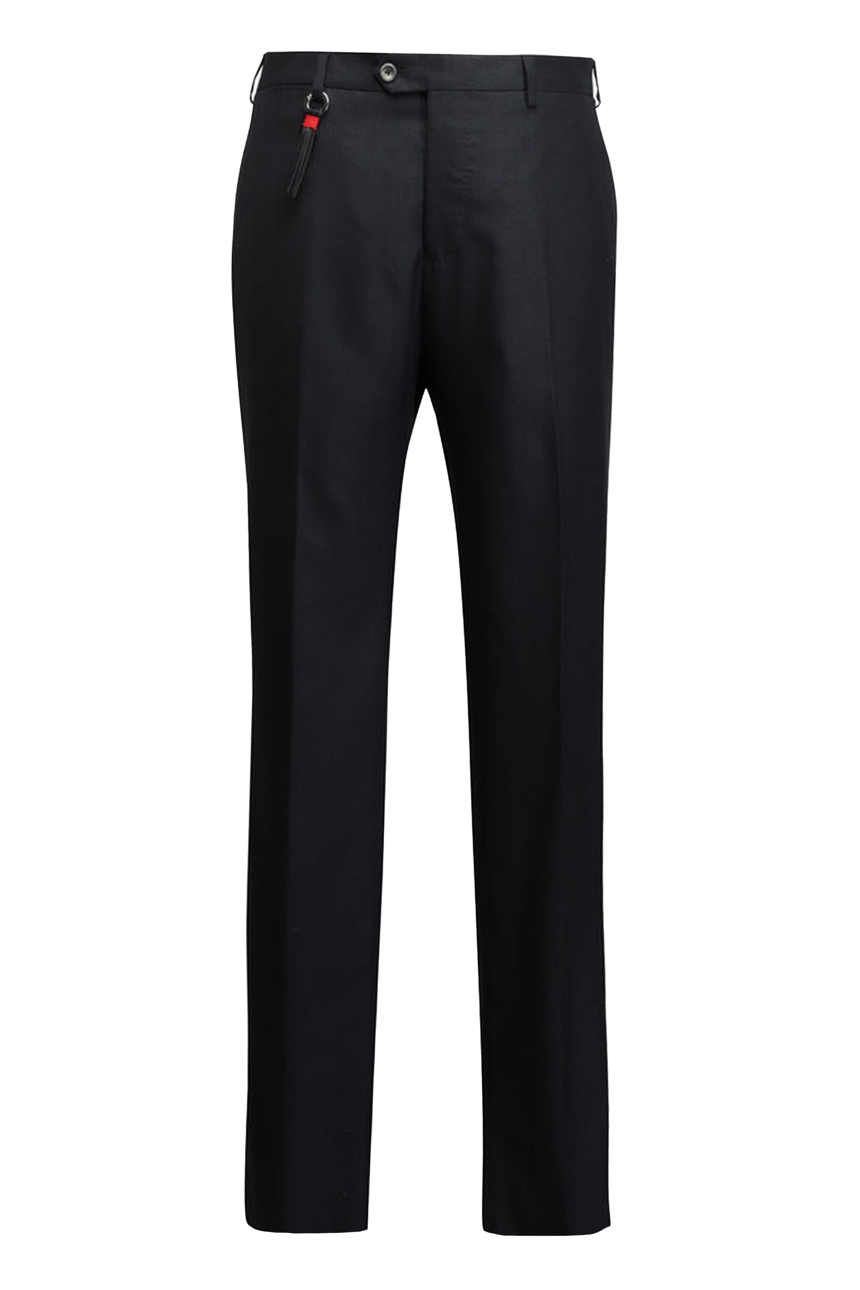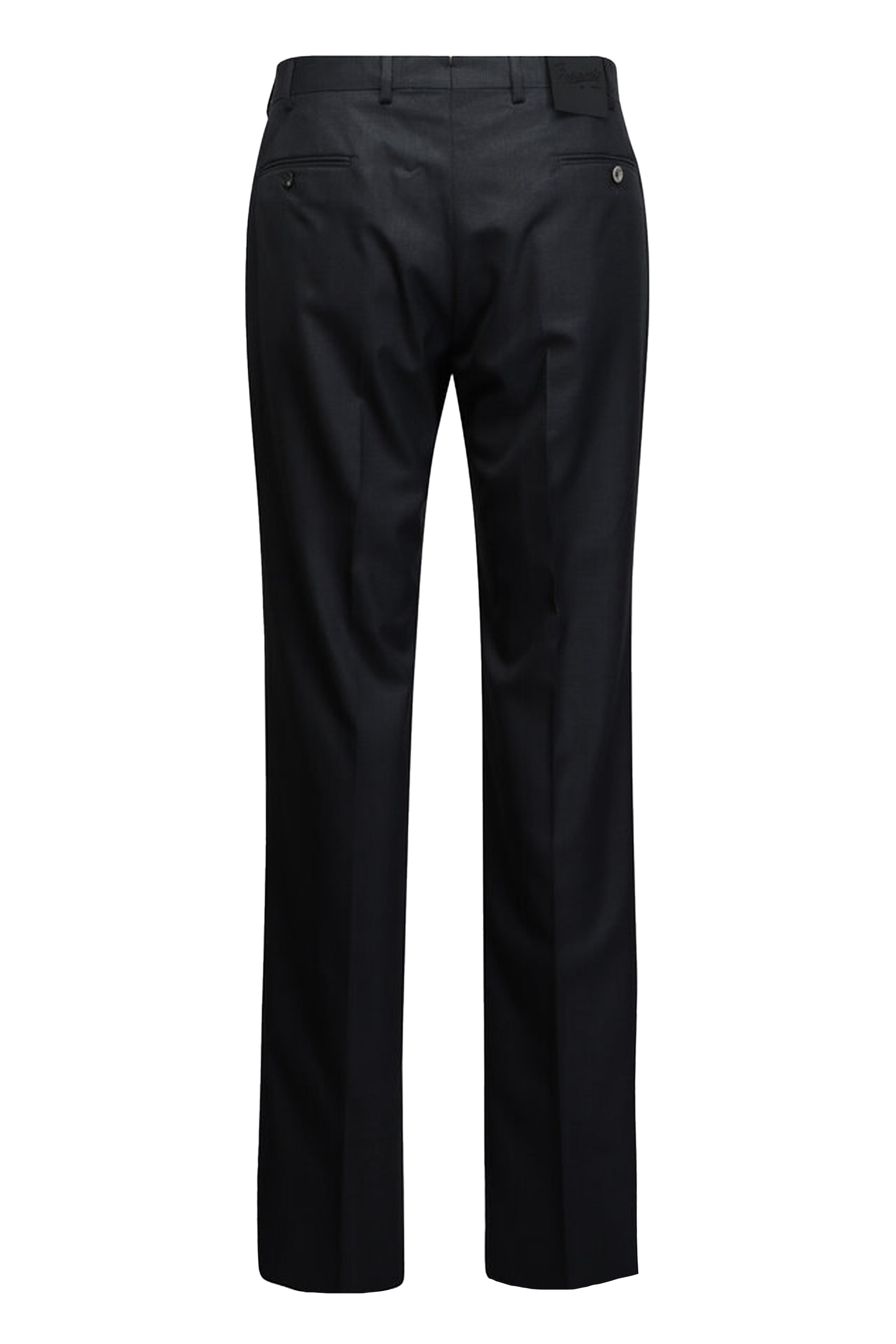 Zip fly; extended button tab. Banded waist; belt loops. Side slip pockets; back button besom pockets. Made in Italy. Inseam 32". 100% wool. Dry clean.