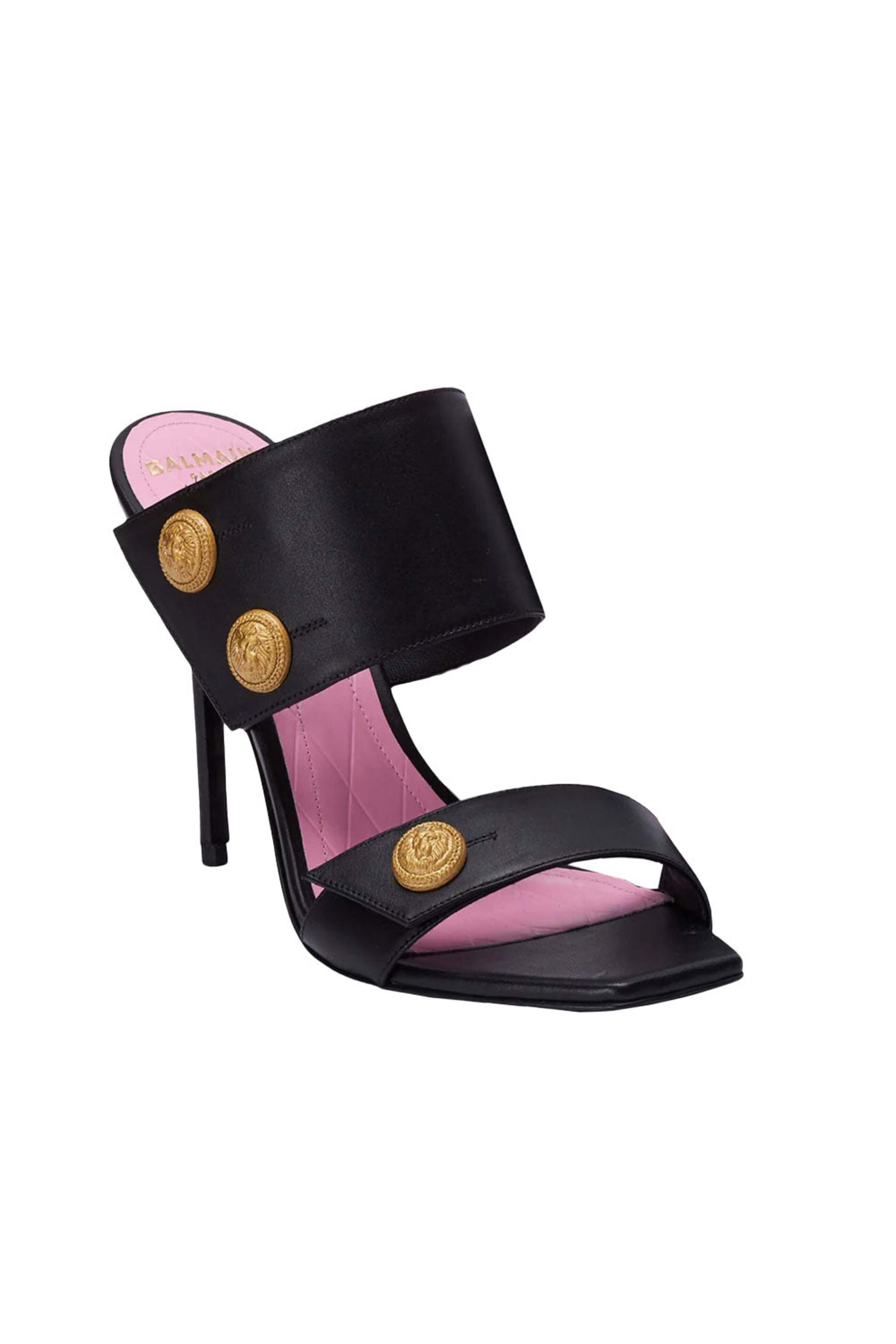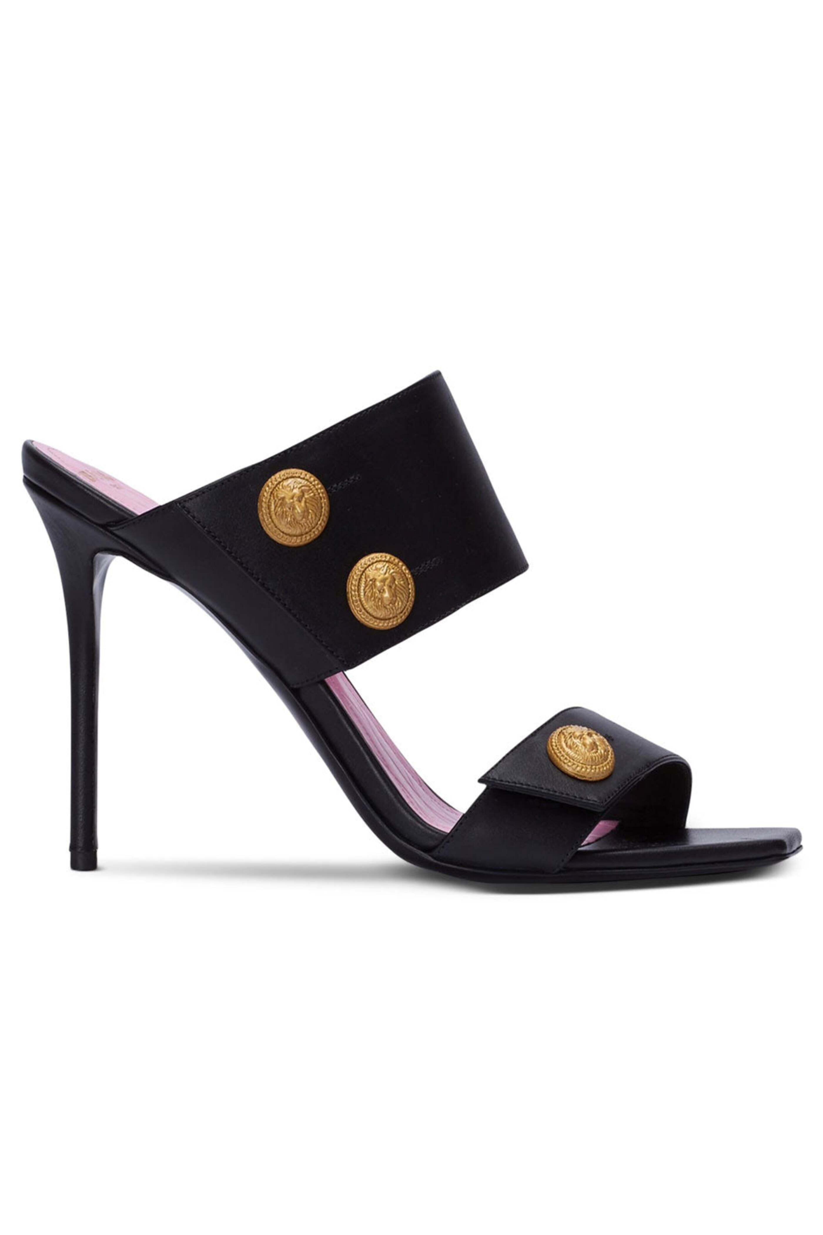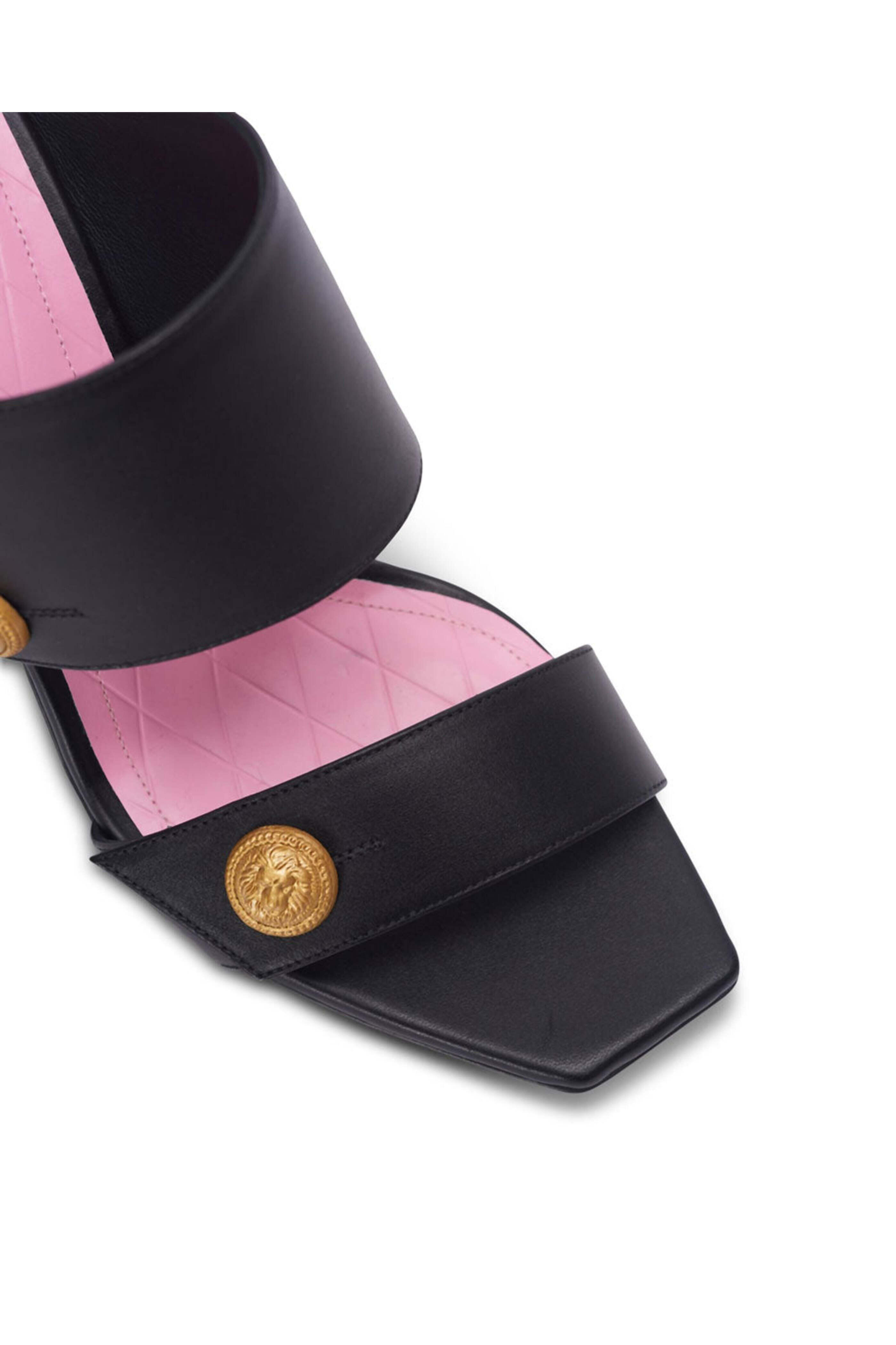Balmain Leather Eva Mule in Black. Square open toe. Slip-on style. Embossed buttons. Leather upper, lining, and sole. 3.7 (95 mm) stiletto heel. Made in Italy.