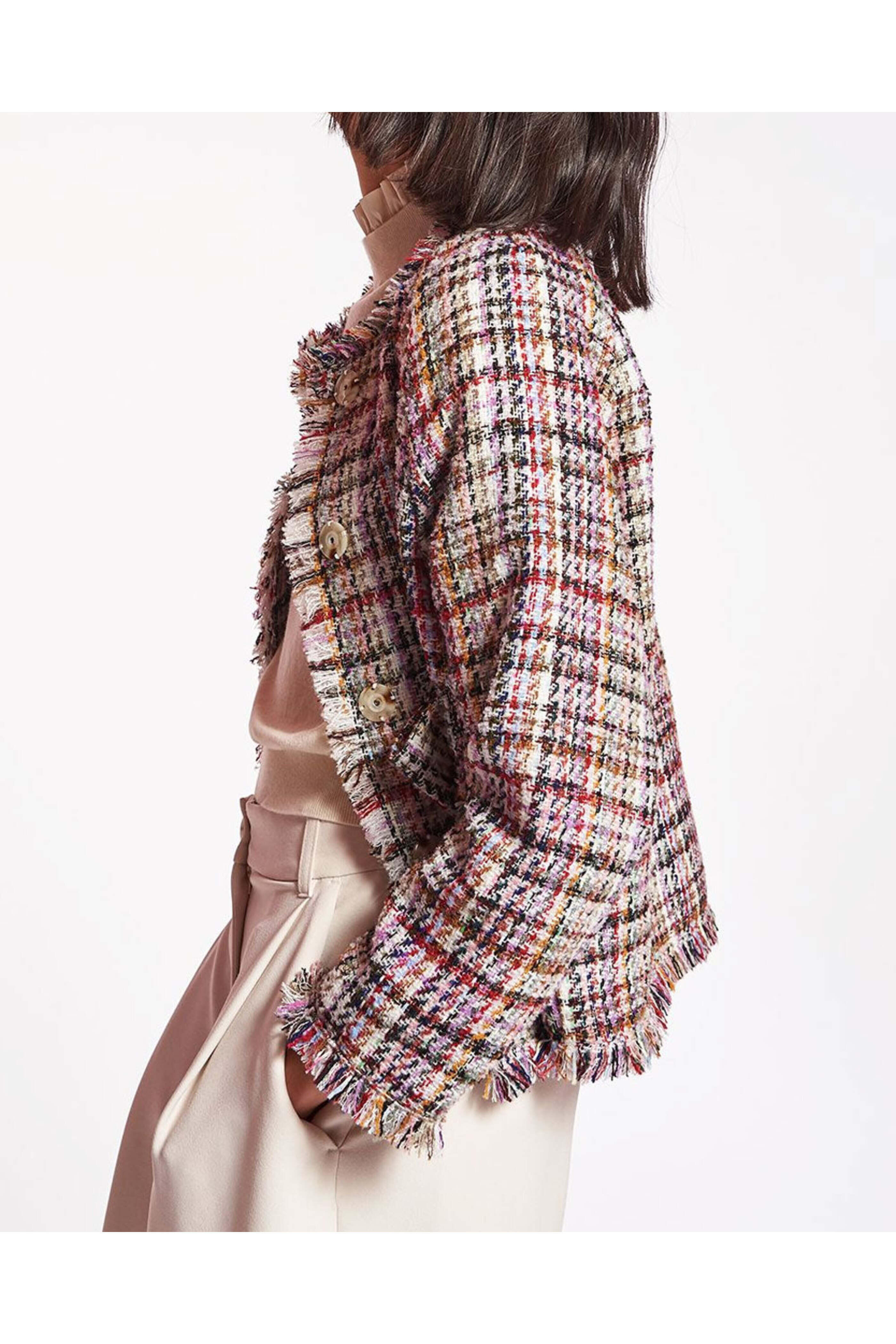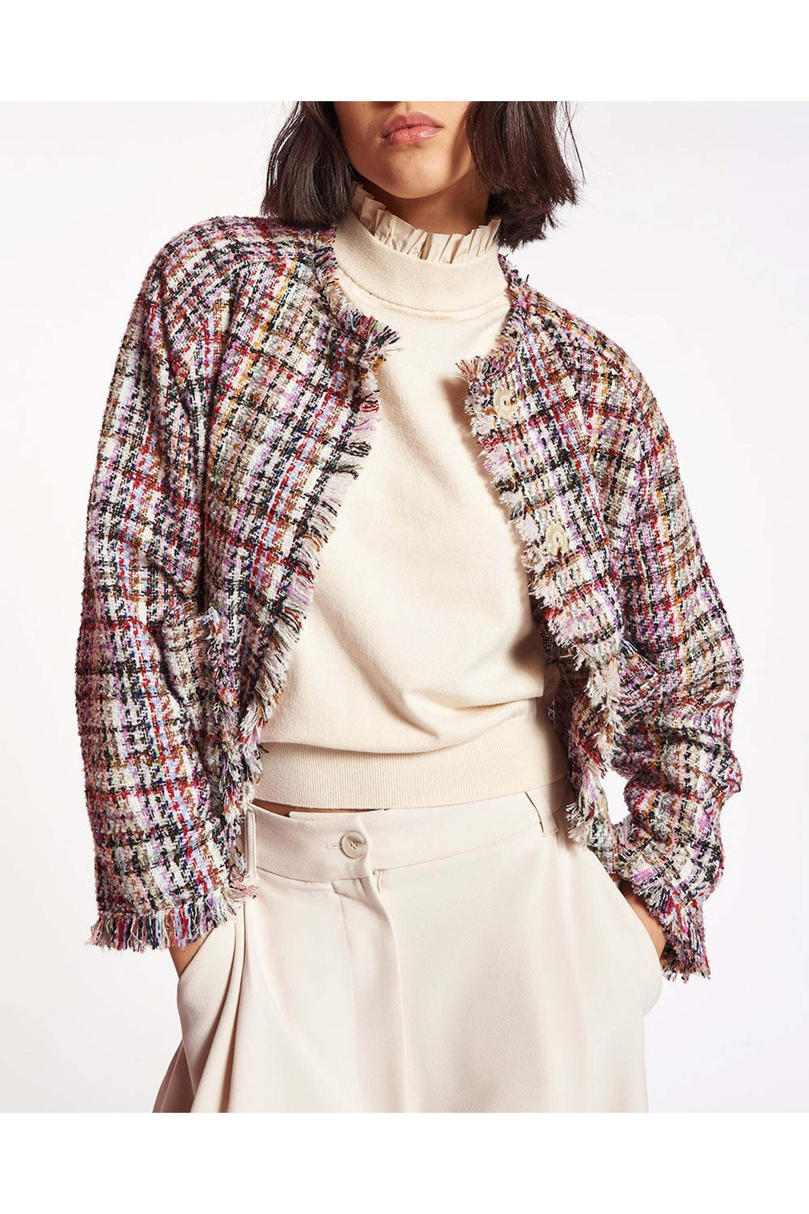 - Essentiel Antwerp Off White Tweed Fringe Jacket