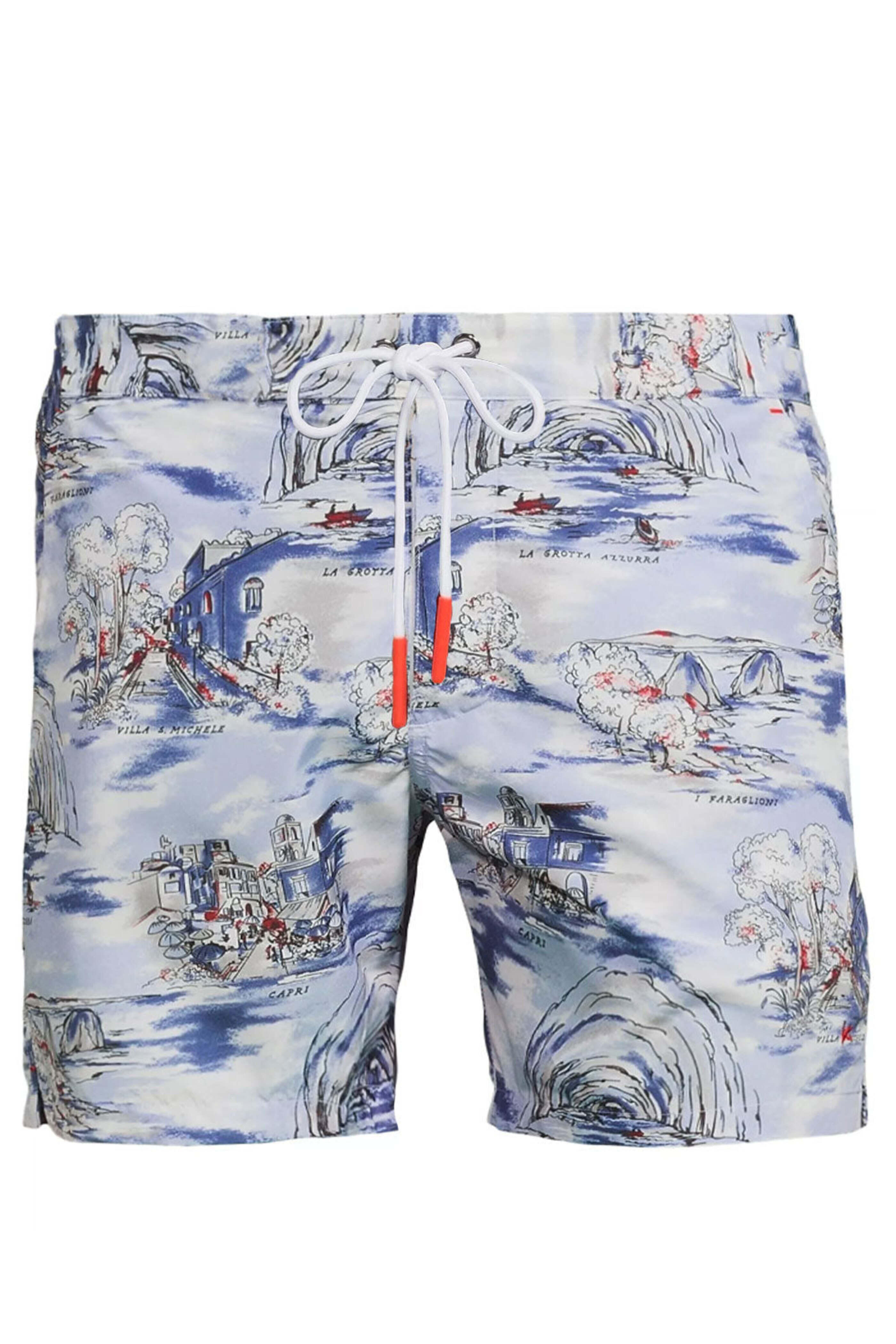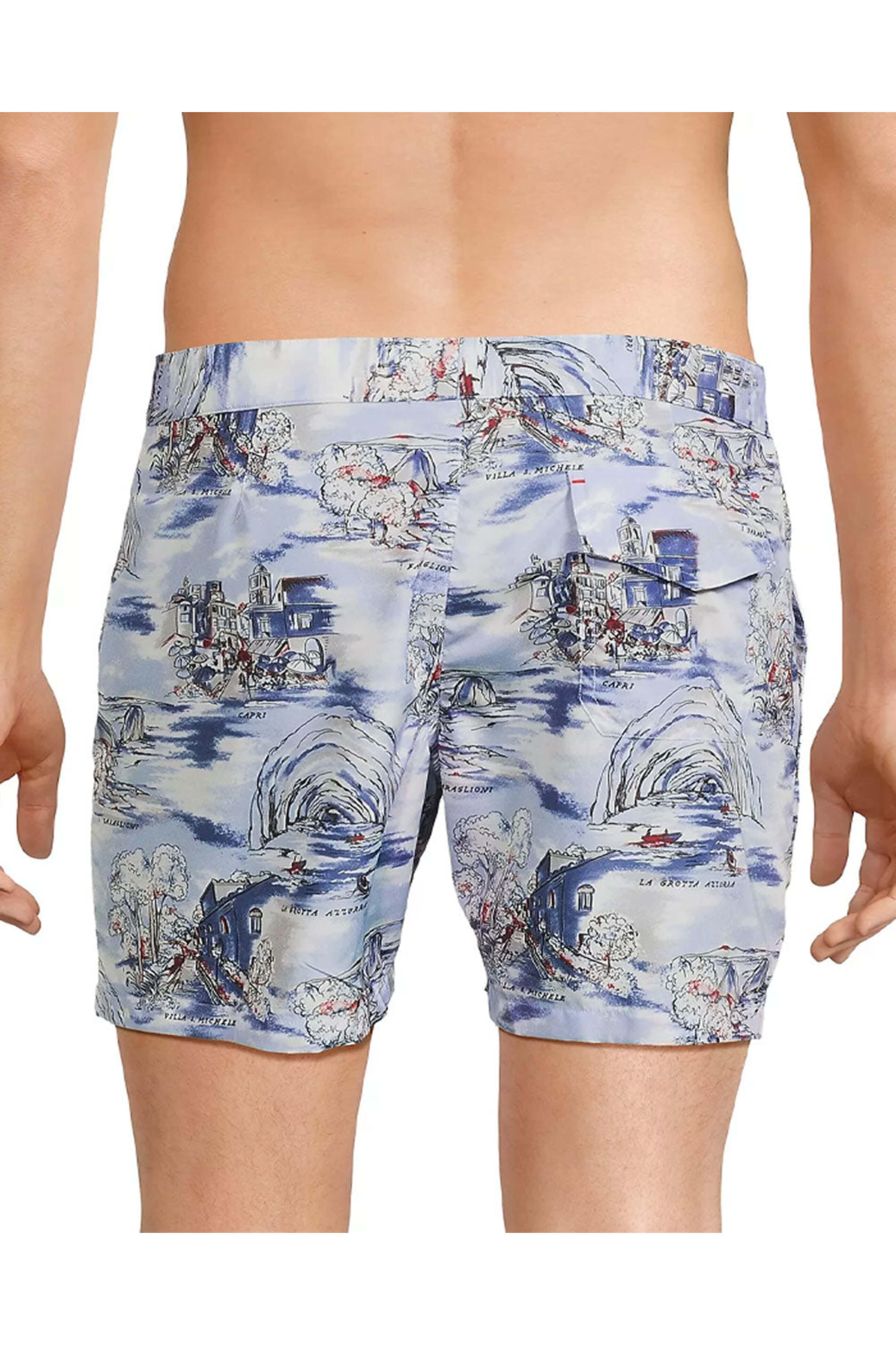 Isaia Blue Watercolor Swim Short. Flat front. Elasticized waistband with drawstring closure. Side slip pockets. Rear flap pocket. Mesh lining. Made in Italy. 100% polyester.