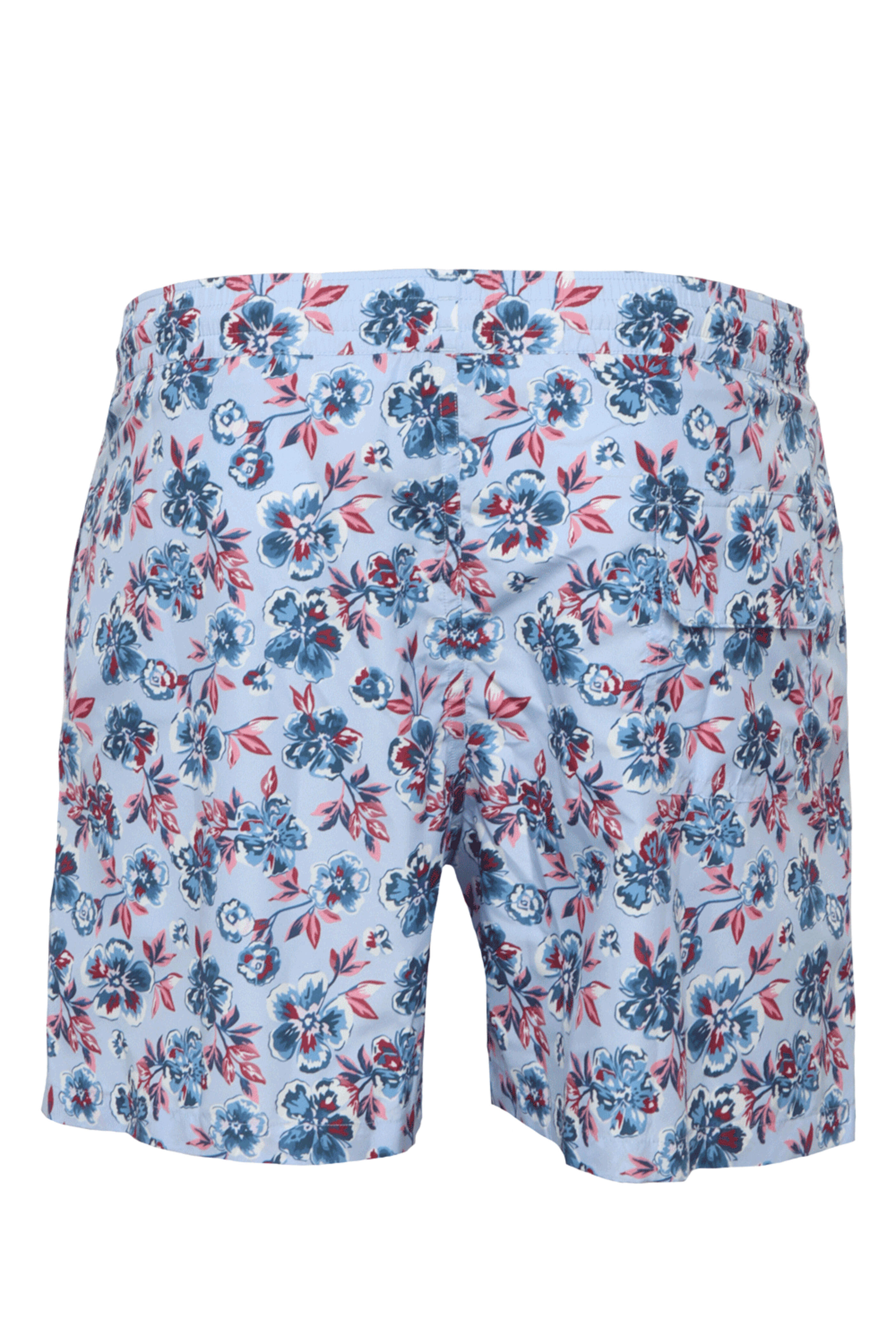 Isaia Pastel Floral Fantasia Swim Short. Flat front. Elasticated waistband with drawstring closure. Side pockets. Single back pocket with velcro fastening. Side vents. Made in Italy. 100% polyester.