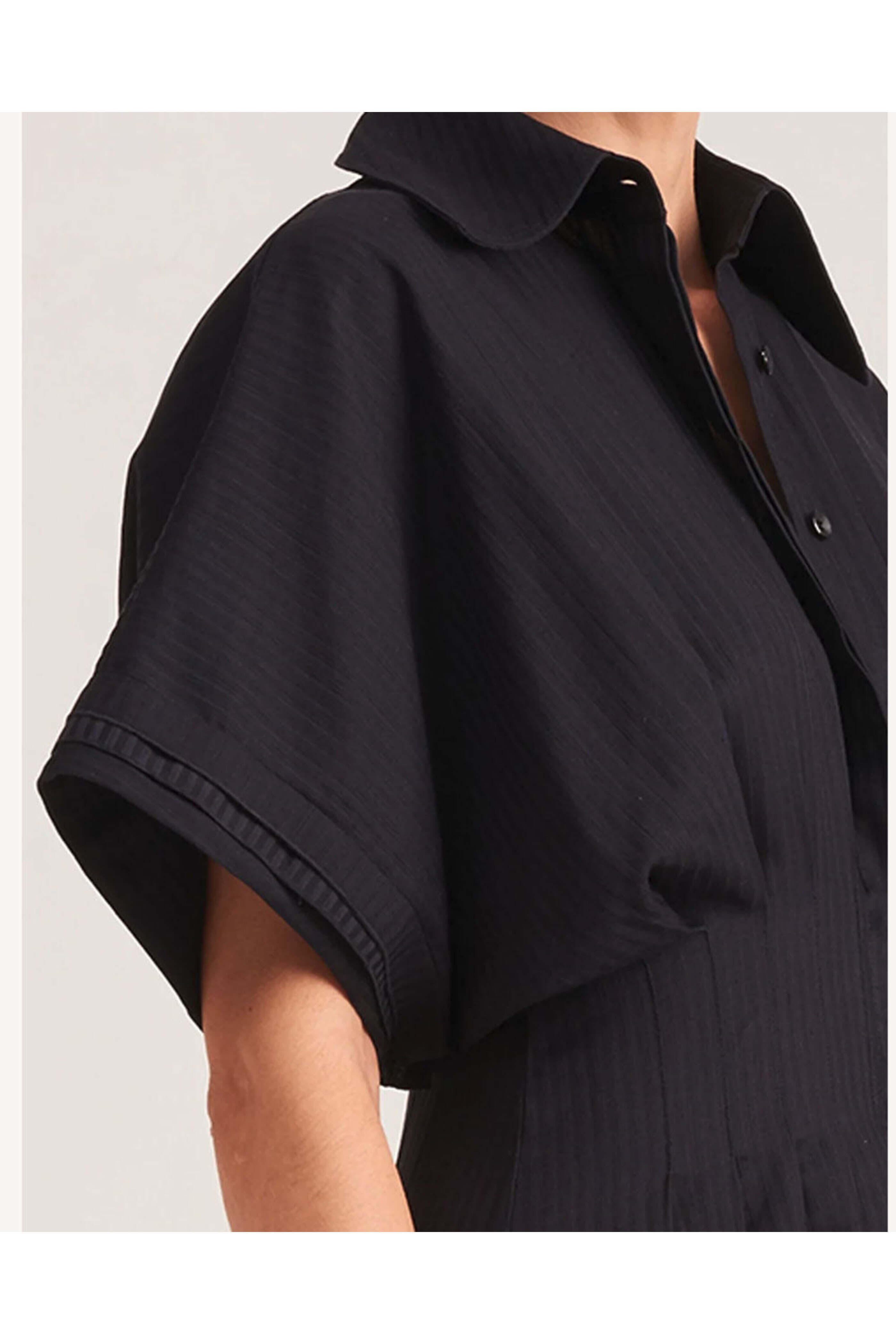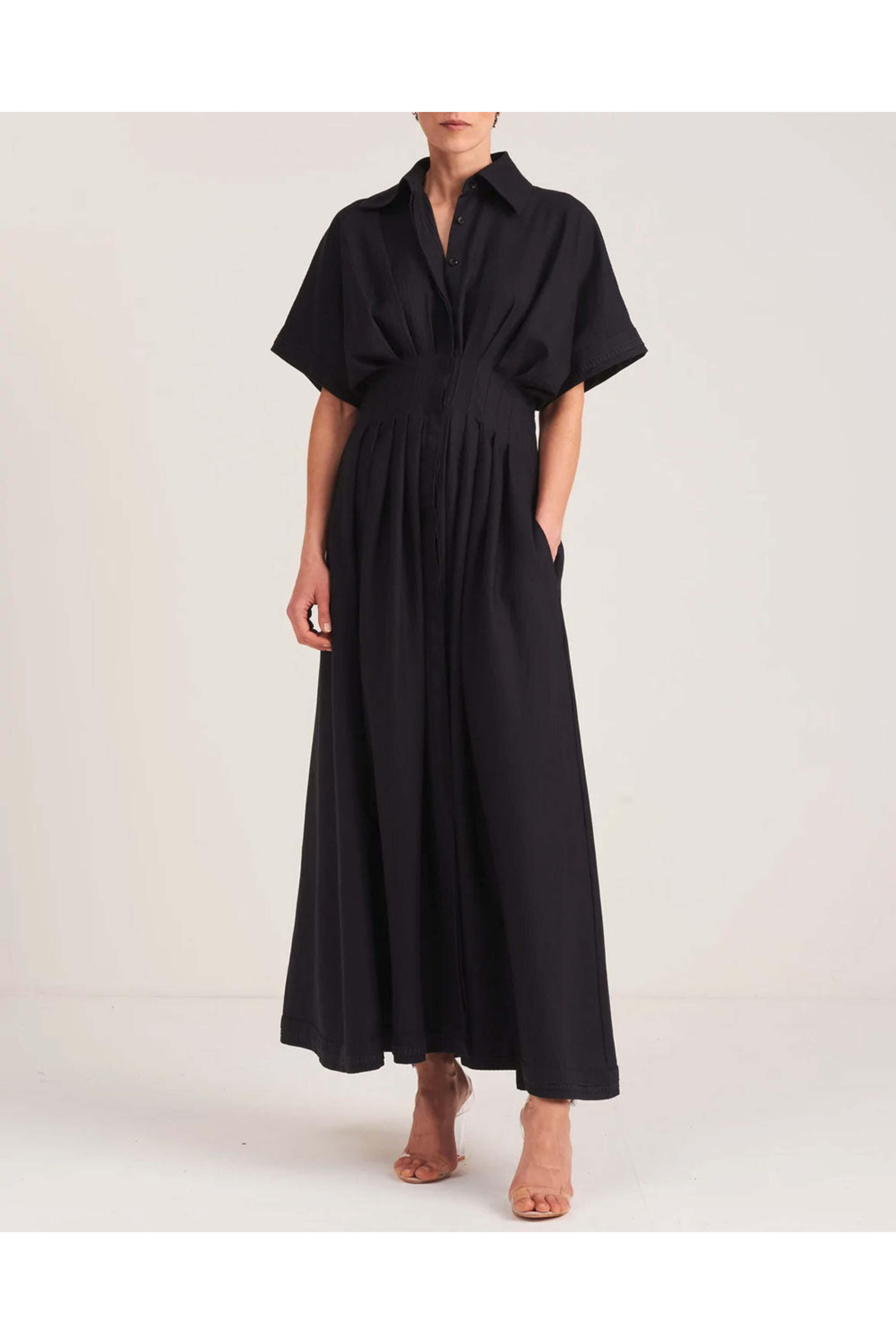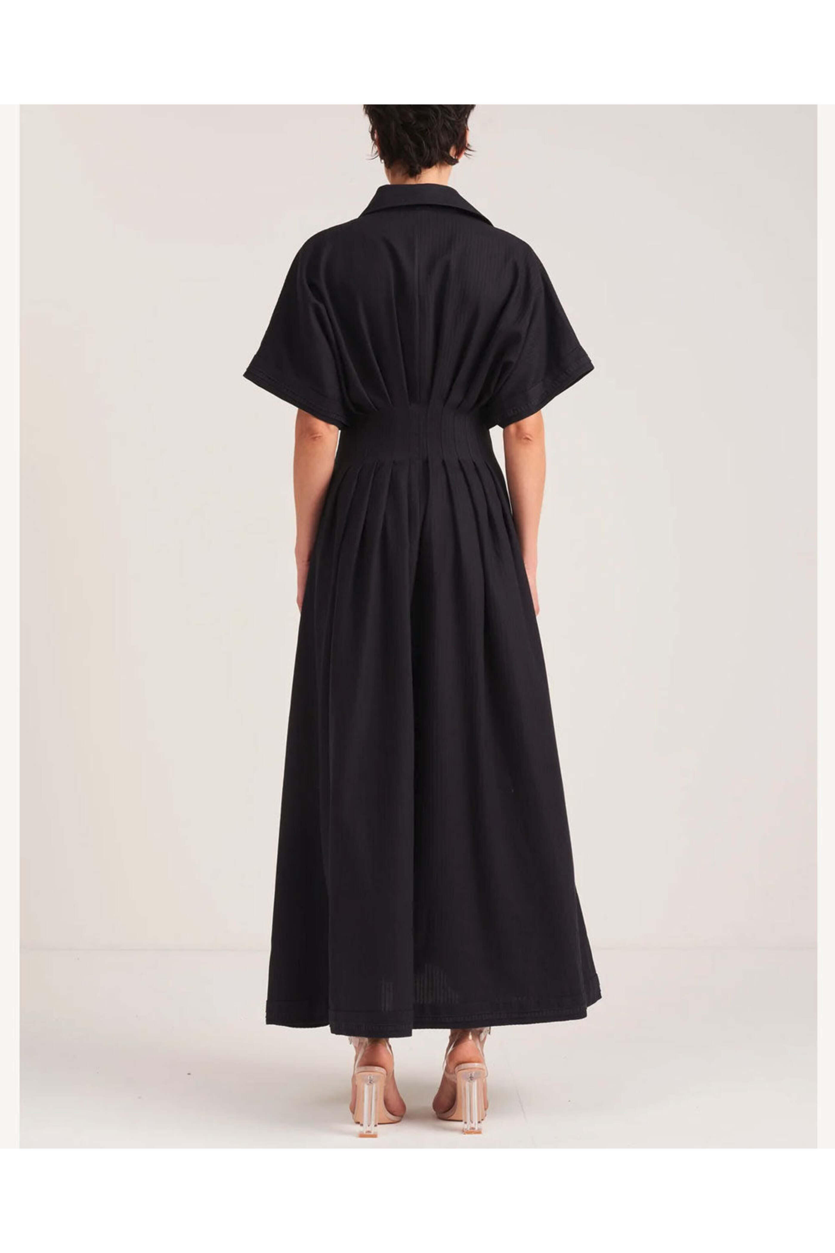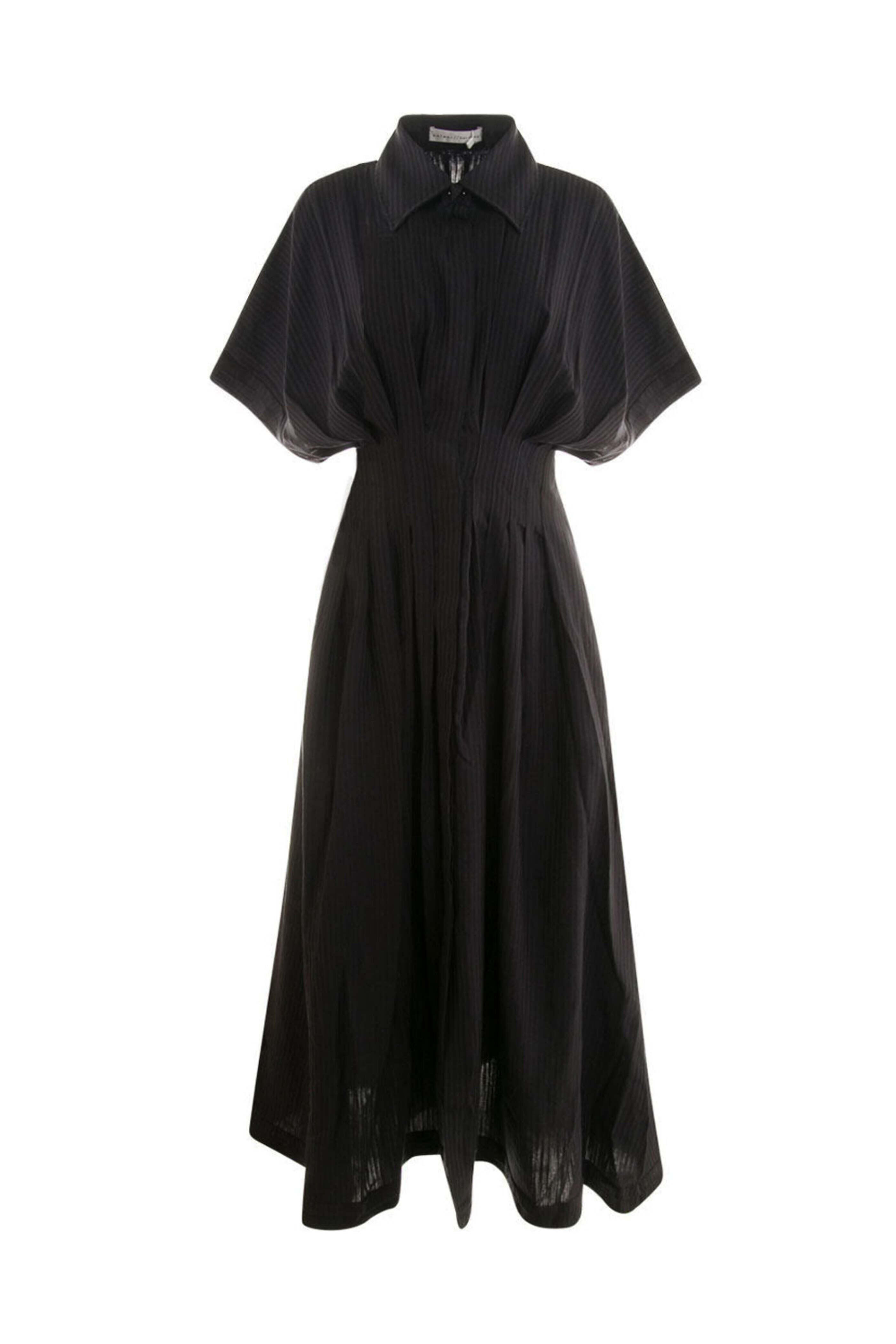 Palmer//Harding Midnight Stripe Courage Dress. Point collar. Short kaftan sleeves. Placket; concealed button down front closure. Gathered waist. Side slip pockets. Pleated detail throughout. Maxi length; layered hem. Shirtdress silhouette. Relaxed fit. 44% Tencel, 32% Cotton, 12% Linen, 12% Viscose.