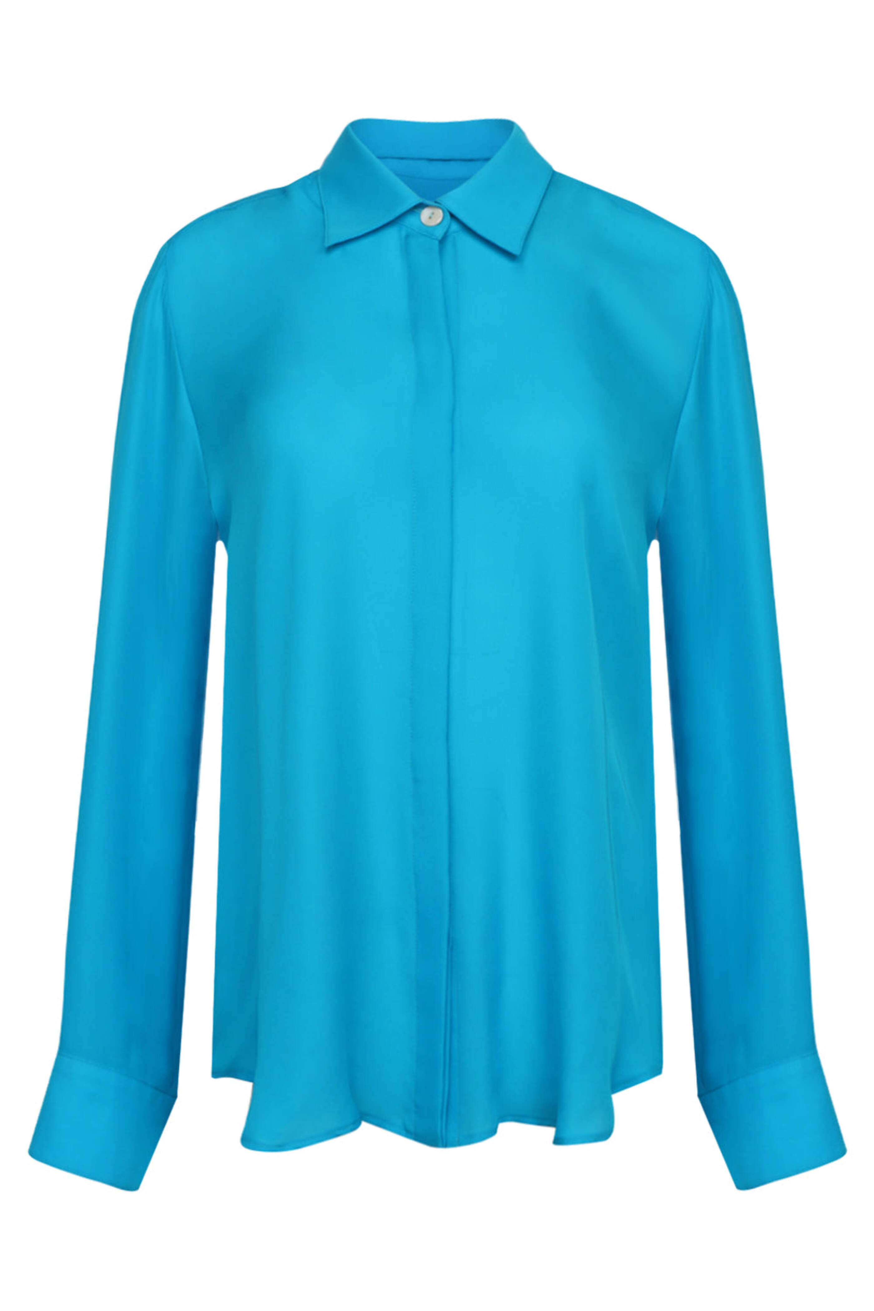 Catherine Regehr Turquoise Marmalade Jane Shirt. Collar. Long sleeves; button cuffs. Concealed button down front closure. Rounded high low hem. Made in Canada. 100% silk.