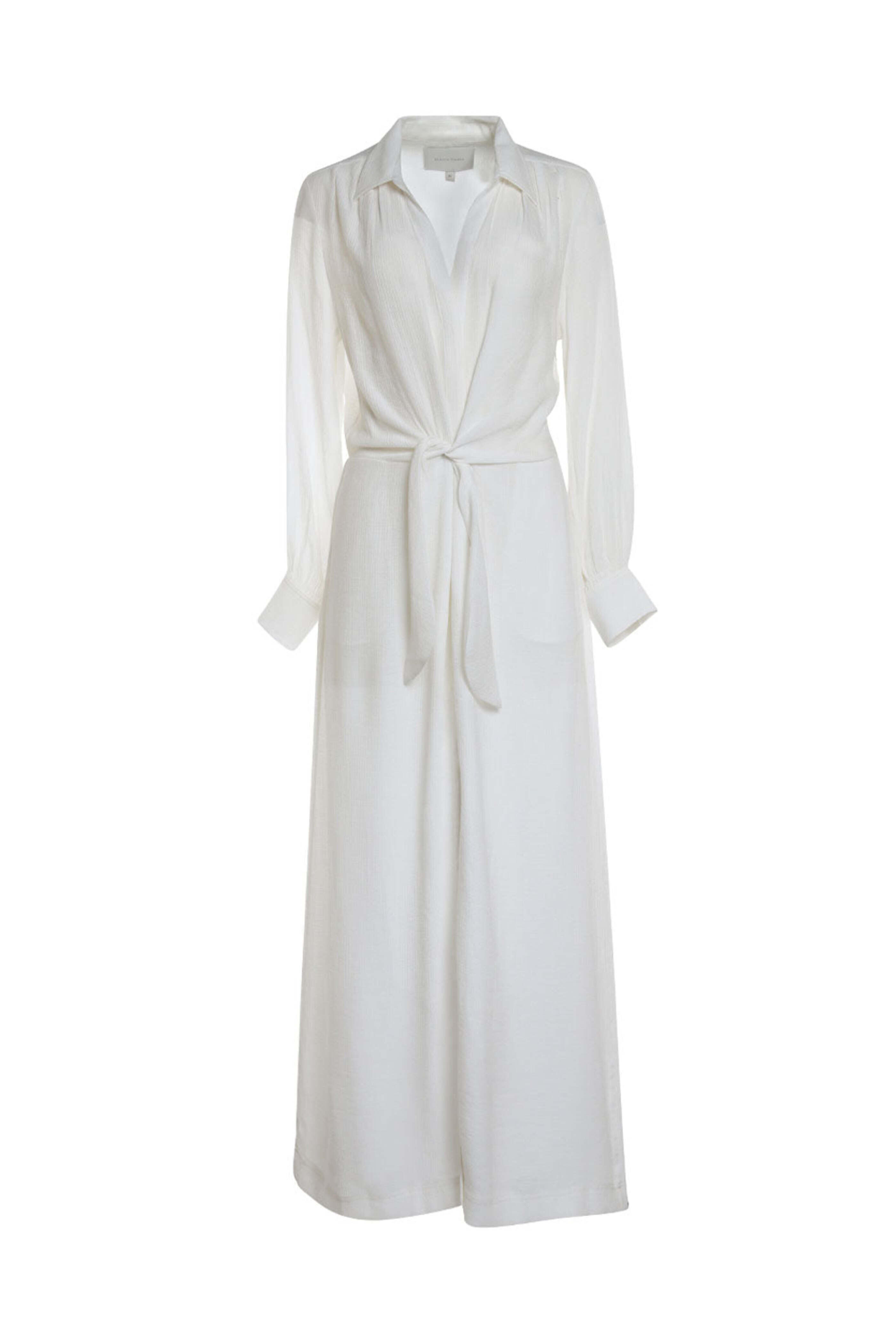 Brochu Walker Salt White Madsen Maxi Dress. Collar. V neck. Long sleeves; button cuffs. Concealed button down front closure. Twist front detail. Maxi length. Crinkle fabrication. 100% polyester outer 1, 100% silk outer 2.