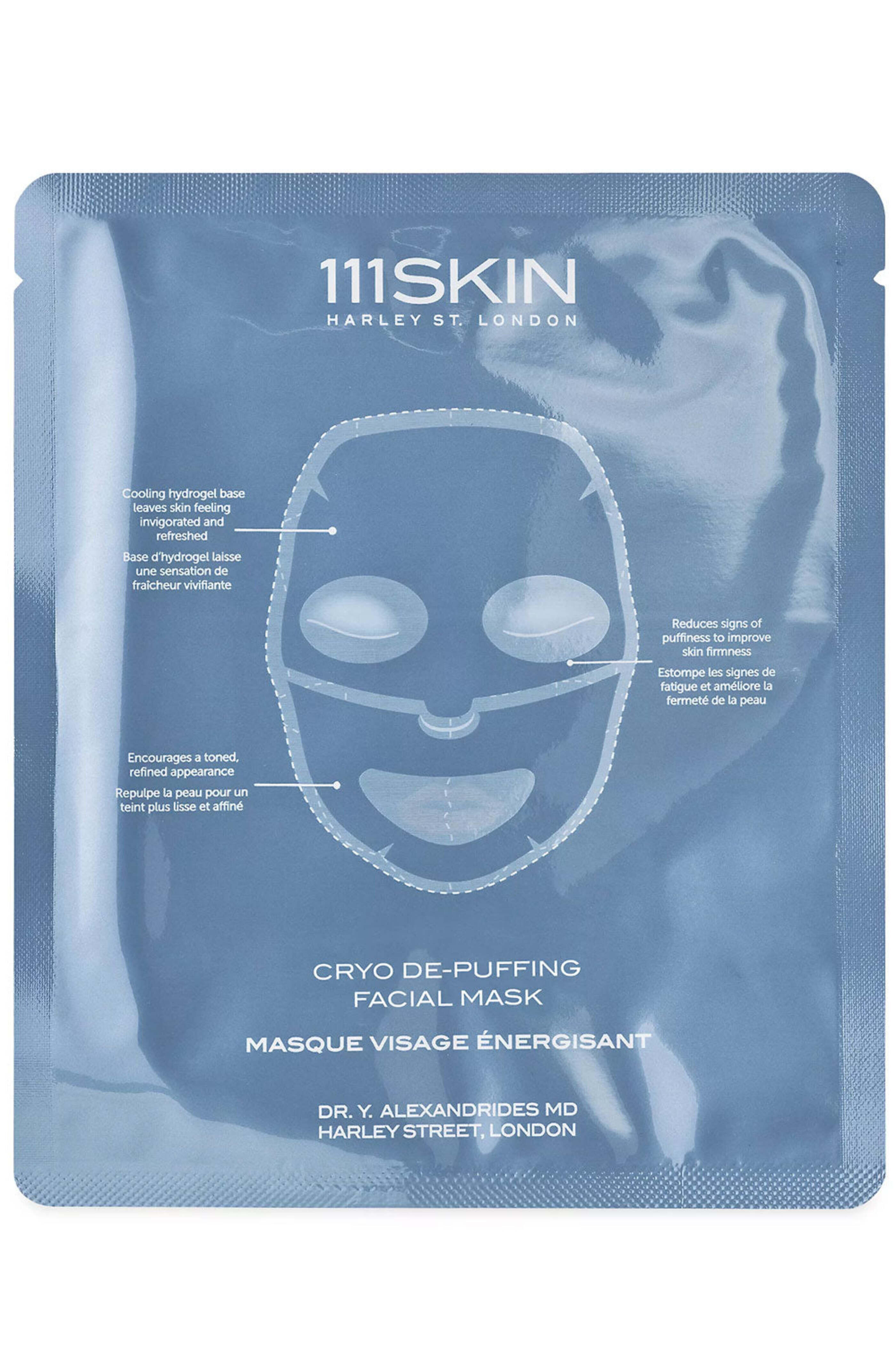111skin Cryo De-Puffing Facial Mask. Set of 5. Sub-Zero De-Puffing Energy Mask. Full face hydrogel mask formulated to alleviate signs of puffiness and fatigue. Infused with peptides, enzymes and caffeine, the multi-functional formula includes a powerful tetrapeptide to help reduce puffiness, hydrate and tighten, leaving the complexion looking refreshed and reinvigorated. Cleanse skin thoroughly, then remove Mask 1 from protective film and apply onto the top half of the face. Follow with Mask 2* and apply onto the lower half of the face. Leave on for 20 minutes. Remove the mask and let the skin absorb the remaining essence by gently patting the skin, then follow with your regular skincare regime. For optimum results, use 3 times a week. *Masks can be used independently of each other. Suitable for all skin types. Cruelty-free. Free of Paraffin.