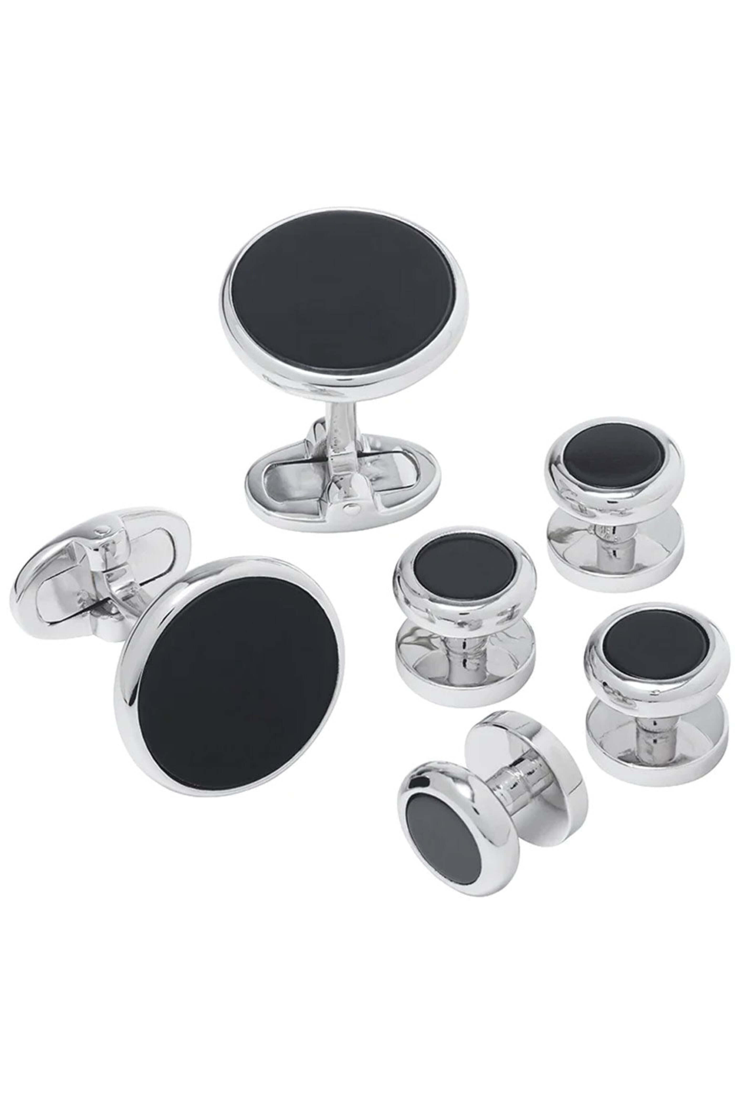 Jan Leslie Black Onyx Inlay Cufflink and Tuxedo Stud Set. 925 sterling silver. Black onyx. Inlaid black onyx. Cufflinks and tuxedo studs. Classic round silhouette are an effortlessly elegant way to elevate any black-tie look. Features an anti-tarnish rhodium finish that makes for lasting wear.
