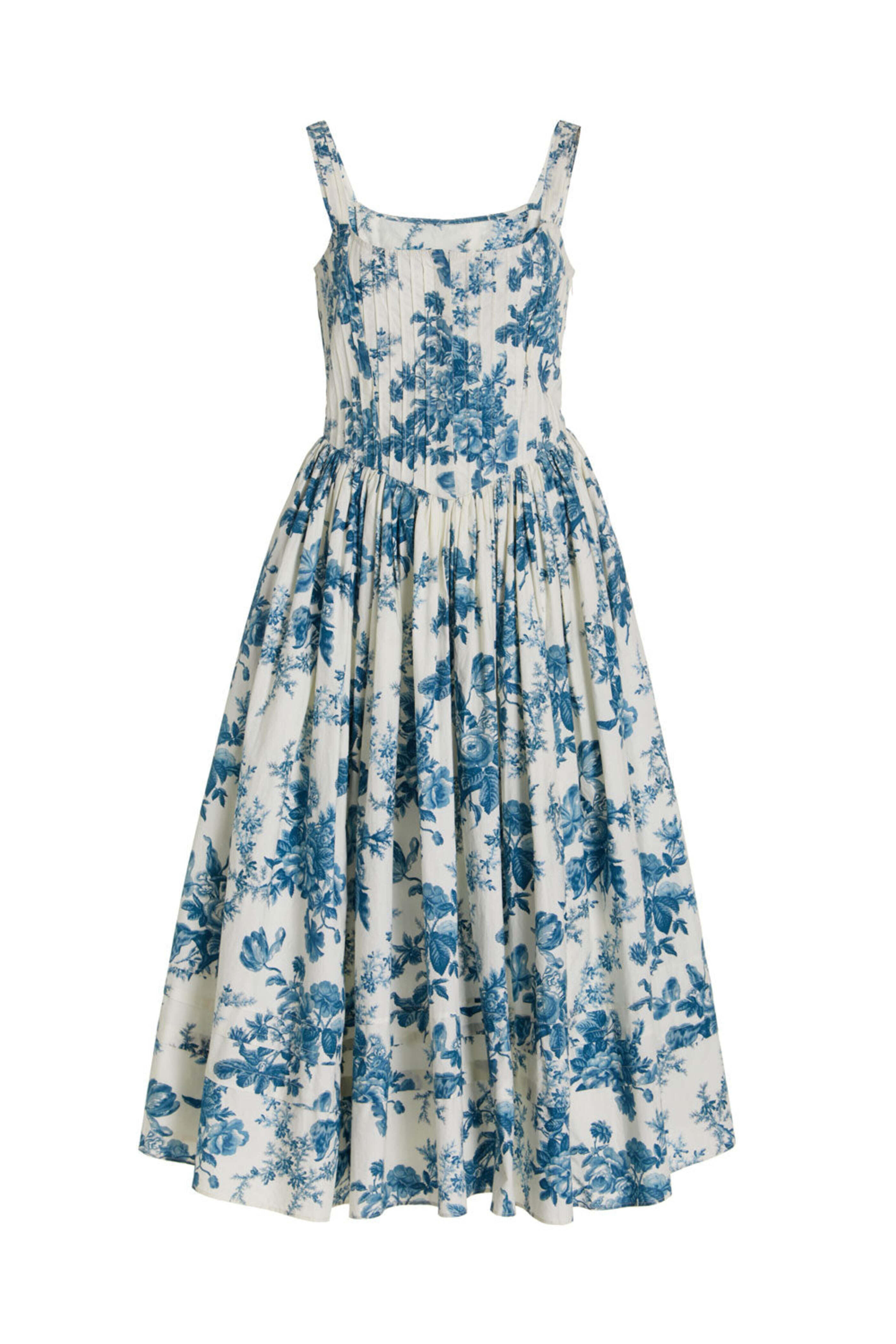 LoveShackFancy Blue China Majory Midi Dress. Square neck. Sleeveless; thick shoulder straps. Fitted bodice; pintuck detail. Button front placket. Corset style v waistline. Side zip closure. Side slip pockets. Full skirt. Midi length. Lined. 100% outer and lining.