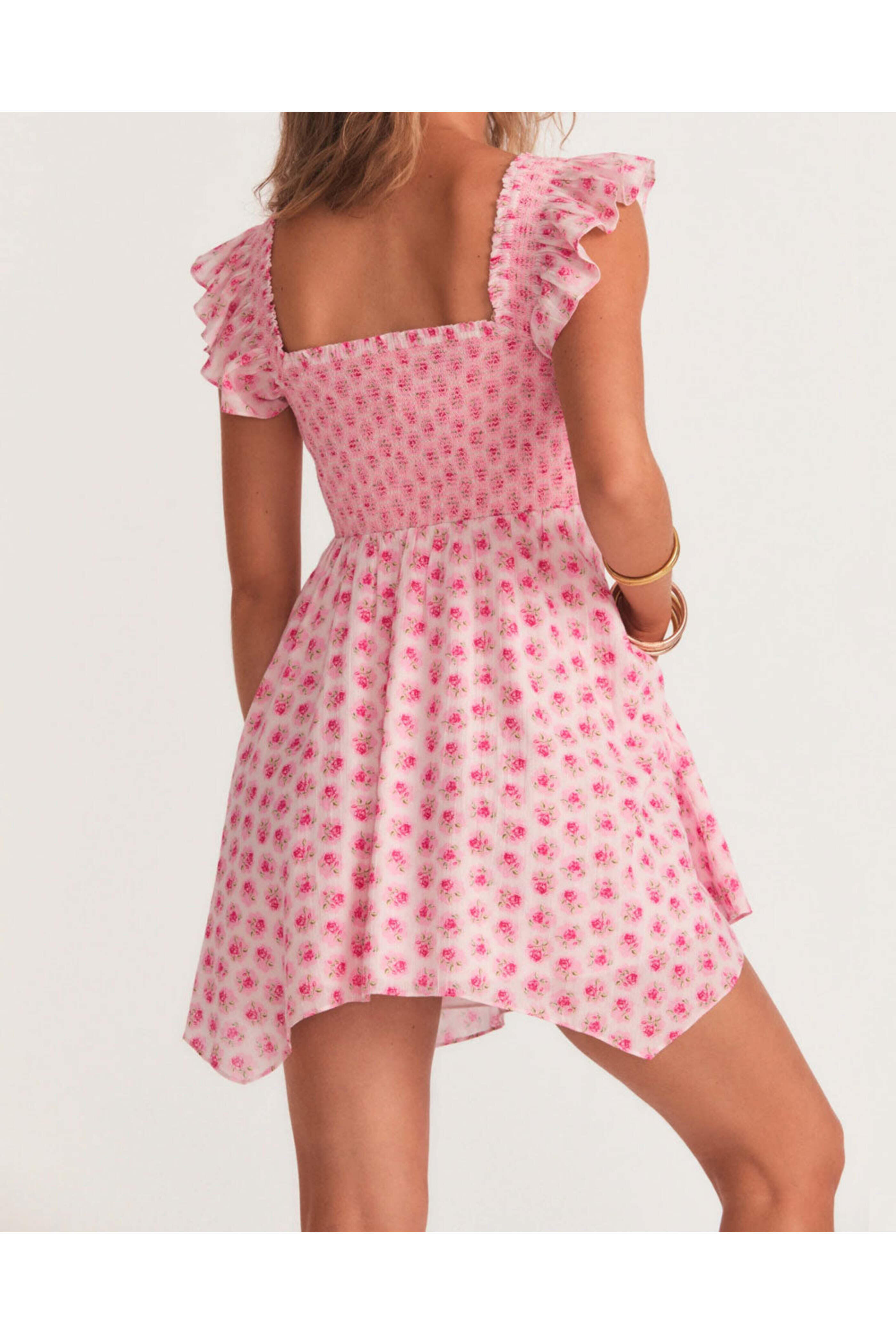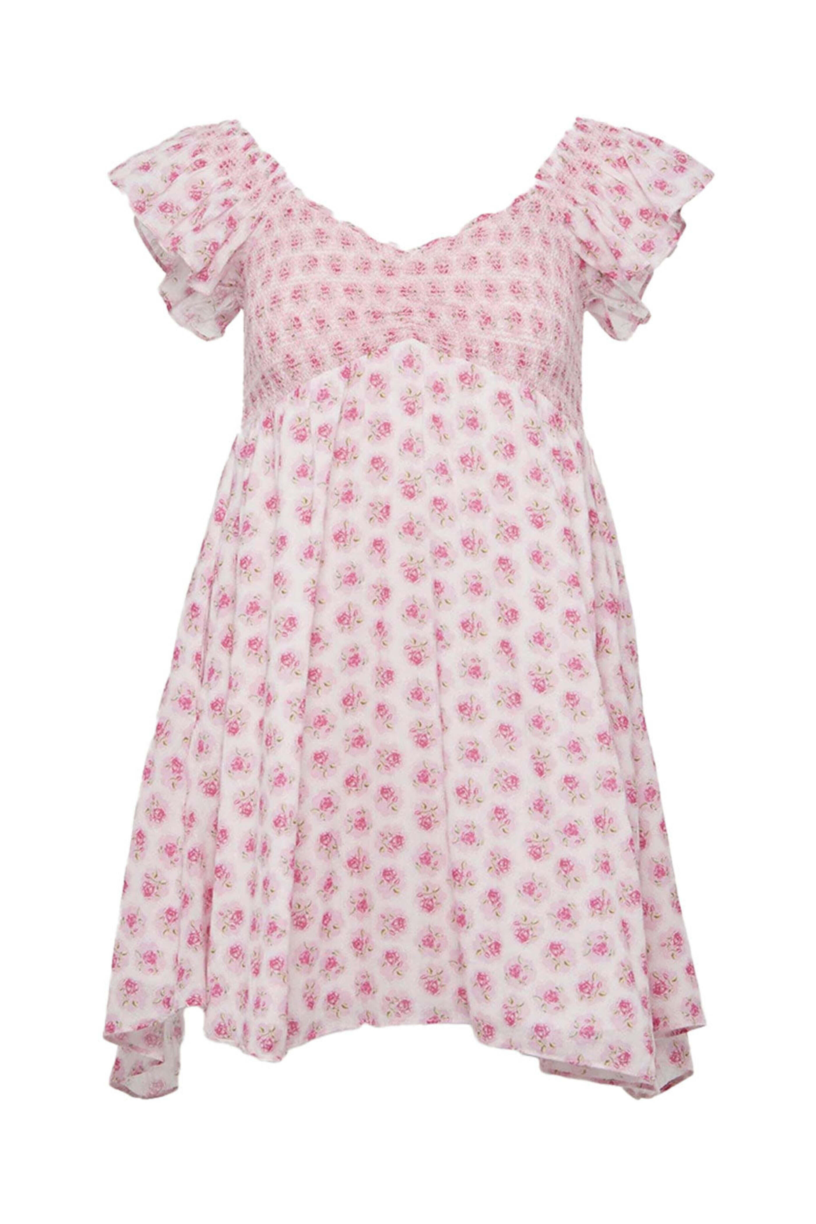 LoveShackFancy Pink Divine Athalia Dress. Sweetheart neck. Short flounce sleeves. Smocked bodice. Asymmetric hem. Mini length. Partially lined. 100% cotton outer, 100% cotton lining.