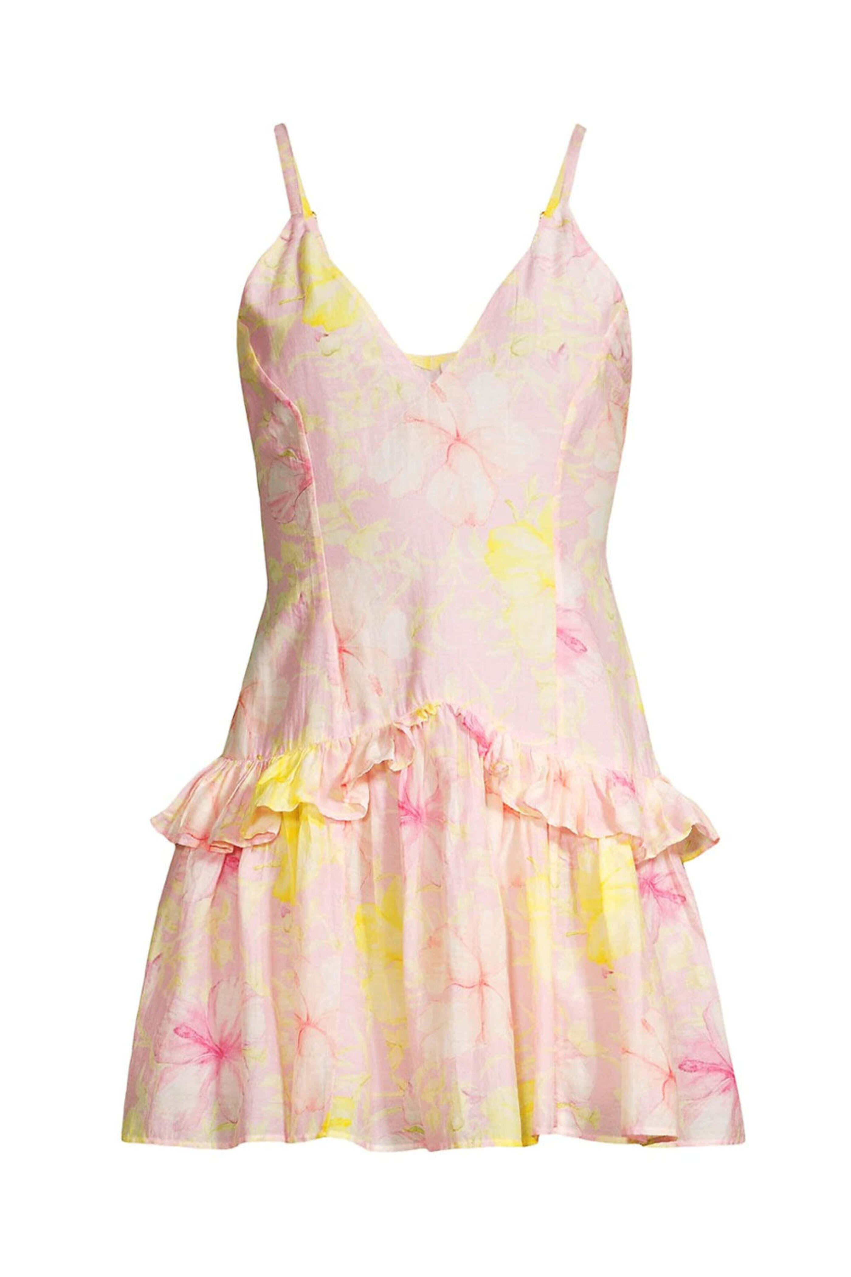 LoveShackFancy Light Berry Tea Fabienne Dress. V neck. Sleeveless. Adjustable shoulder straps. Ruffle detail at waist. Side zip closure. Flounce hem. Mini length. Partially lined. 70% cotton, 30% silk outer; 100% cotton lining.