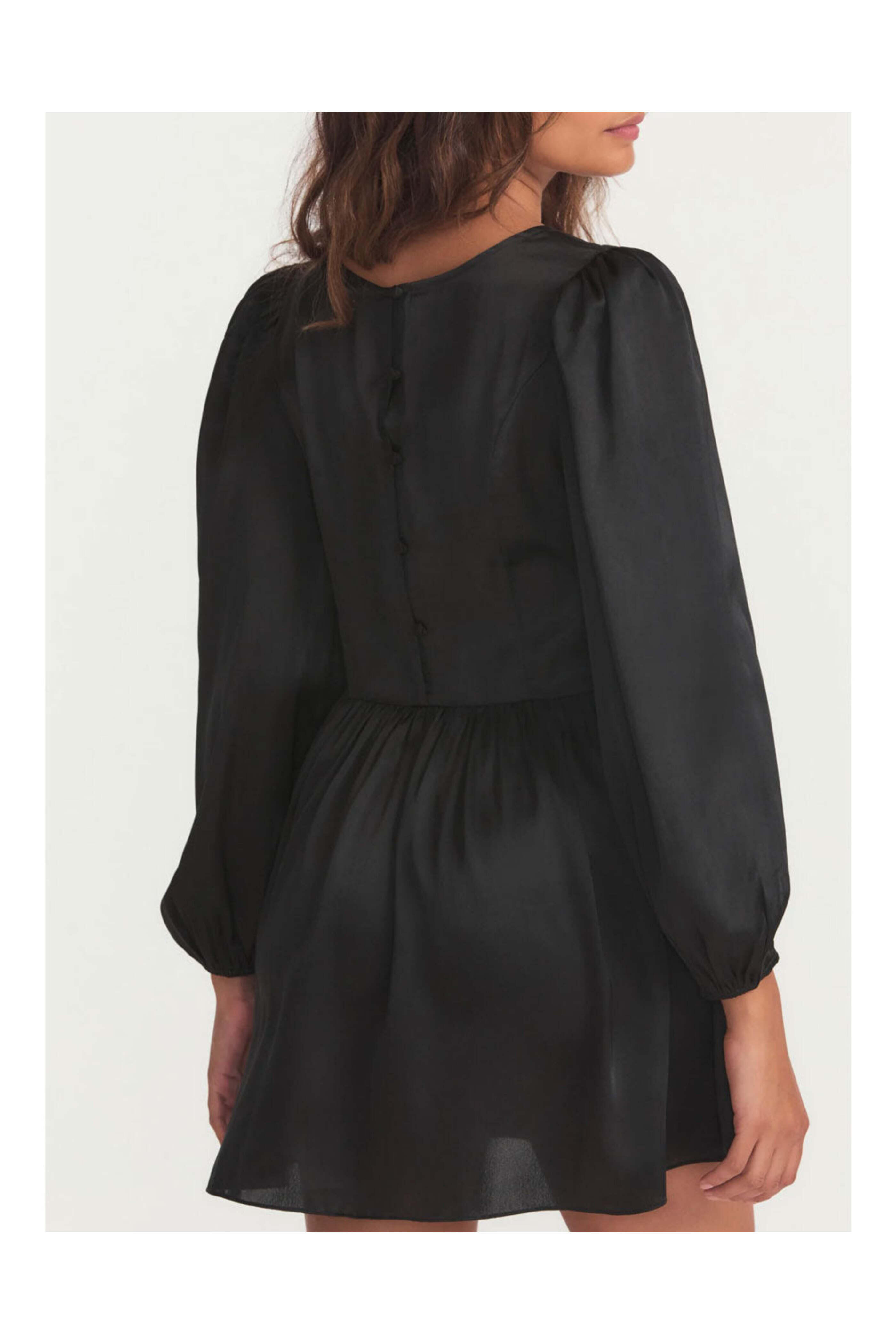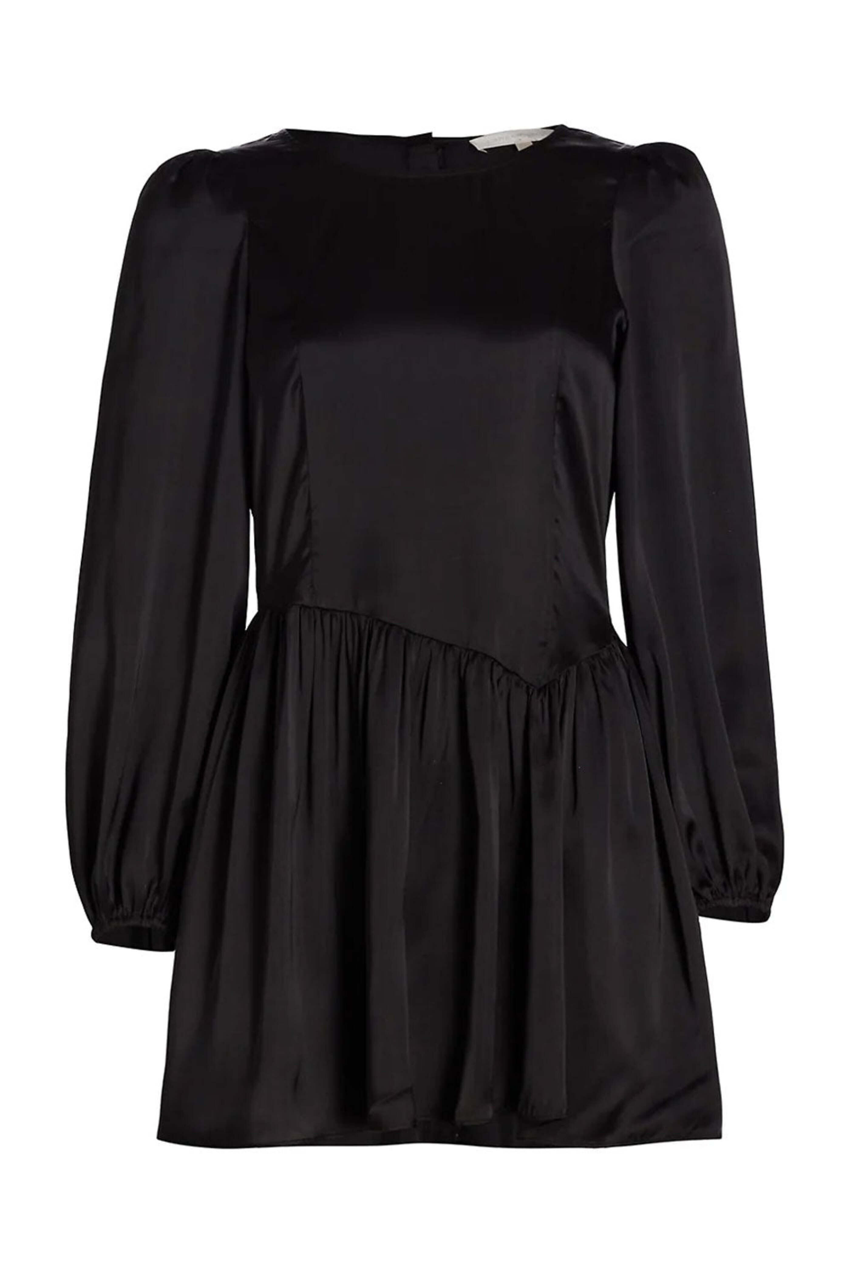 LoveShackFancy Black Garcia Satin Mini Dress. Round neck. Long blouson sleeves; elastic cuffs. Back keyhole cutout detail; button up closure. Asymmetric seam at waist. Flared skirt. Mini length. Fit and flare silhouette. Satin fabrication. 100% recycled polyester.