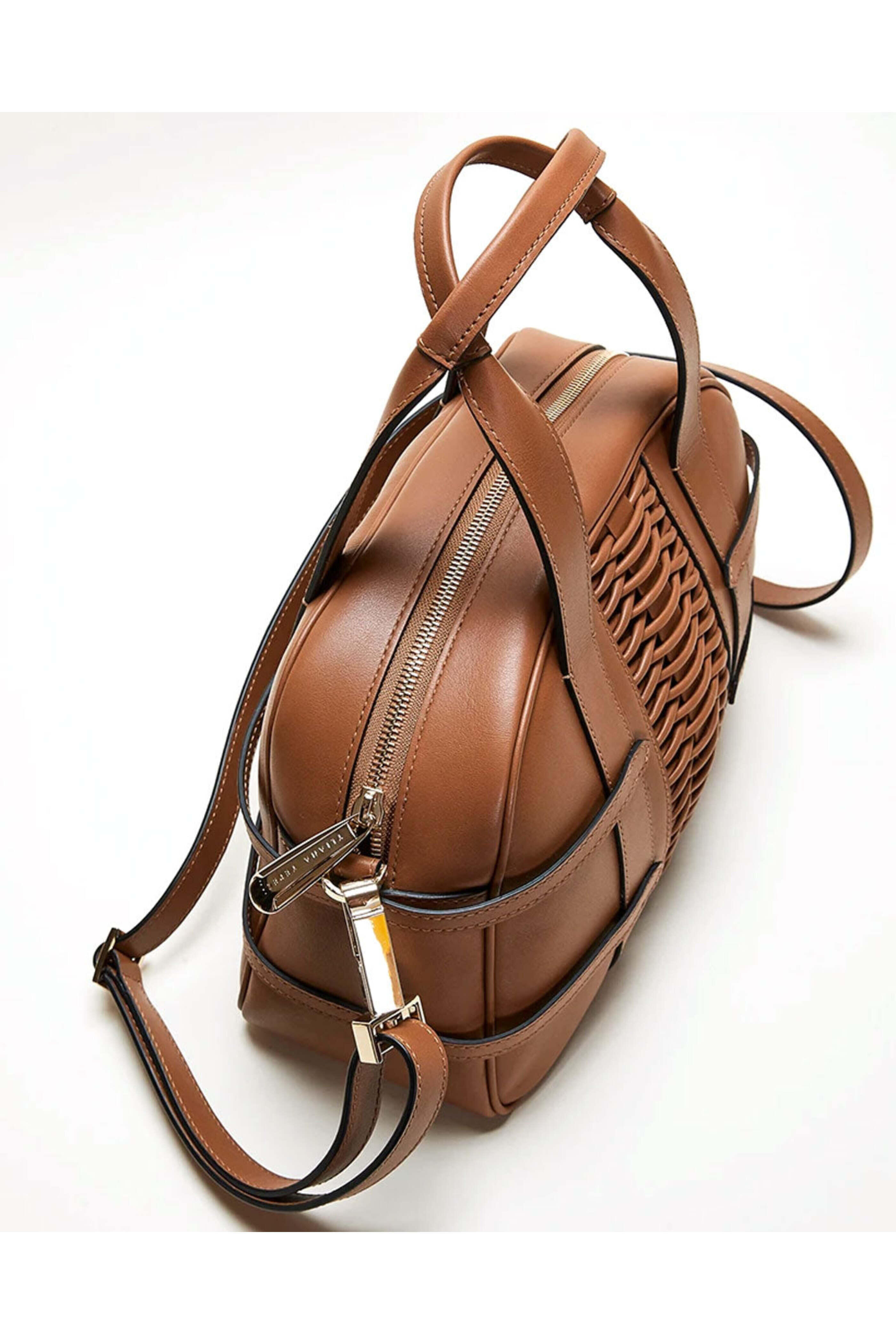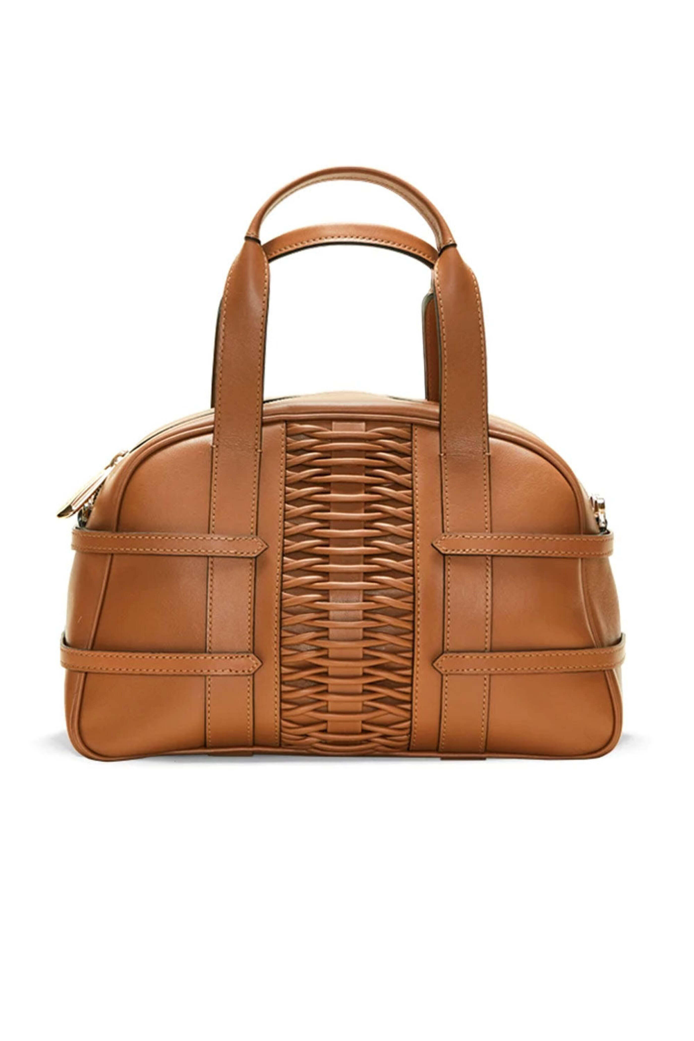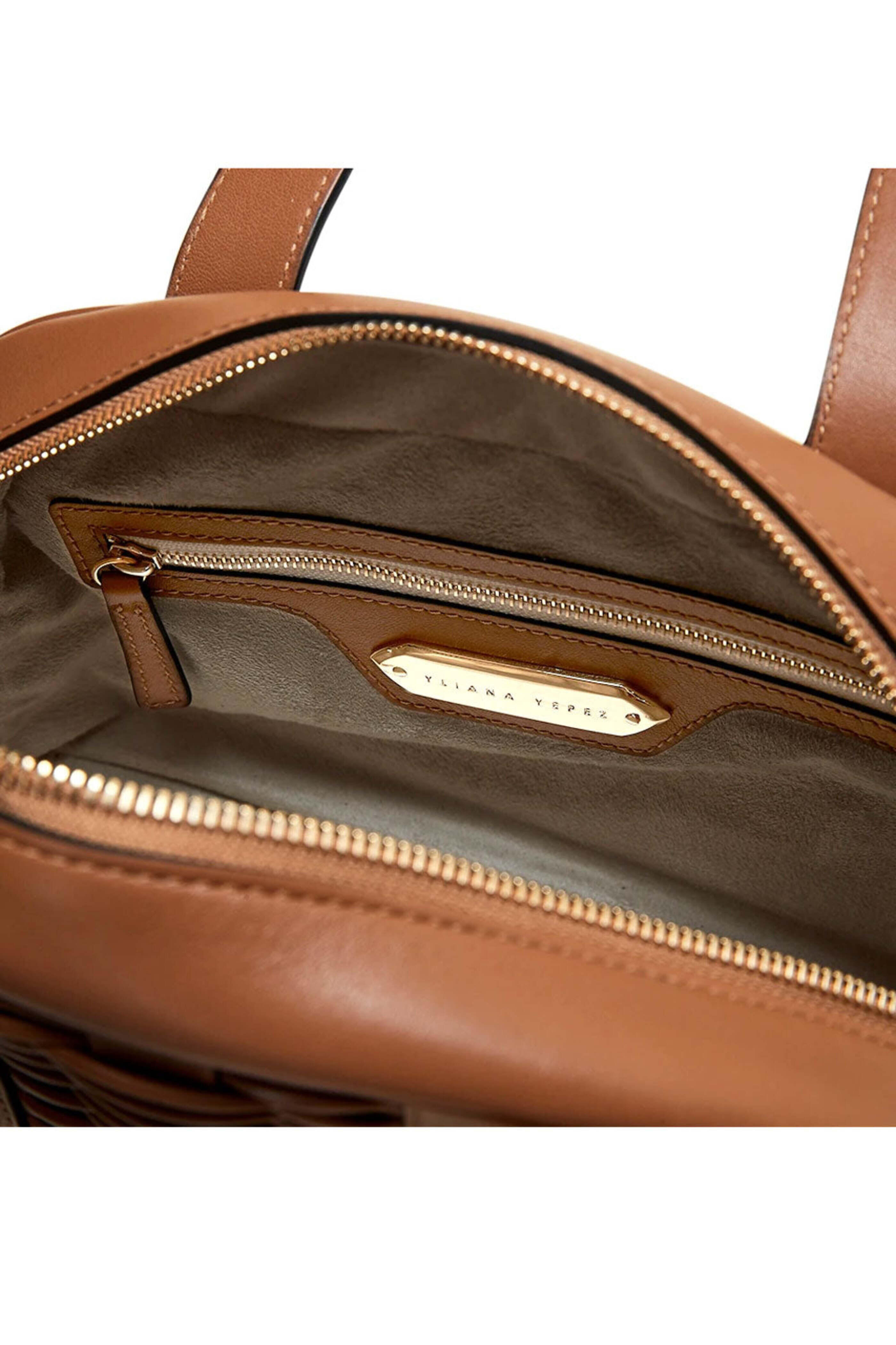 Yliana Yepez Camel Francesca Medium Satchel. Braided calf leather. Gunmetal hardware. Top handles, 5.5'' Drop. Detachable and adjustable cross-body strap. Custom engraved dog clips. Internal YY logo plaque. Internal zipped pocket. Top zipper fastening. Fabric lining. Dimensions: 8'' Height x 12'' Width x 4'' Depth.