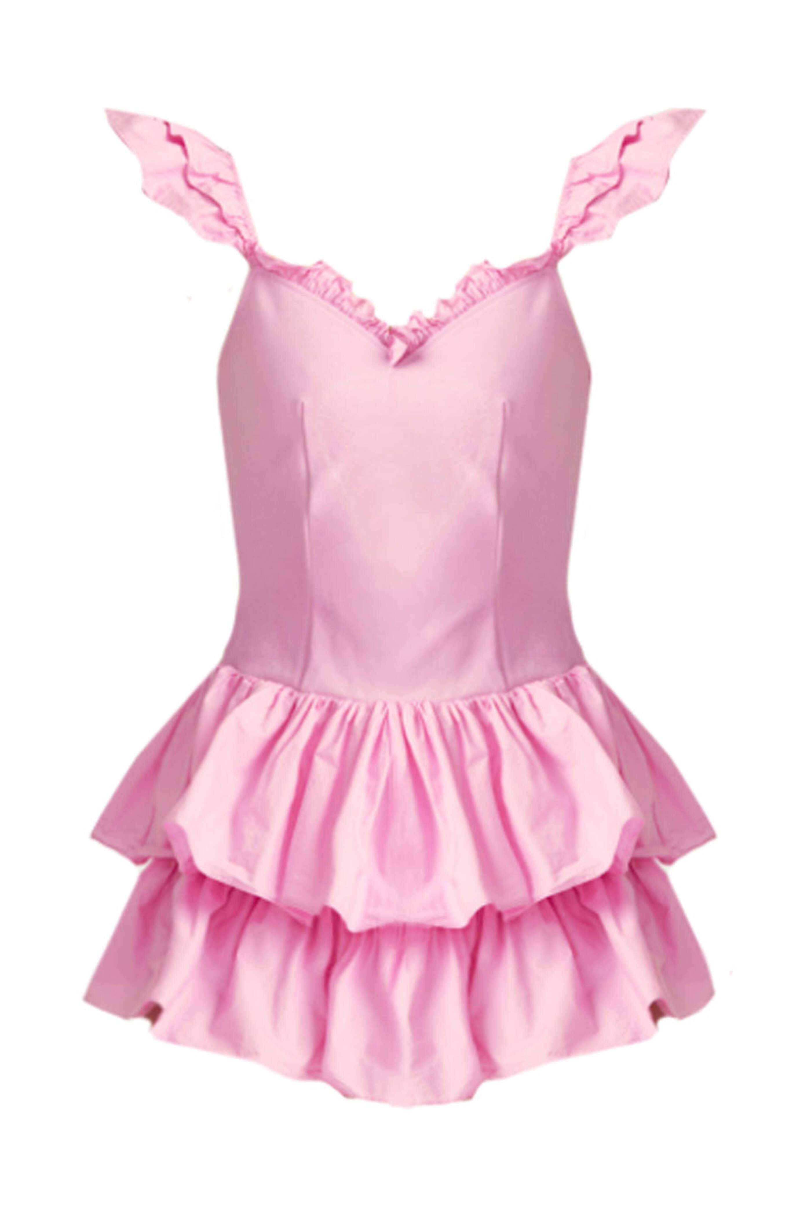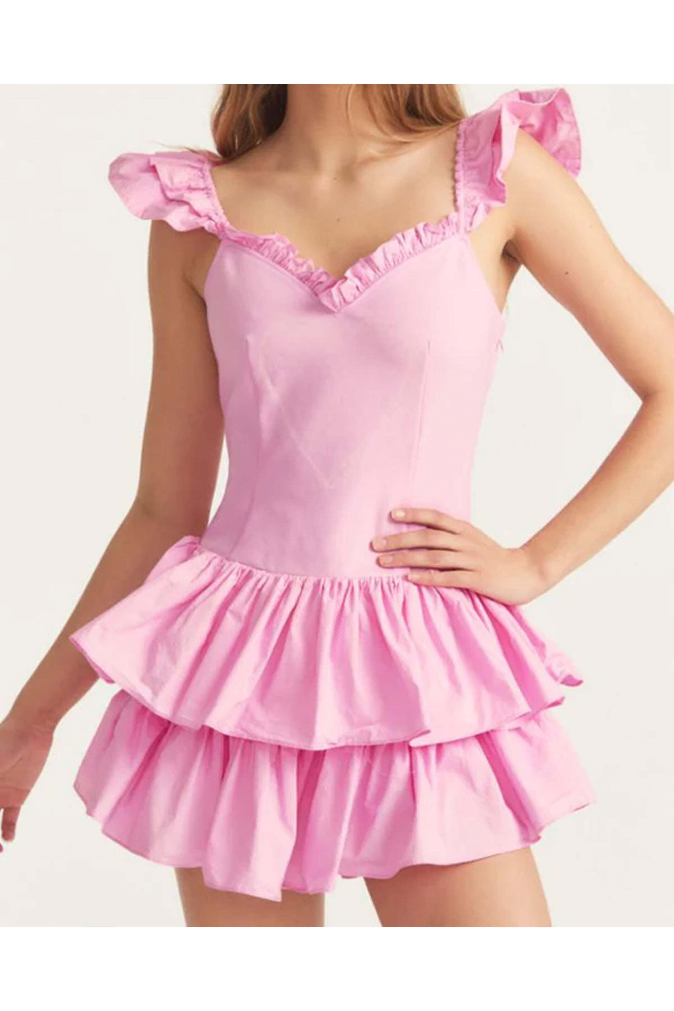 LoveShackFancy Pink Pop Rock Sanam Dress. Sweetheart neck; ruffle detail. Sweetheart back. Sleeveless; ruffle shoulder straps. Princess seam detail. Teired ruffle skirt. Mini length. 67% rayon 29% nylon 4% spandex.