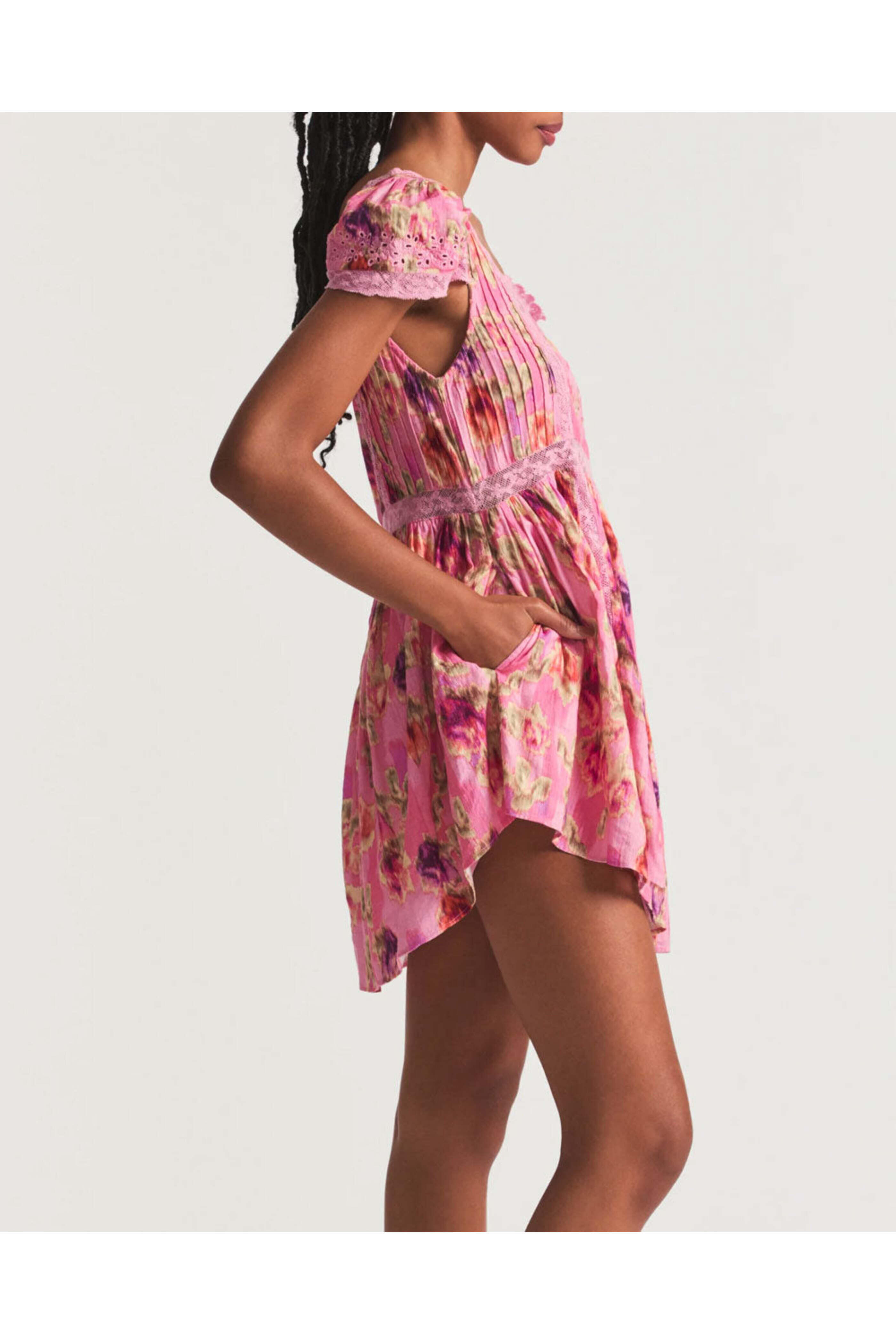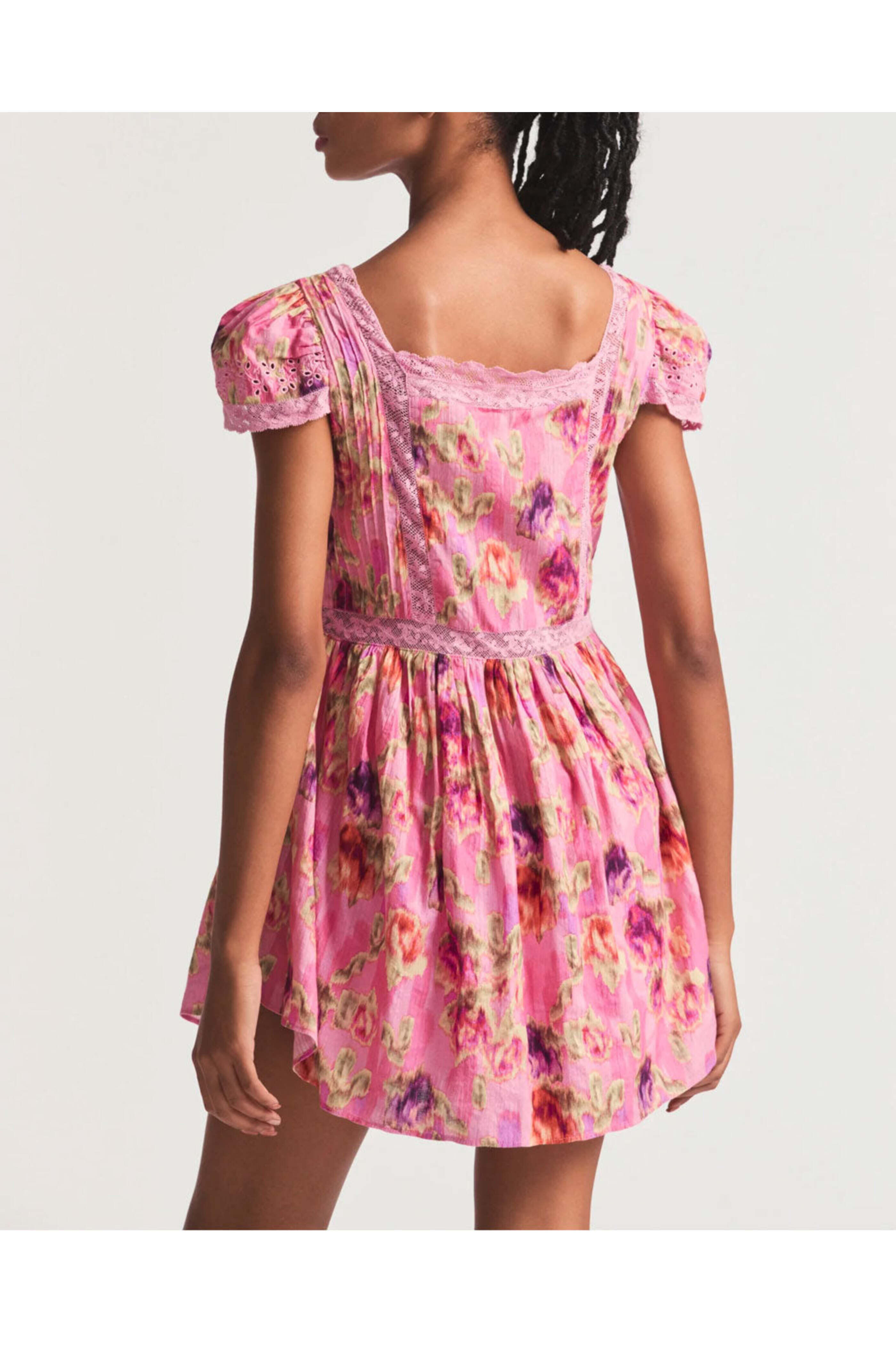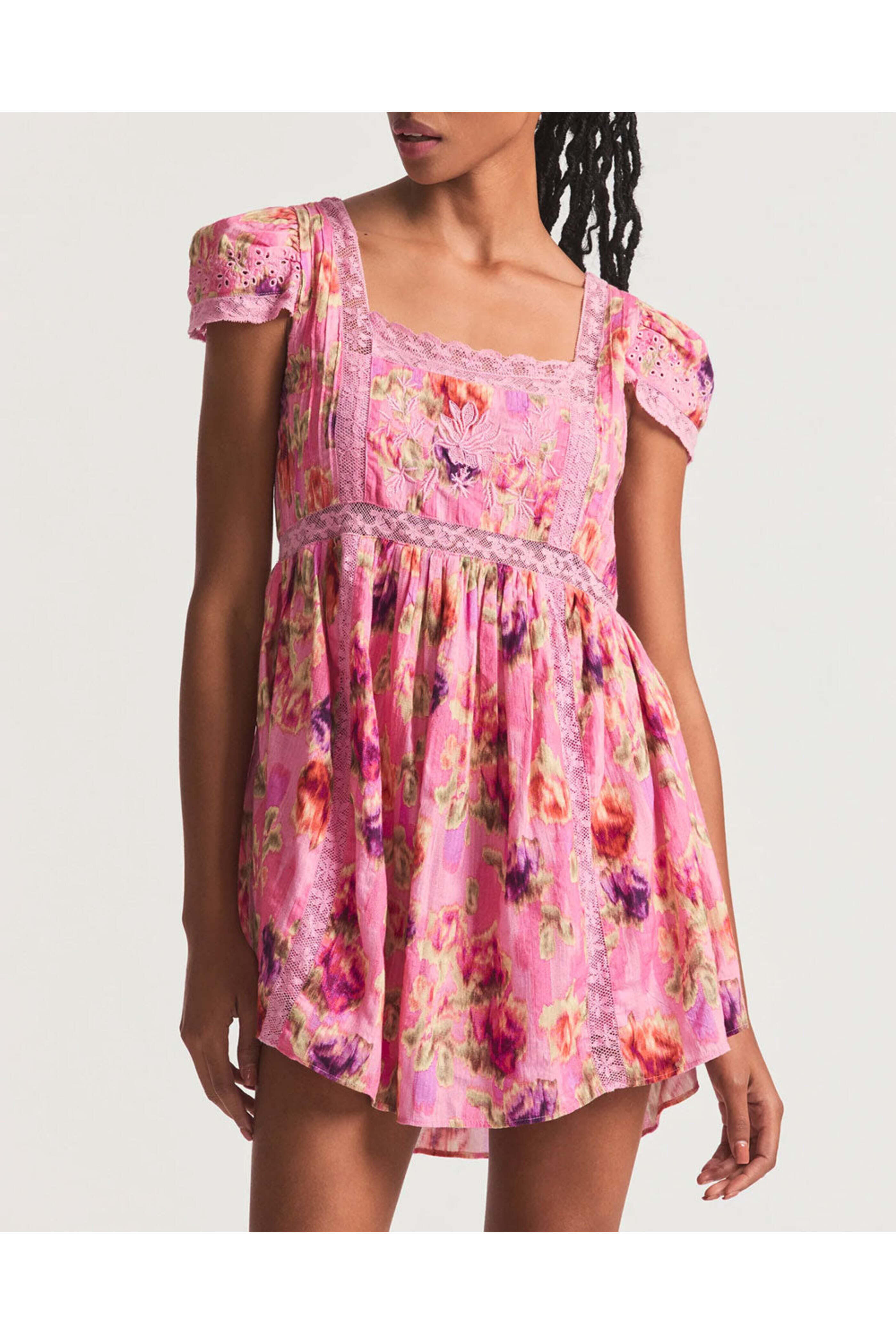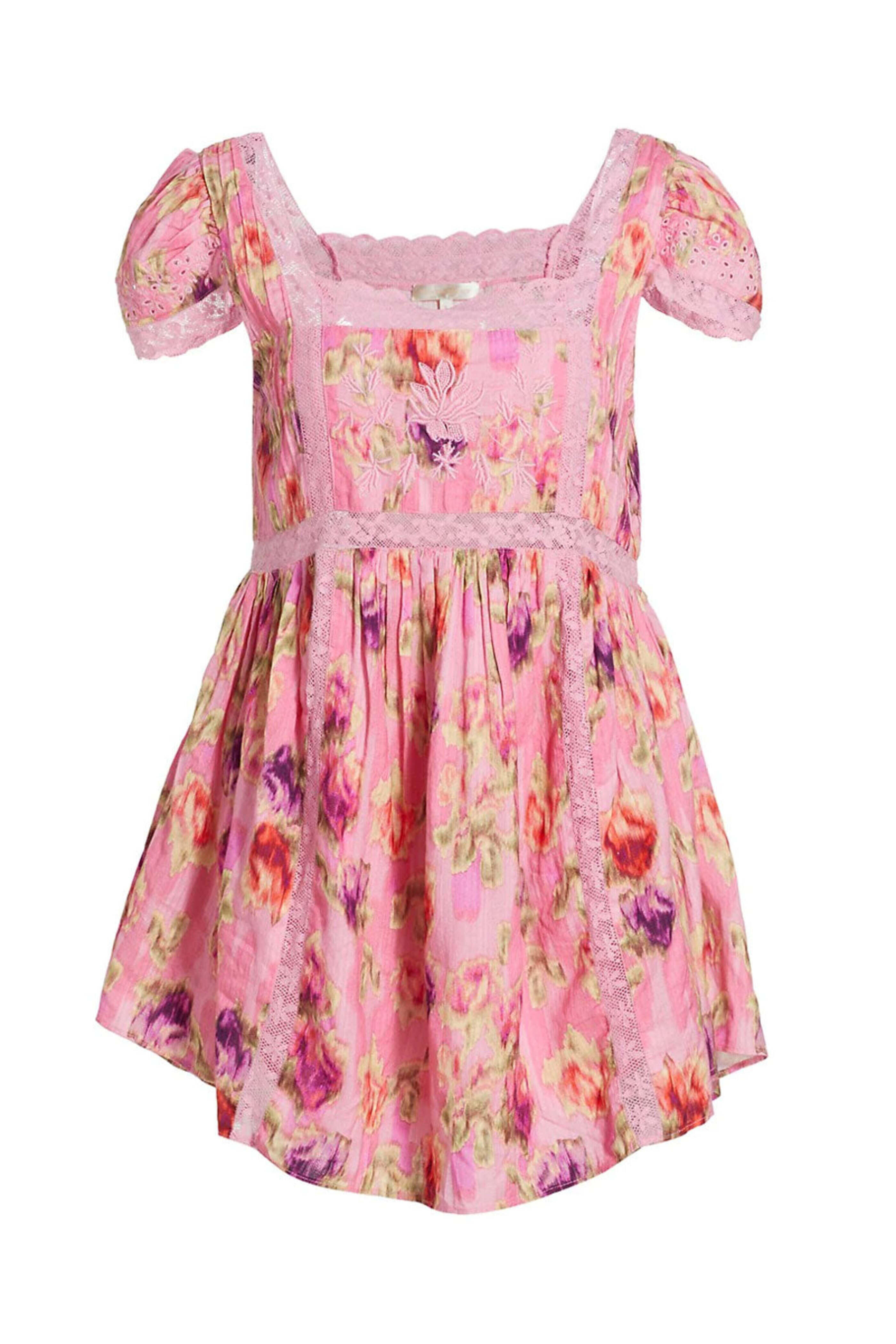 LoveShackFancy Wild Pink Nutmeg Dress. Square neck. Short puff sleeves. Side seam pockets. Lace paneling detail. Mini length; rounded hem. Babydoll silhouette. Relaxed fit. 100% cotton.