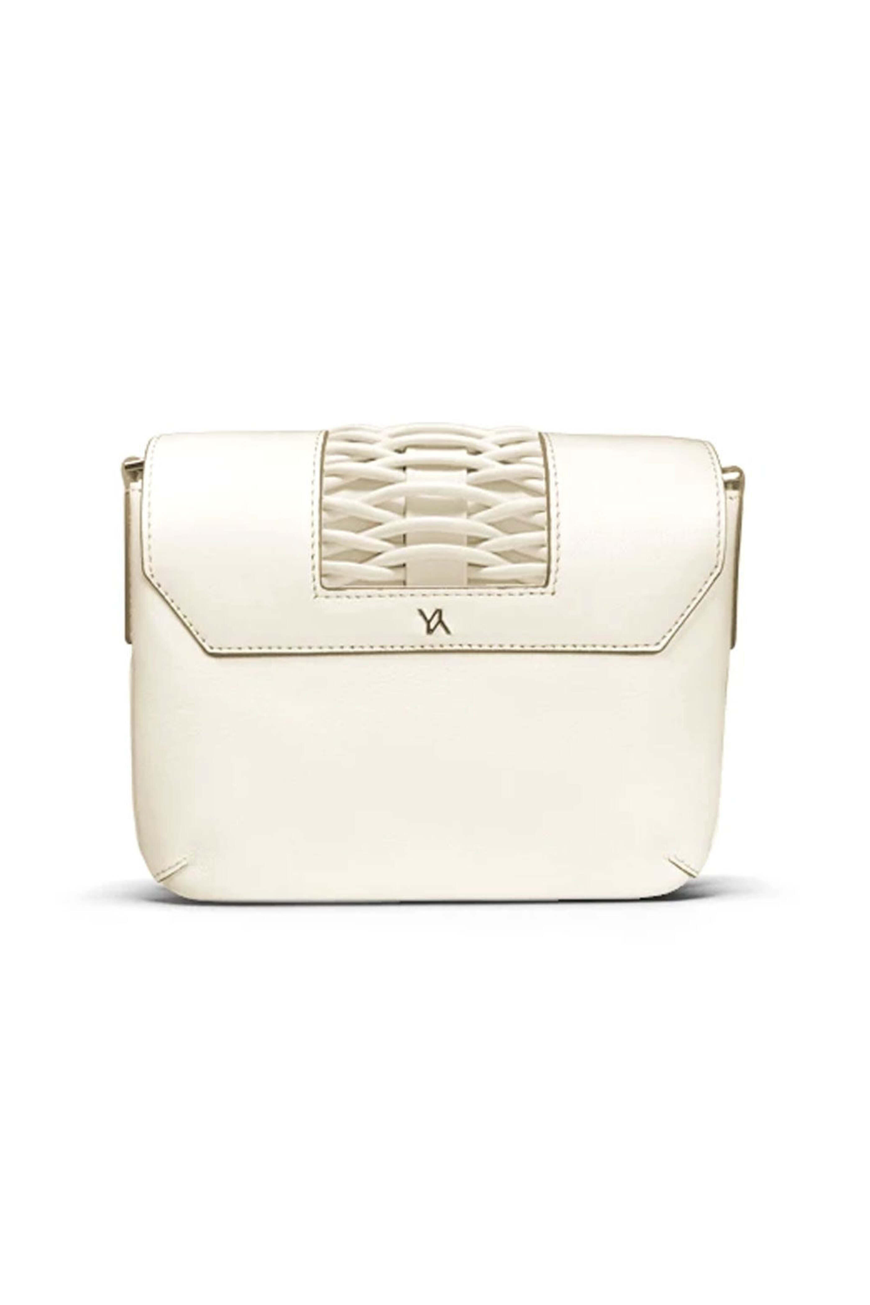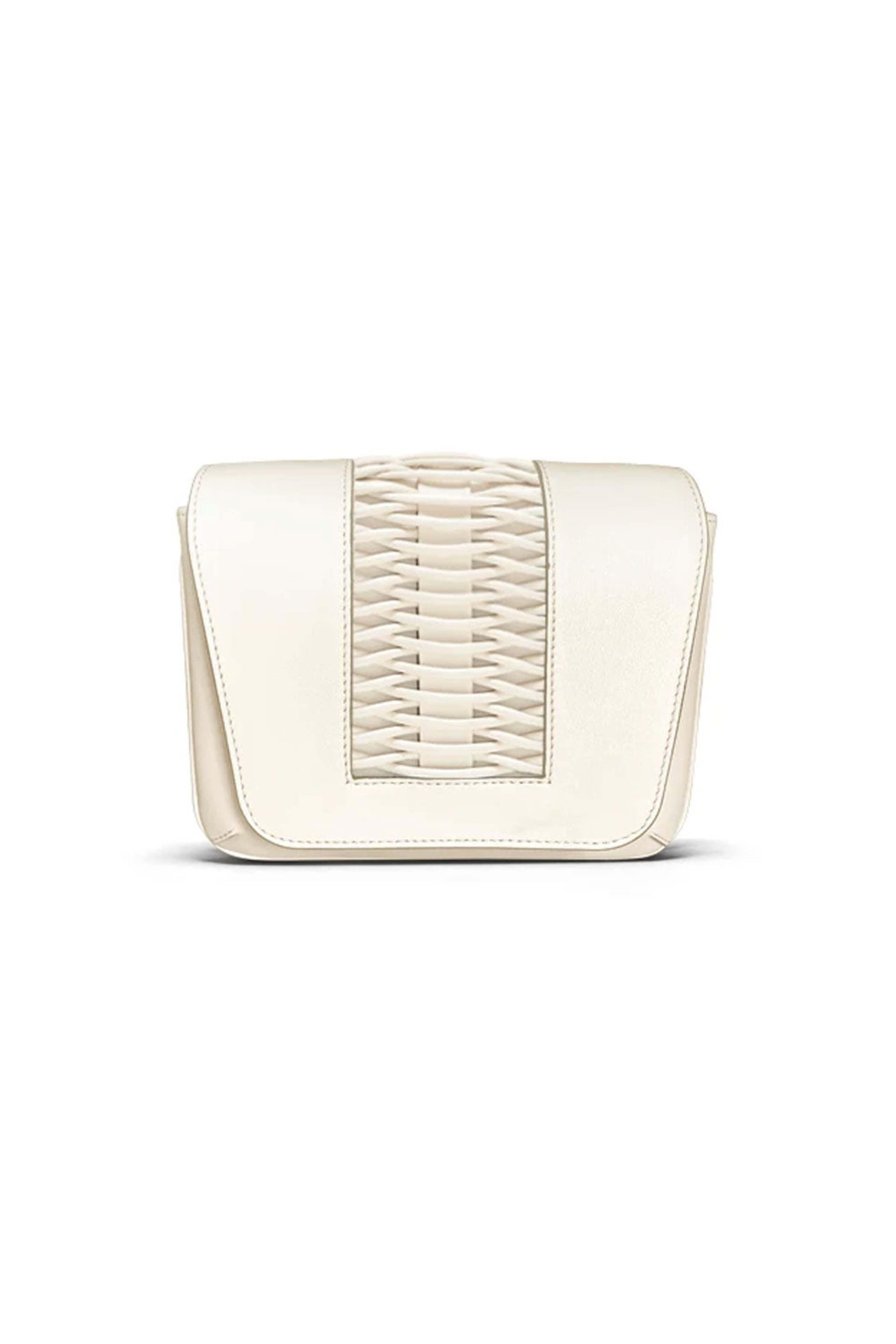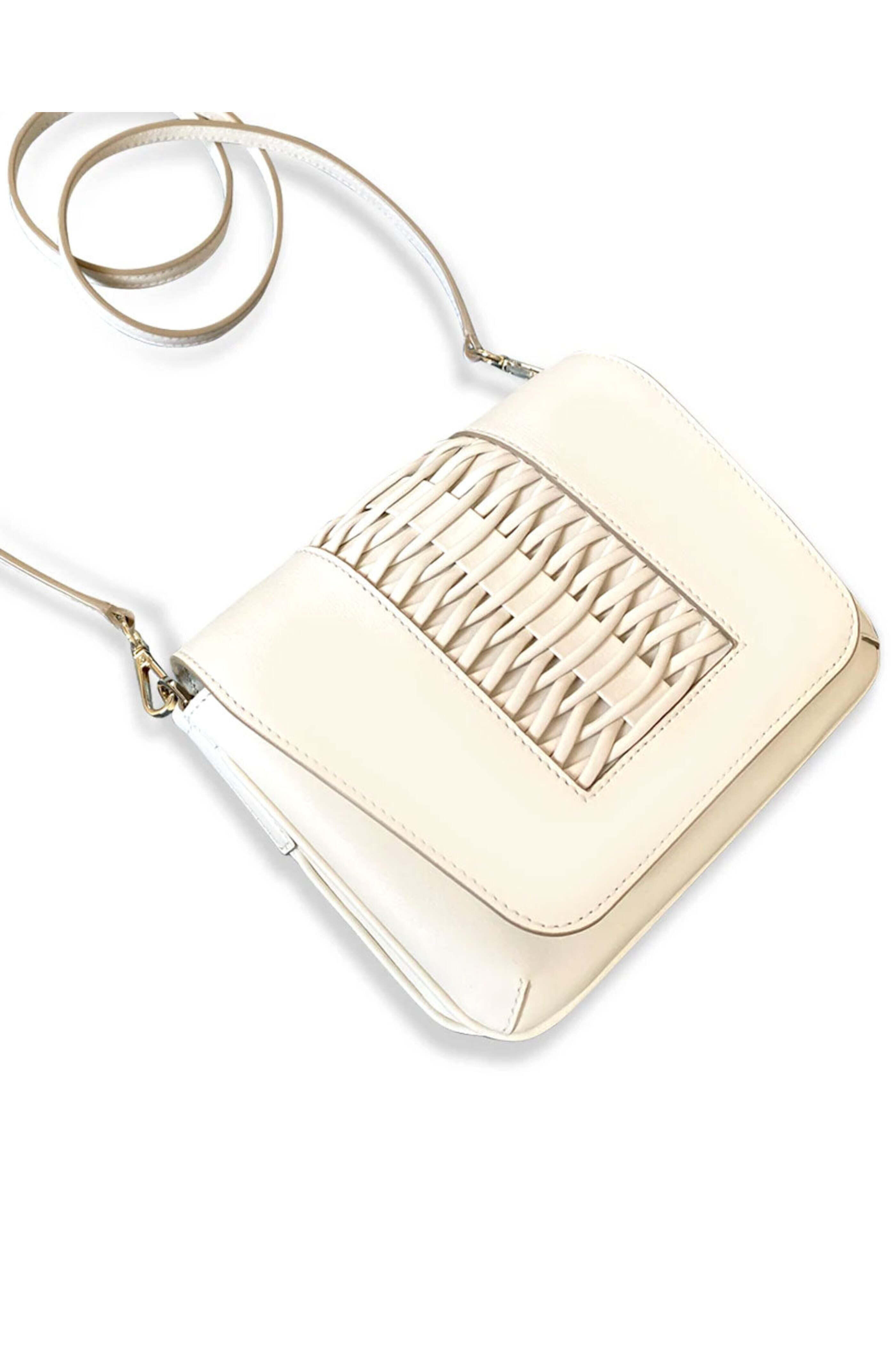 Yliana Yepez Off-White Fabiana Plus Infinito Satchel. Braided calf leather panel. Gold hardware. Magnetic flap closure. Detachable leather cross-body strap, 23.5'' drop. Internal zipped pocket. Internal YY logo patch. Back centre YY logo. Fabric lining. Custom engraved hardware. Dimensions: 6.5" H x 8" W x 2.5" depth.