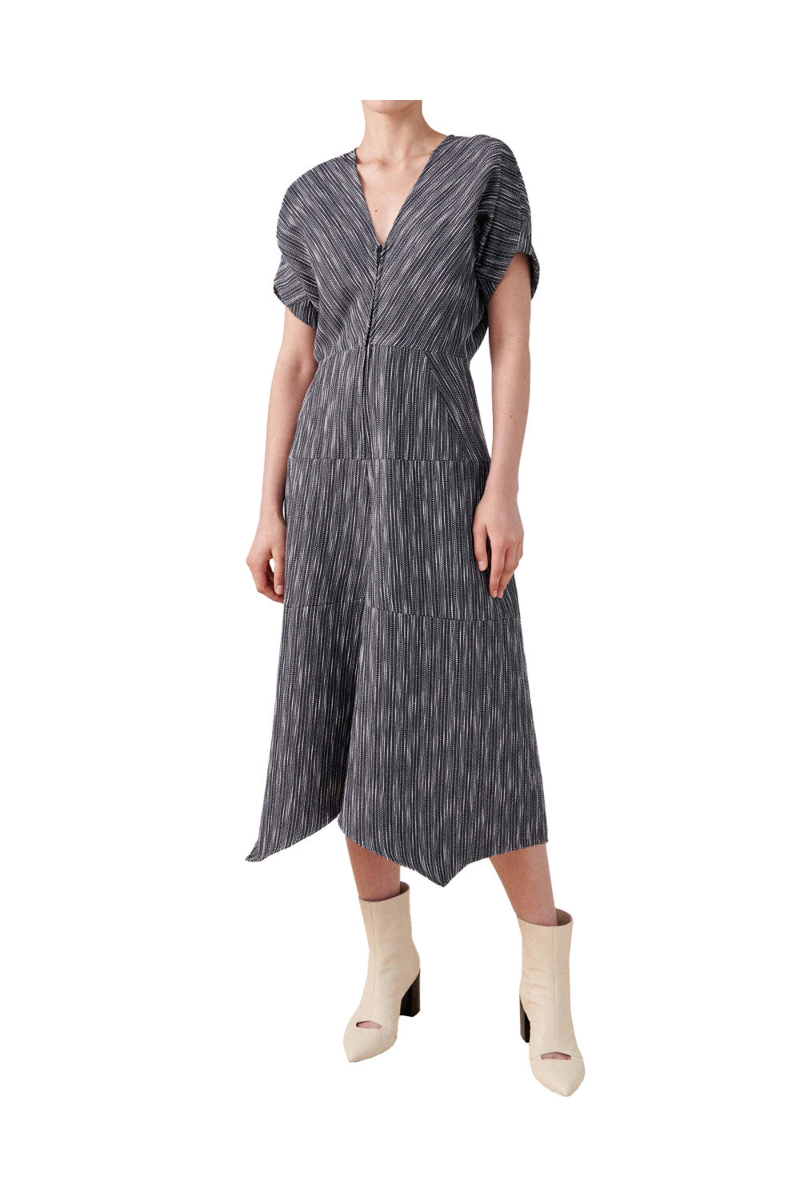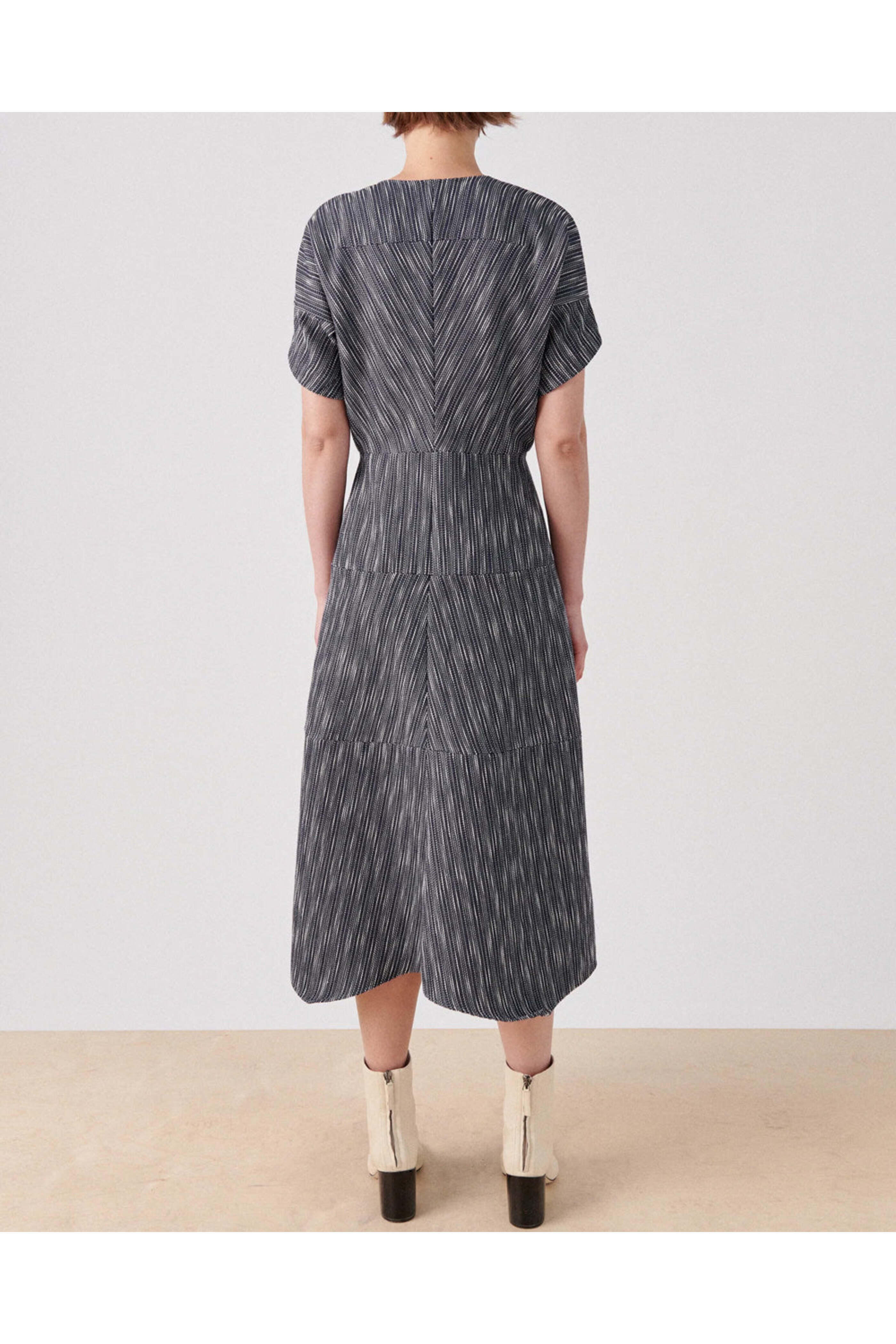 Zero + Maria Cornejo Ink Cotton Tweed Aissa Joi Dress. V neck. Short sleeves. Front zip closure. Tiered seam detail. Midi length. Asymmetrical hem. Tweed fabrication. Made in NY. 52% organic cotton, 36% recycled polyester, 12% polyamide.